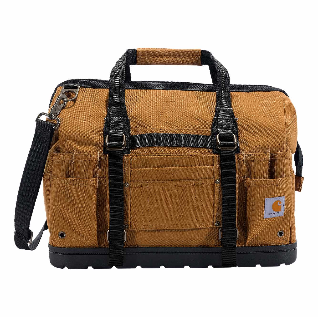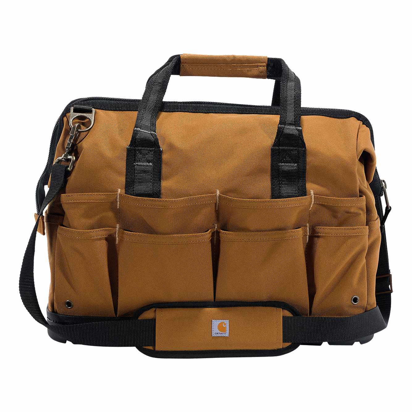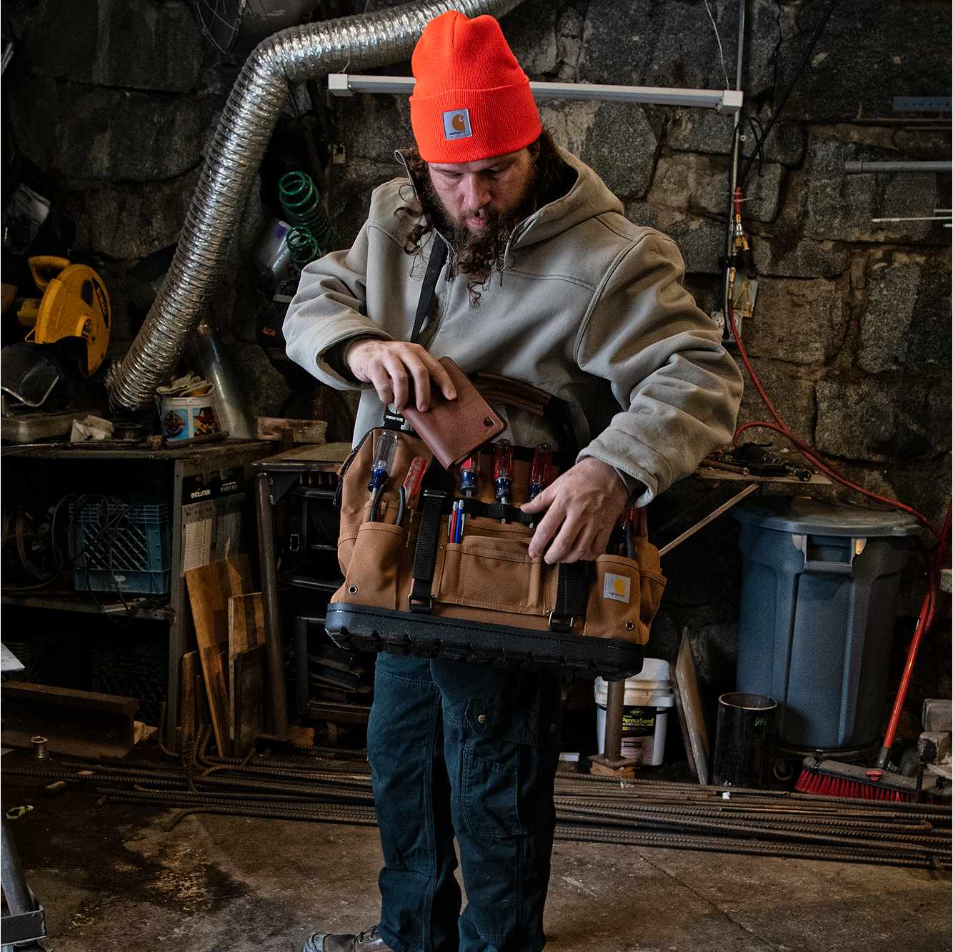 Find what you need when you need it. This tool bag keeps your gear in line with a durable design featuring 44 total pockets and loops. It's made of heavy-duty material that shrugs off light rain, with an abrasion-resistant base. The 18-inch main compartment has a metal frame, so you can find the right tool without digging around.