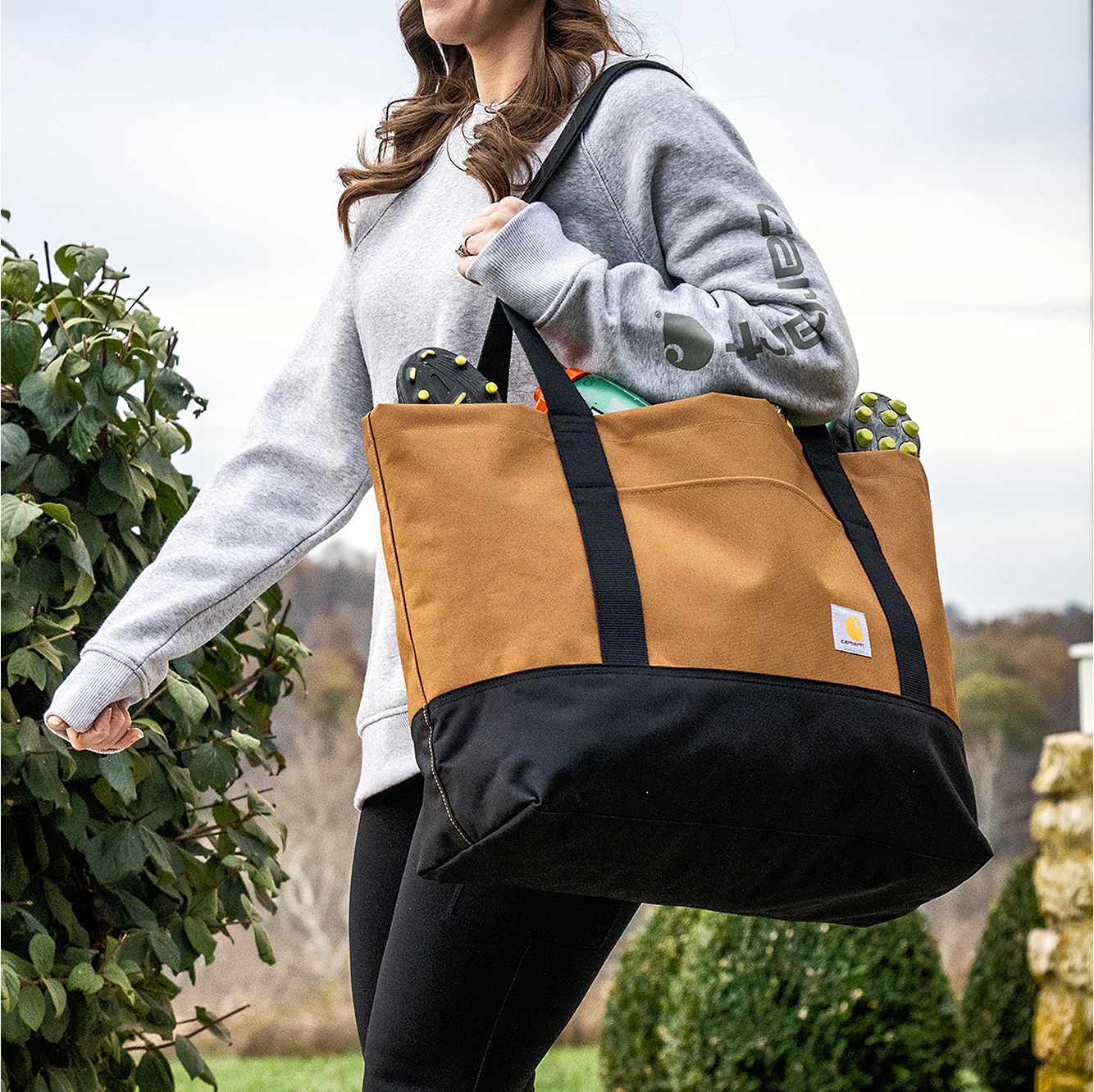 Sturdy, water-repellent fabric and a utilitarian design make this tote your go-to for hauling jobsite gear, camping supplies or groceries. A triple-stitched base offers extra durability. Outside pockets keep your essentials within easy reach, and the coated interior makes cleanup easy.