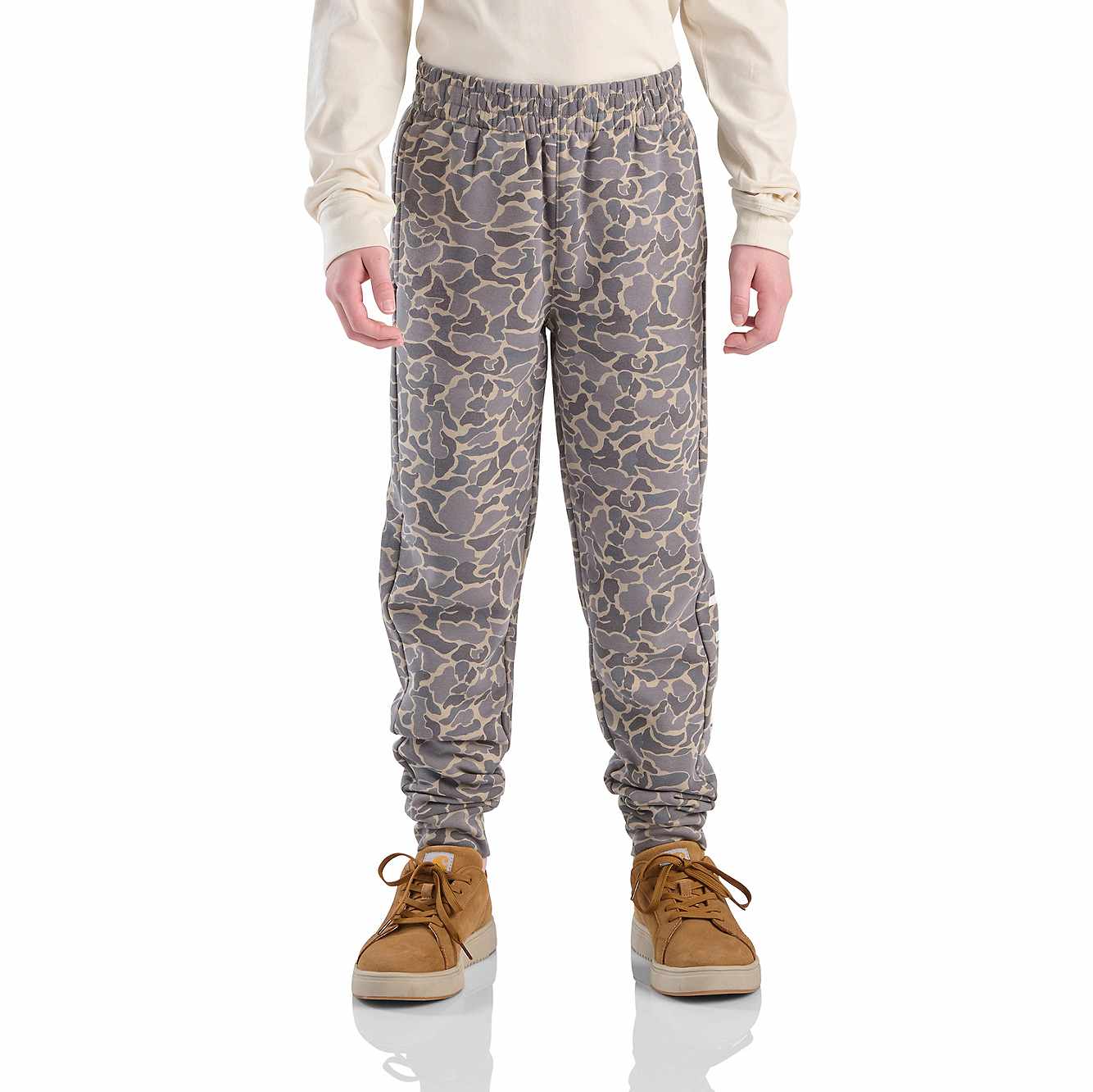 Exploring the world is more fun when he's comfy. These boys' Carhartt sweatpants combine the warm feel of fleece with a cool allover camo print. Go ahead and let him get dirty. Machine-washable fabric makes cleaning up easy.