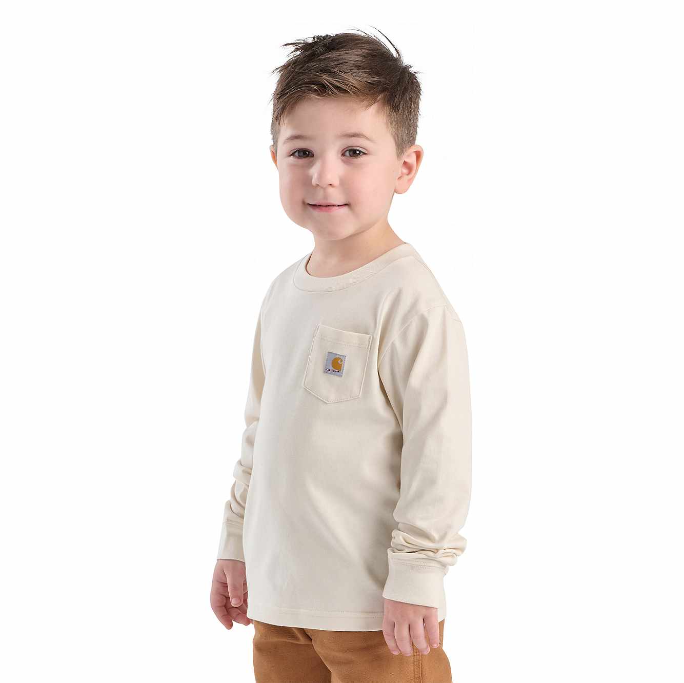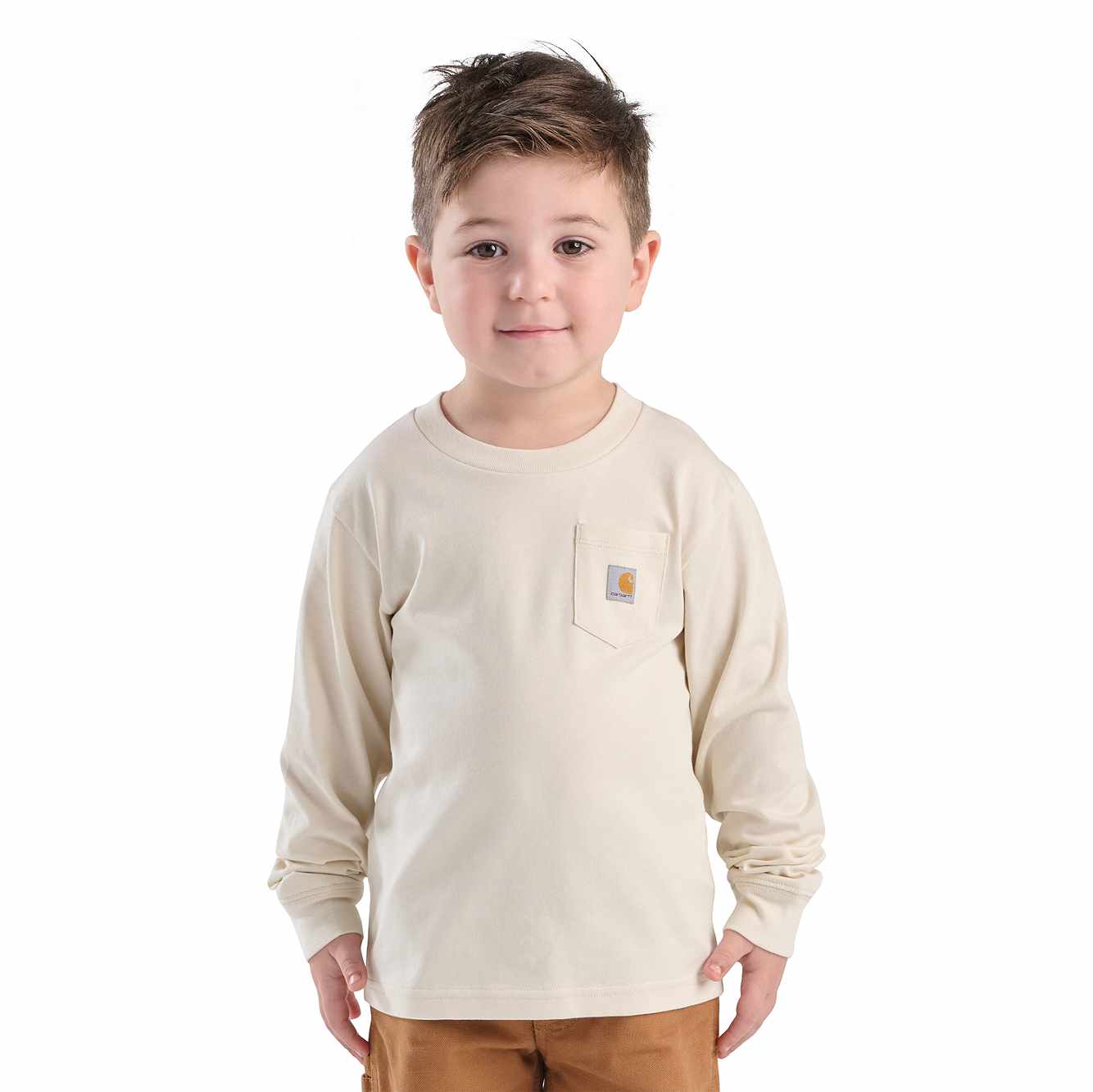 The best shirts feel better with every wear. This boys' long-sleeve pocket t-shirt has all the makings of a favorite. It's made with soft cotton fabric that's Carhartt tough and ready for anything. It's got an easygoing fit that resists twisting and a tagless neck label.