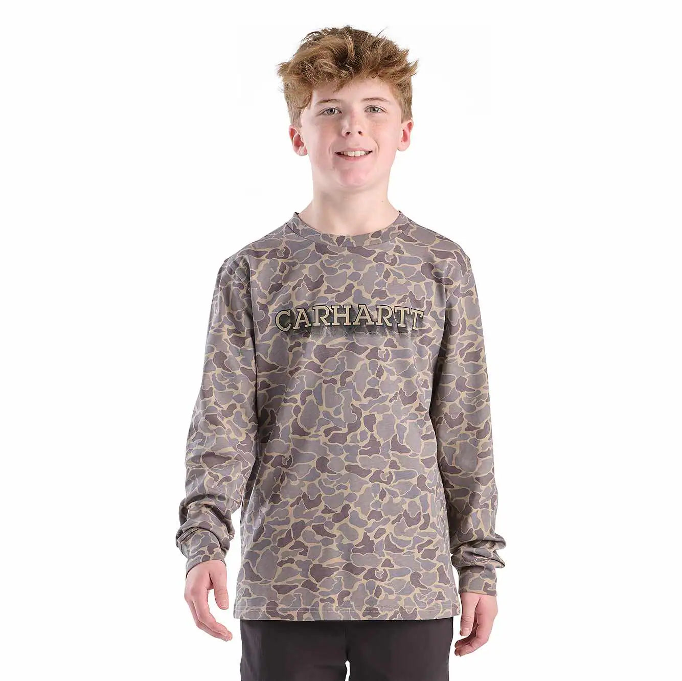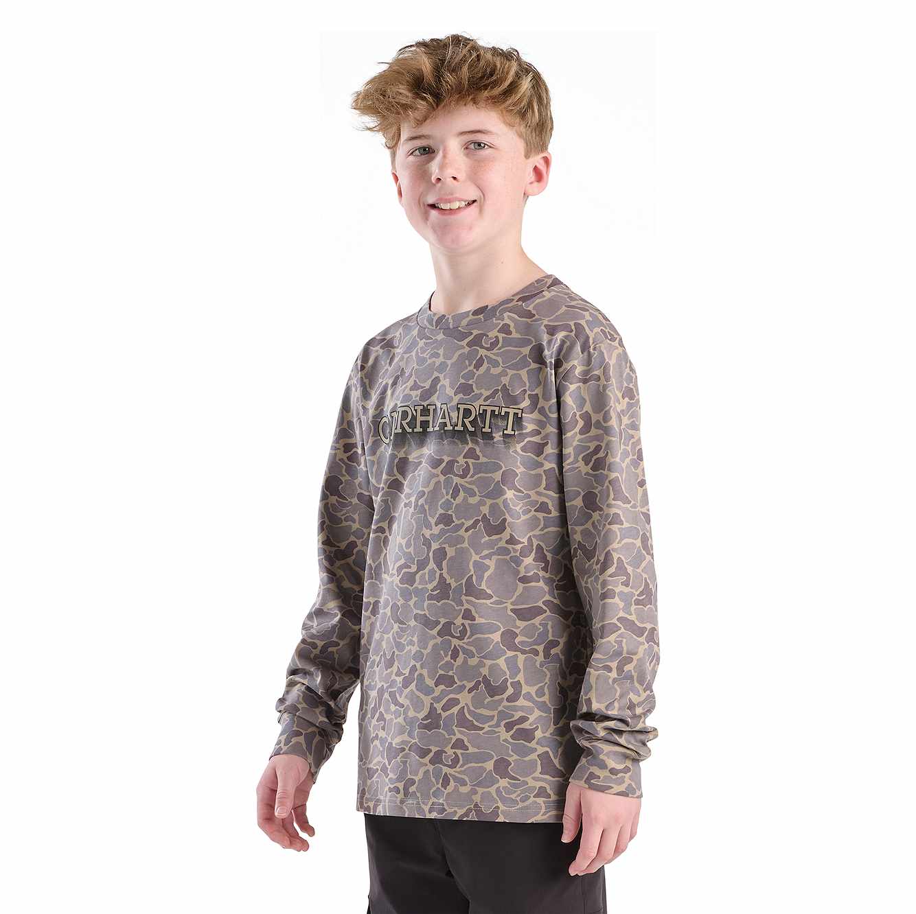 A brand-new shirt with a good, old, dependable feel. This boys' long-sleeve t-shirt gives kids the soft, everyday feel of cotton with Carhartt toughness that outlasts the rest. Allover duck camo means he'll win at hide and seek every time.