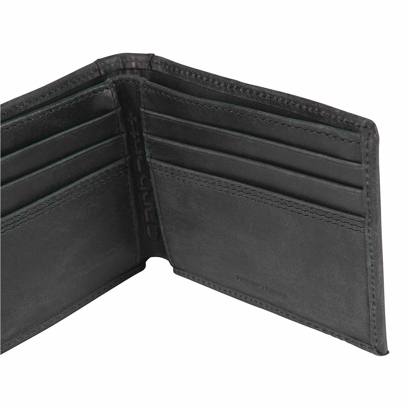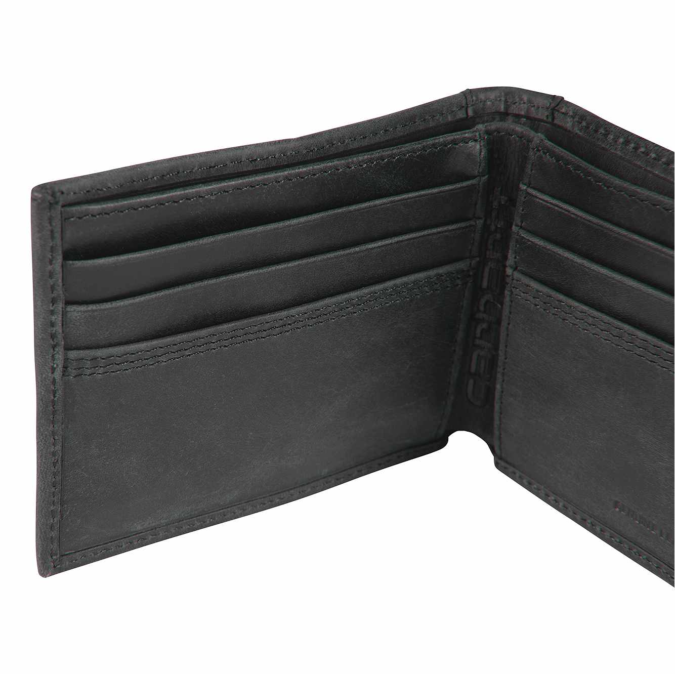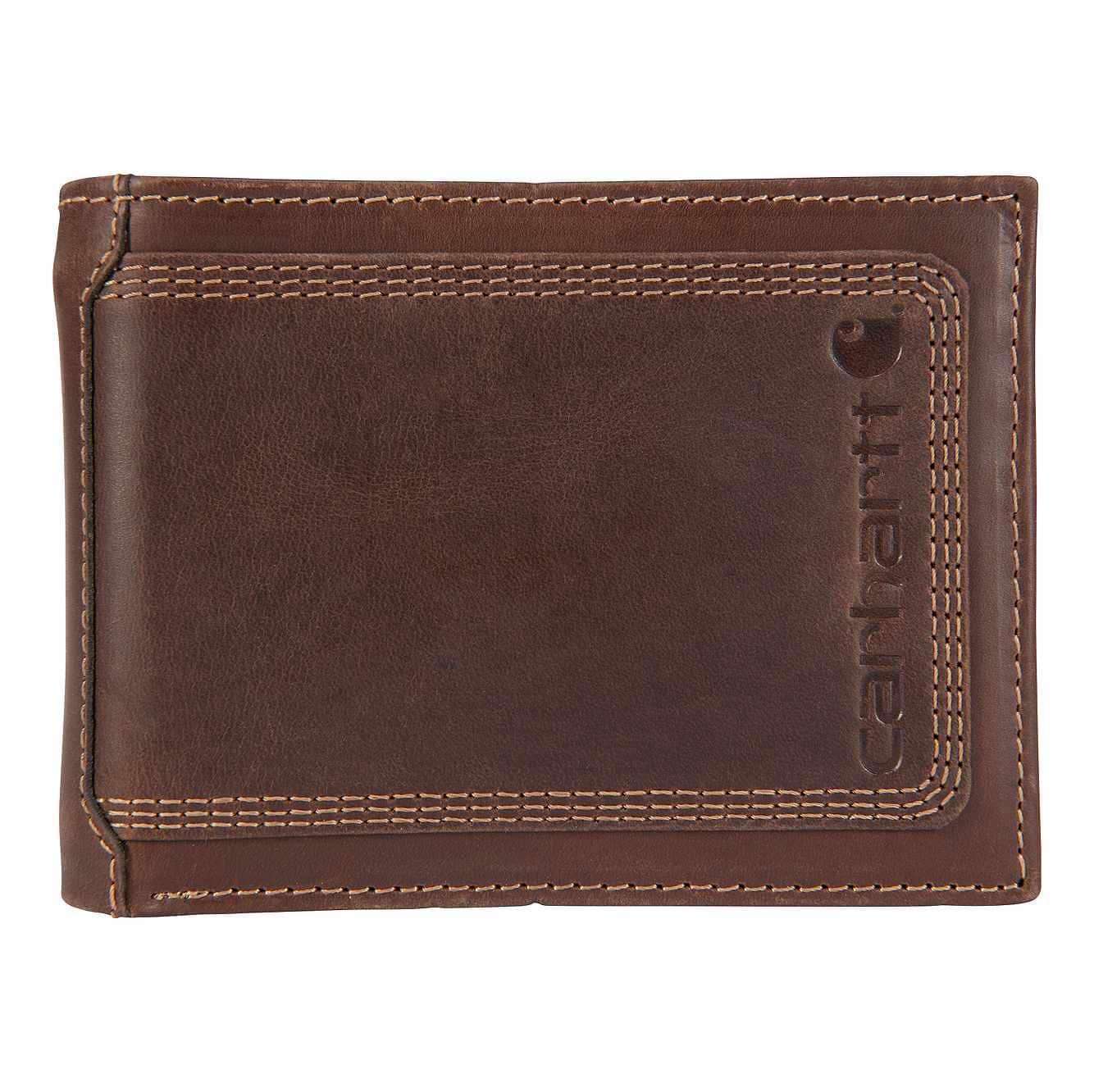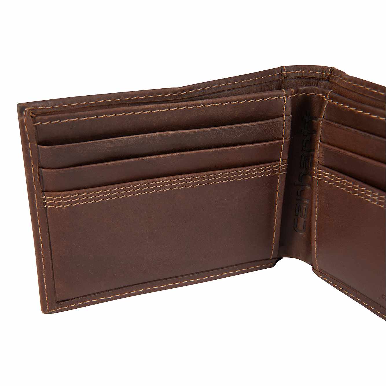 Hand stitching and an embossed Carhartt logo give this men's passcase a rugged look. It's made of top-grain leather, with a sweat-resistant patch that helps keep the wallet dry. The billfold is lined with cotton duck.