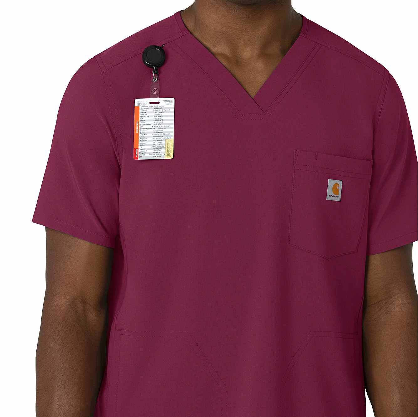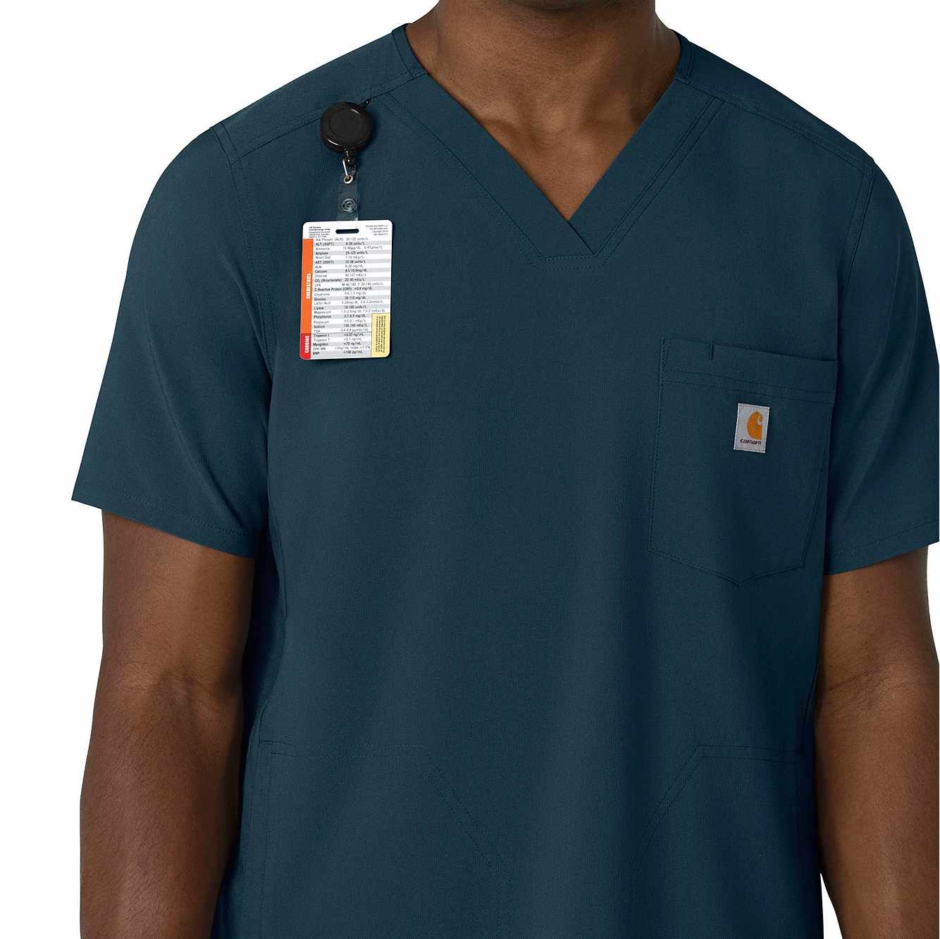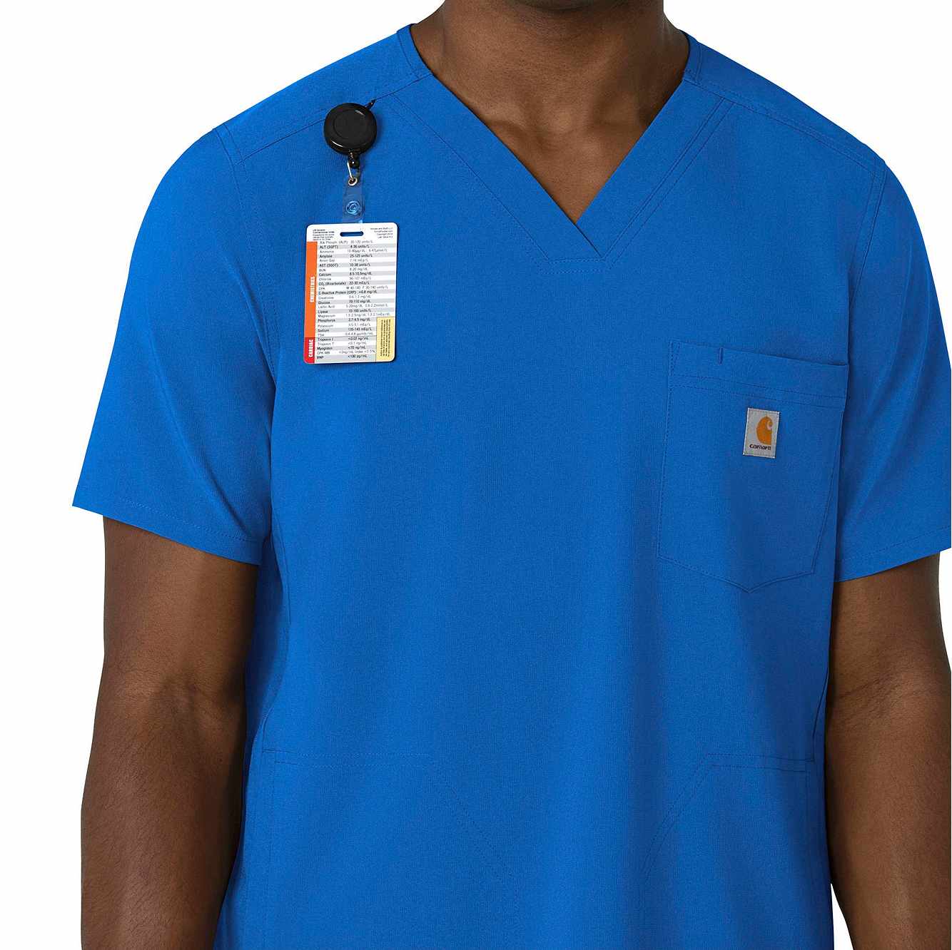 You need comfort and utility you can always count on, from the moment a shift starts until you're ready to head home. This men's scrub top gets it, and it's built to last through every demanding day. It's made with a soft, stretchy material that includes micro ripstop for durability. Keep your most-used items right where you need them in a chest pocket that has a pen slot, plus two larger pockets on the side that allow for easy access to tools and supplies. Whenever you reach up high or stretch across a surface, you'll get full range of motion with knit panels on the back arm. Side hem vents add even more flexibility while creating a clean look that lets your scrub top drape with ease over your scrub pants. Secure your badge in place with a loop at the shoulder. Made for all the demands of your day, this scrub top wicks moisture to keep you confident and dries quickly to keep you comfortable.