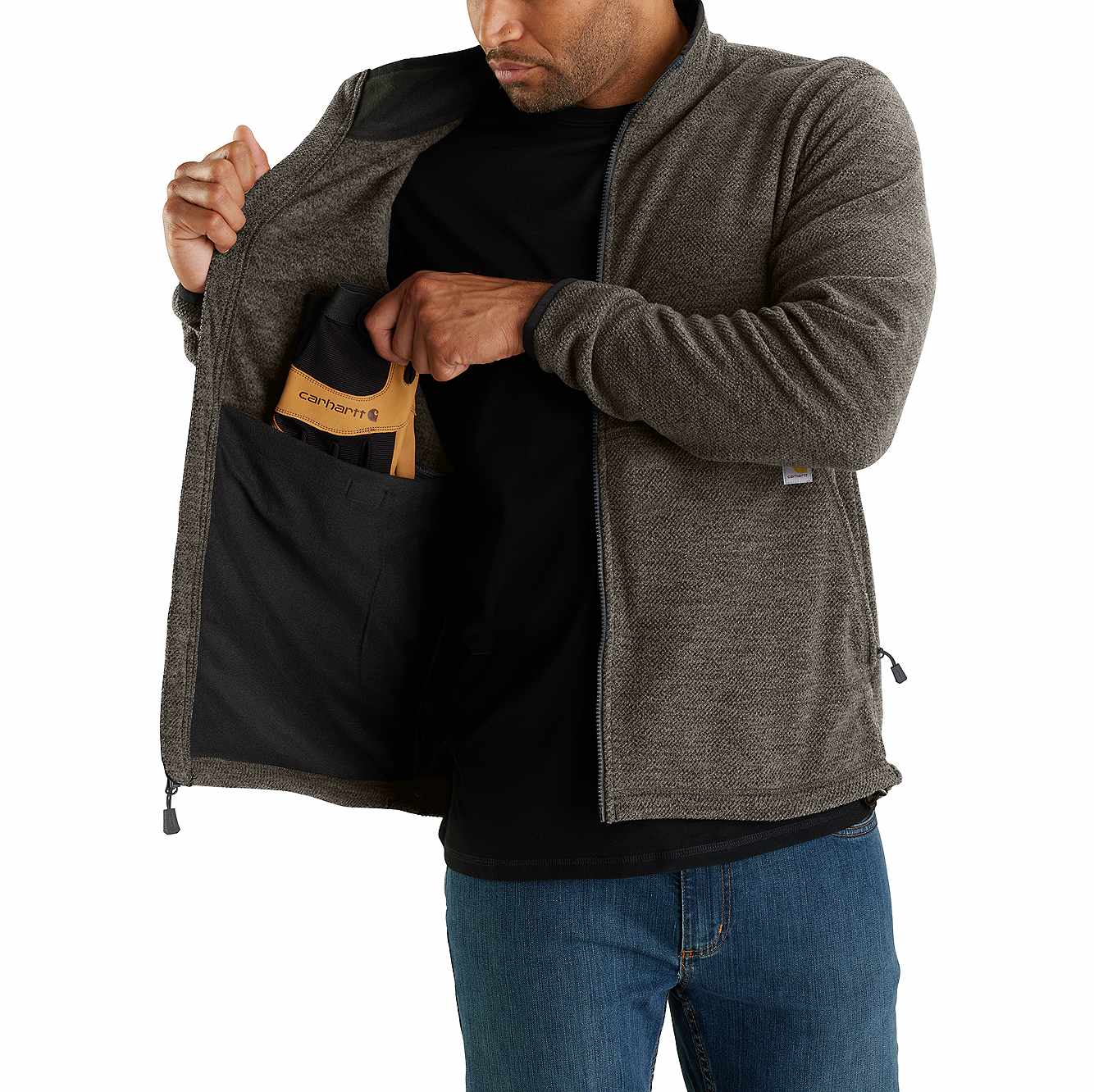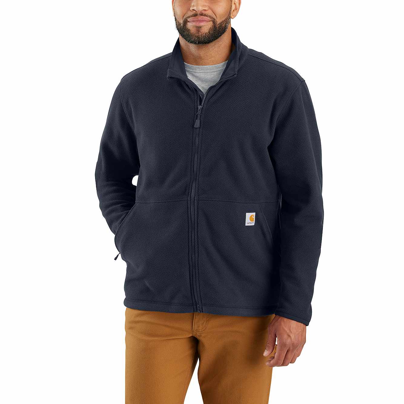 A go-to layer for cool weather, this men's full zip fleece jacket is made in soft, textured fleece. It has a mock neck for extra coverage and elastic cuffs to help seal out cool air. A relaxed fit is easy to layer.
