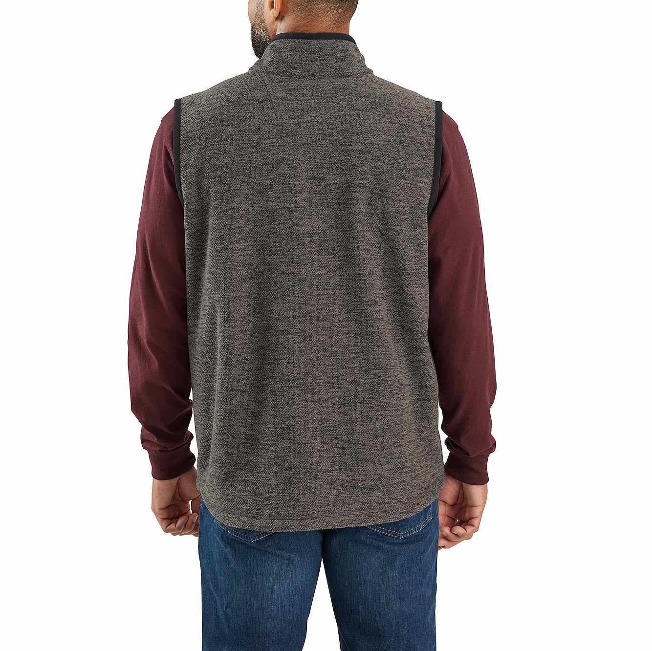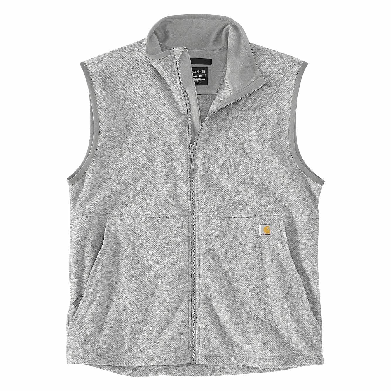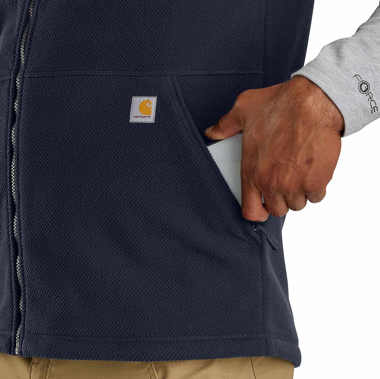 When the weather shifts on the job, this men's fleece vest is easy to zip on and off. It's extra long in the back, so you can bend and move in comfort. Zip pockets secure essentials. A relaxed fit gives you plenty of room to move. The Carhartt label lets you know it's durable.
