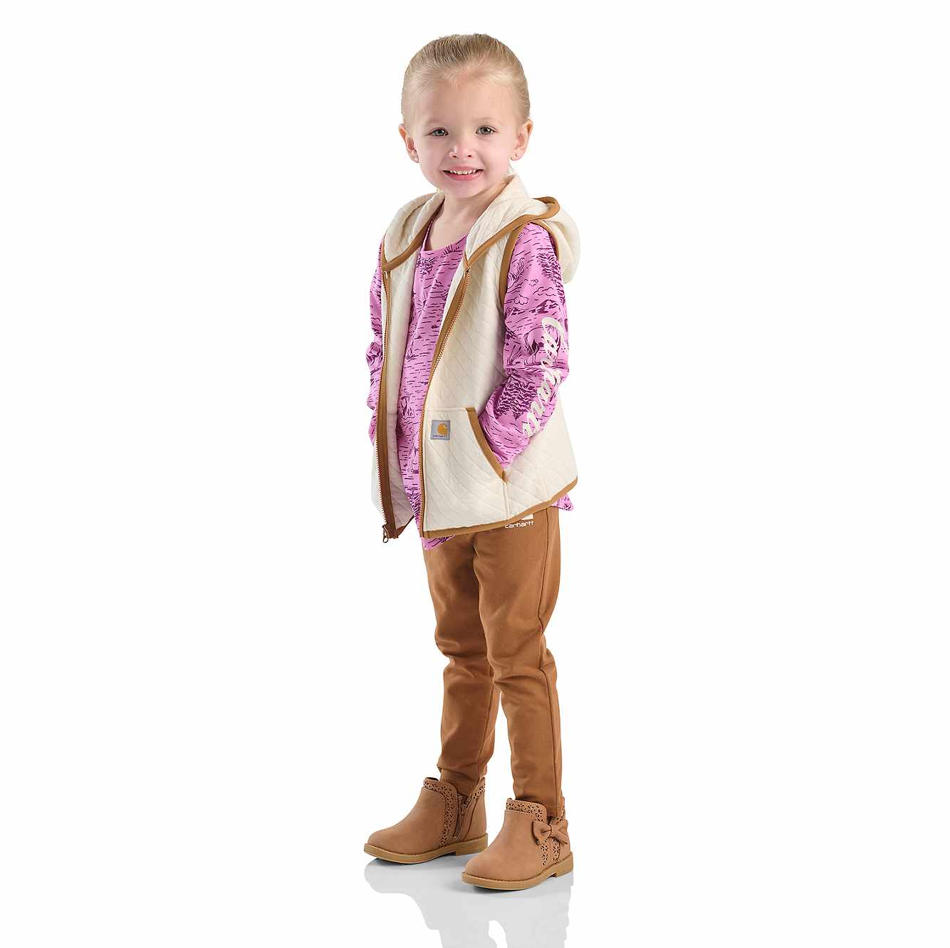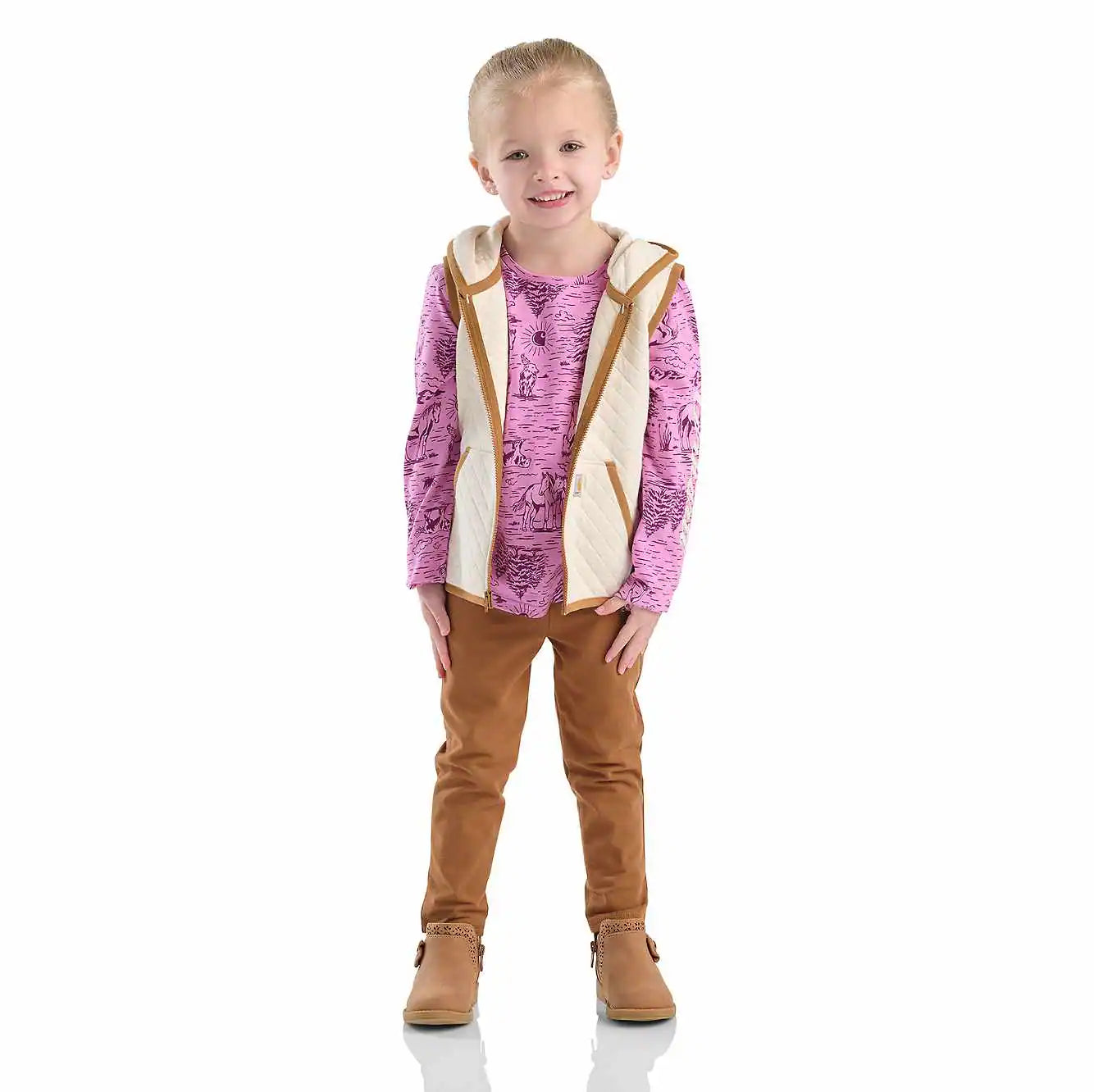 If she can't take her eyes off of horses, dress her in this toddler girls' three-piece set from Carhartt. The cotton t-shirt and stretchy leggings are durable yet gentle on skin. The hooded vest is quilted for a blanket-like feel.