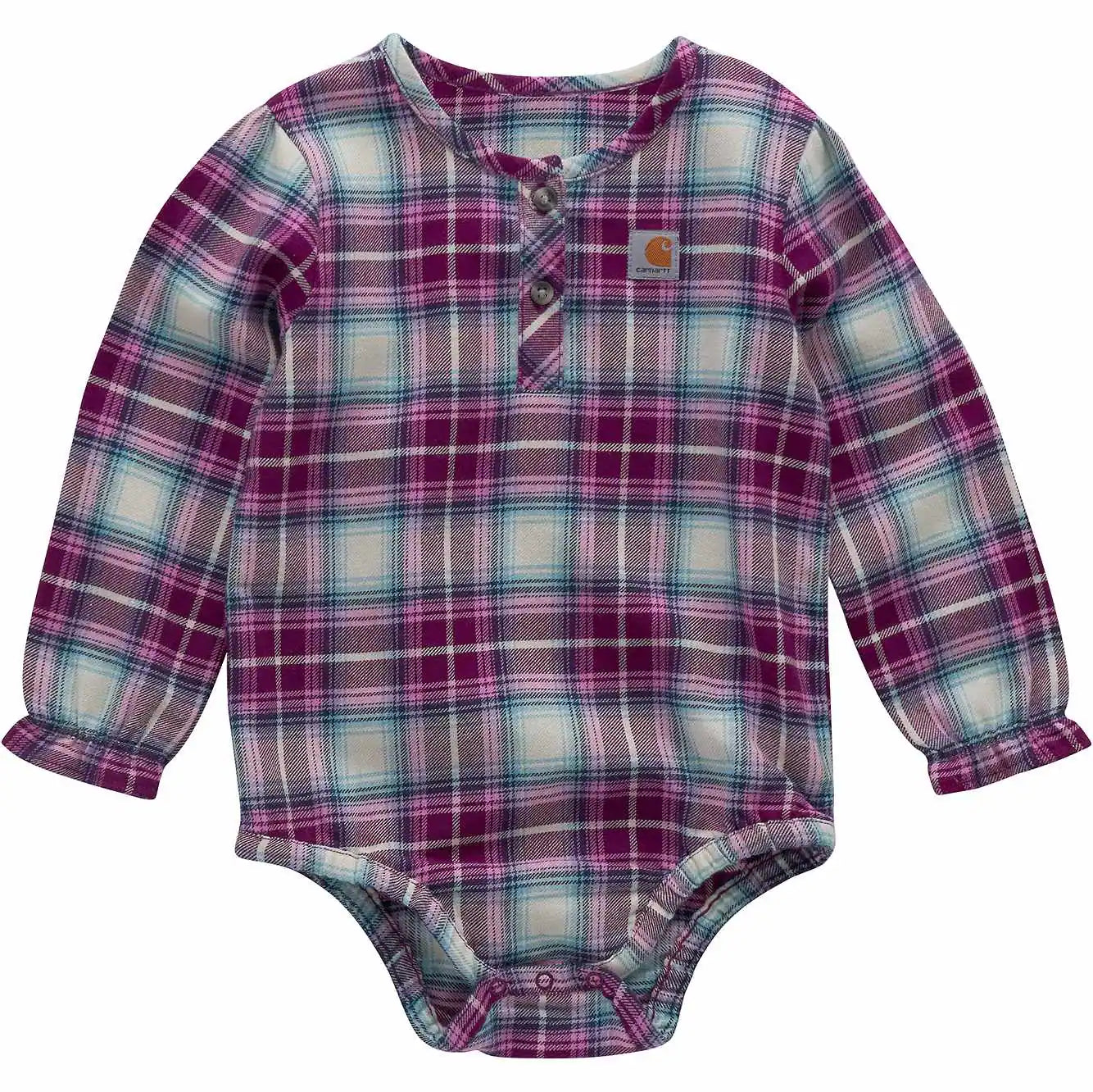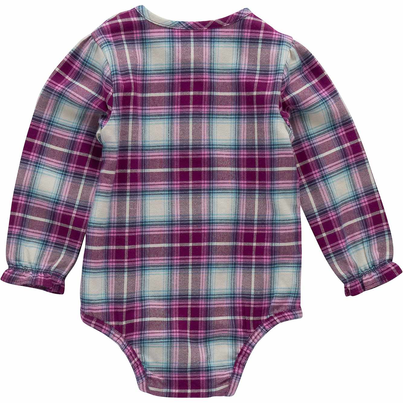Baby's first flannel. This long-sleeve bodysuit for baby girls is Carhartt tough and cotton soft. Yarn-dyed plaid is machine washable, so she can go ahead and get messy. Buttons down the front and bottom snaps make changes quick and easy.