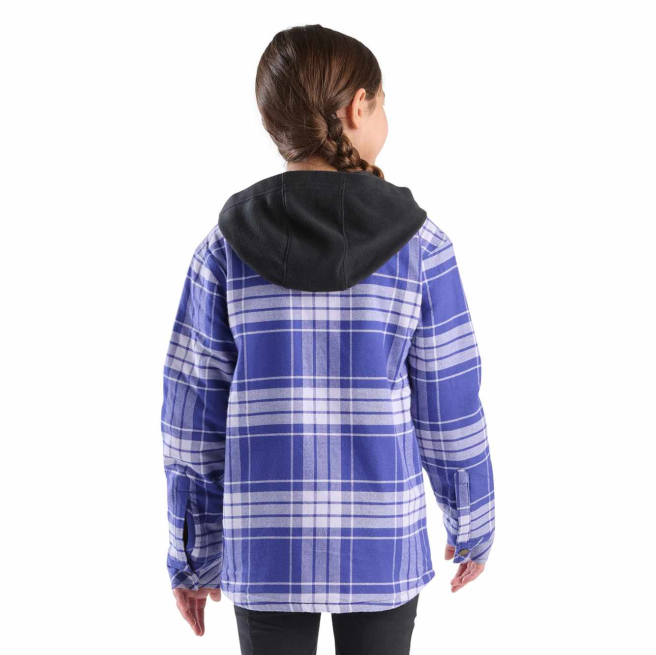 Half flannel shirt, half jacket, this girls' Carhartt shirt jacket is great for chores, outdoor work, camping, and more. It's made of yarn-dyed flannel and has a built-in fleece hood. Microfleece lines the body for extra warmth, but it's low-profile enough for kids to layer under another jacket or a vest.