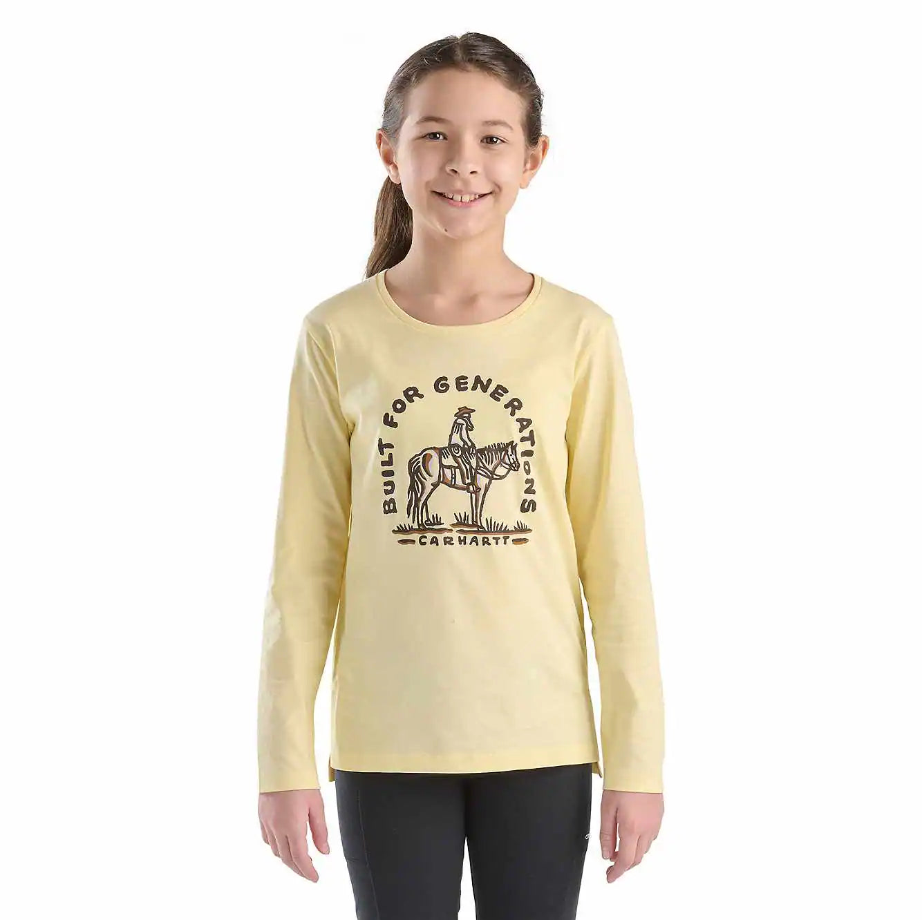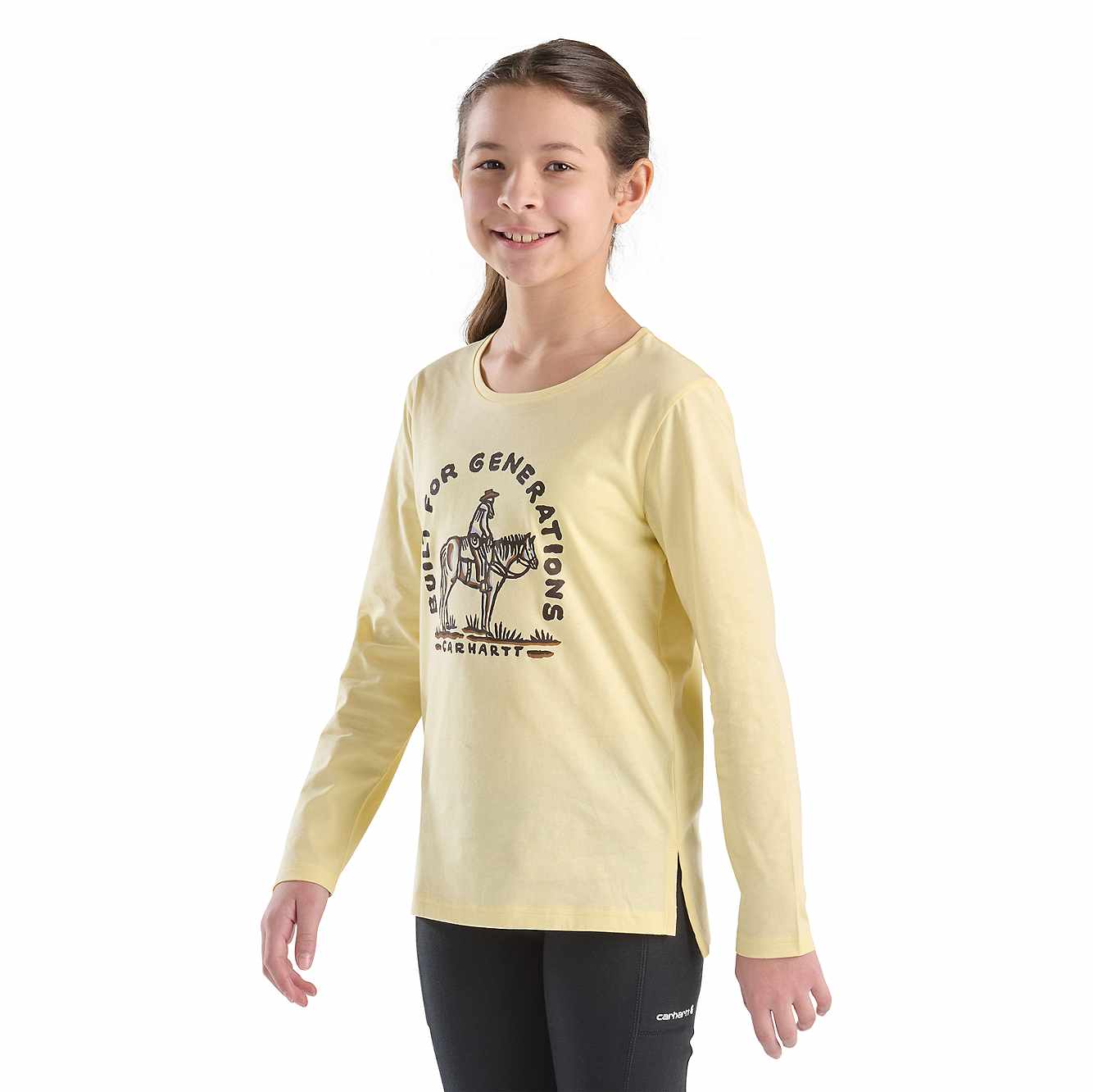 Carhartt has been making durable, dependable work clothes for generations. This long-sleeve T-shirt for girls continues the tradition with an all-cotton build and a wide, ribbed crewneck. It has a dropped back hem with side vents and a scratch-free tagless neck label.
