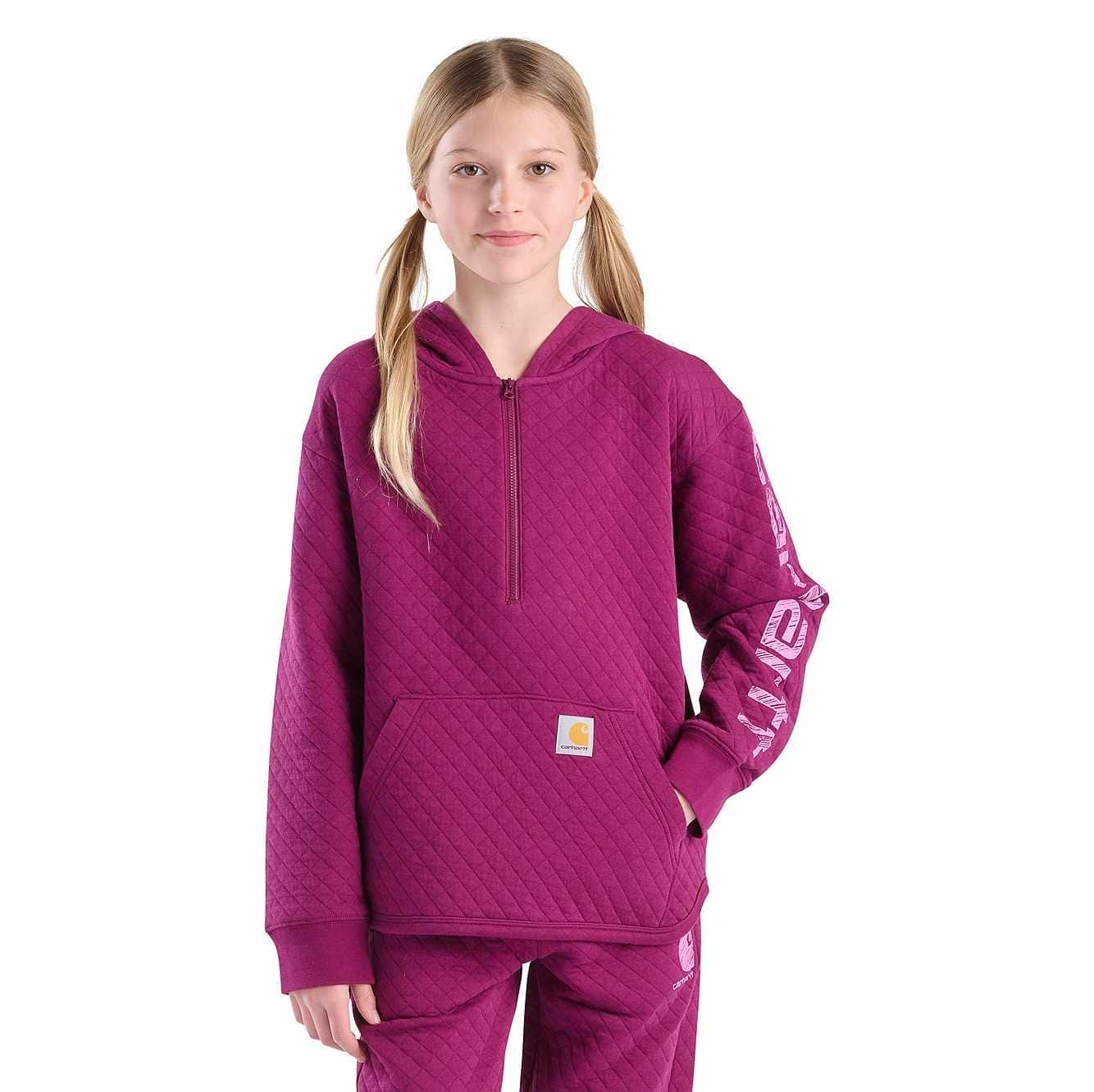This girls' long-sleeve sweatshirt from Carhartt does a great job keeping kids warm and comfy. Made from quilted fabric with a little filling for added warmth, it has a half-zip neckline for easy on and off and a full hood for coverage. There's a big front pocket for tucking hands or holding small items and a Carhartt word mark down the sleeve.