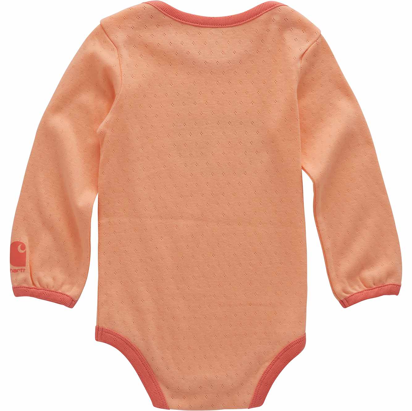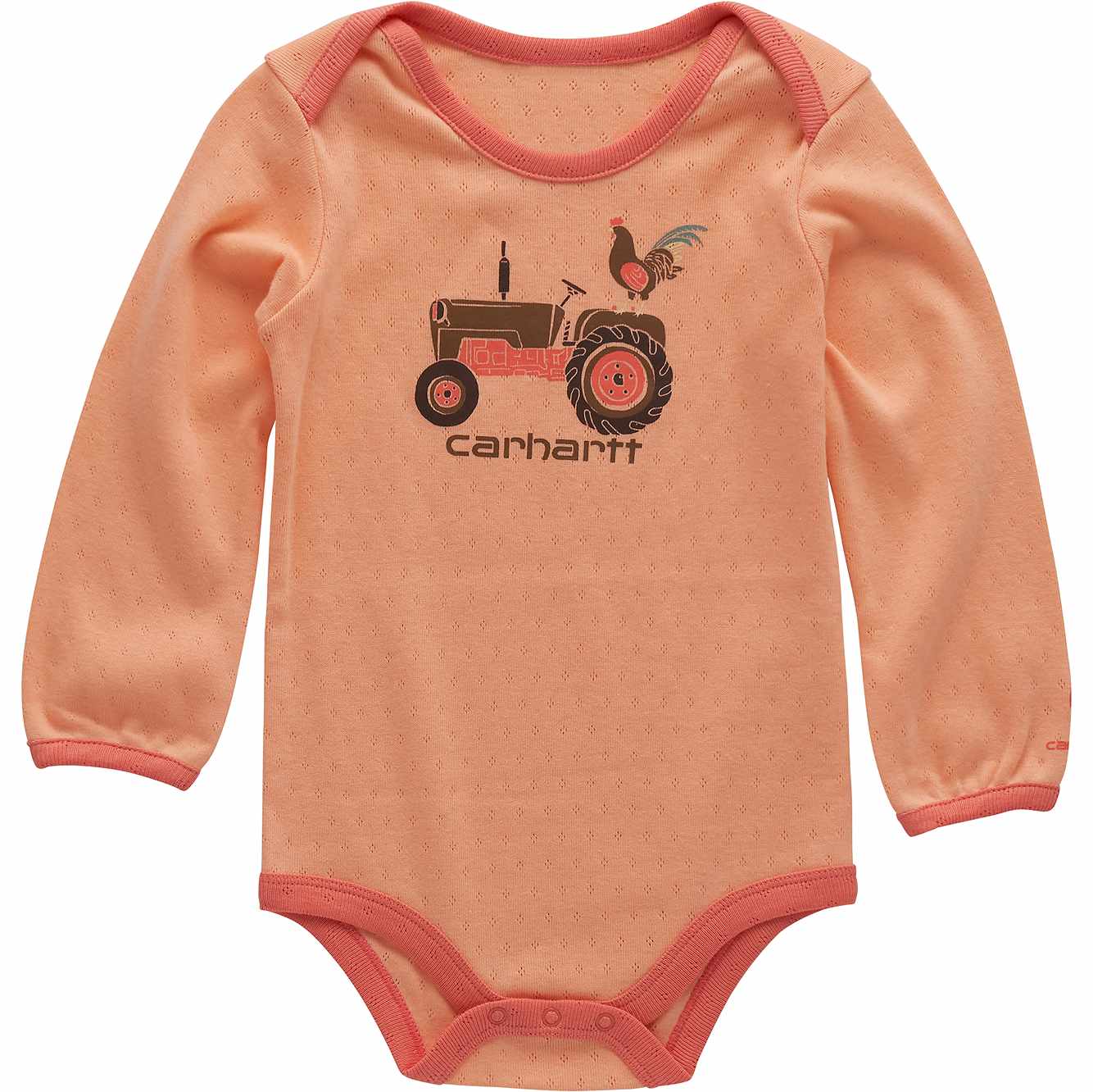 Your little farmhand may be too young to drive the tractor, but she's got the look down in this baby girls' Carhartt bodysuit. Soft yet durable cotton is gentle on skin but is made for the long haul. Convenient snaps make changing easy.