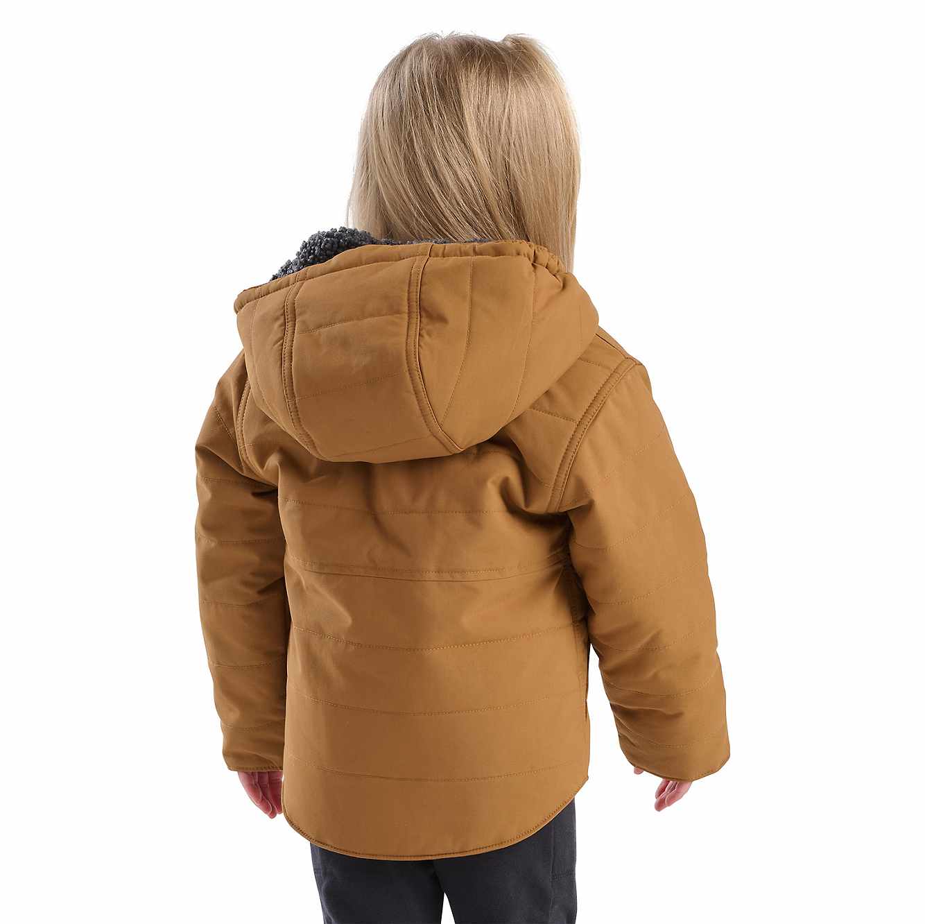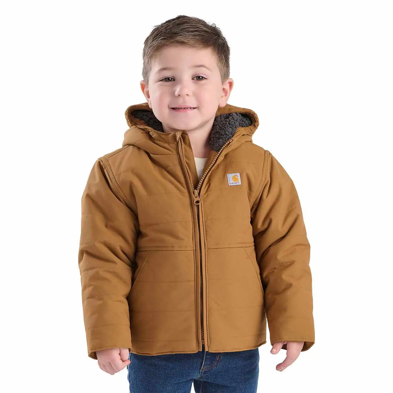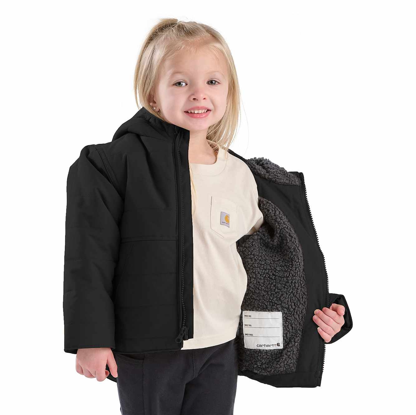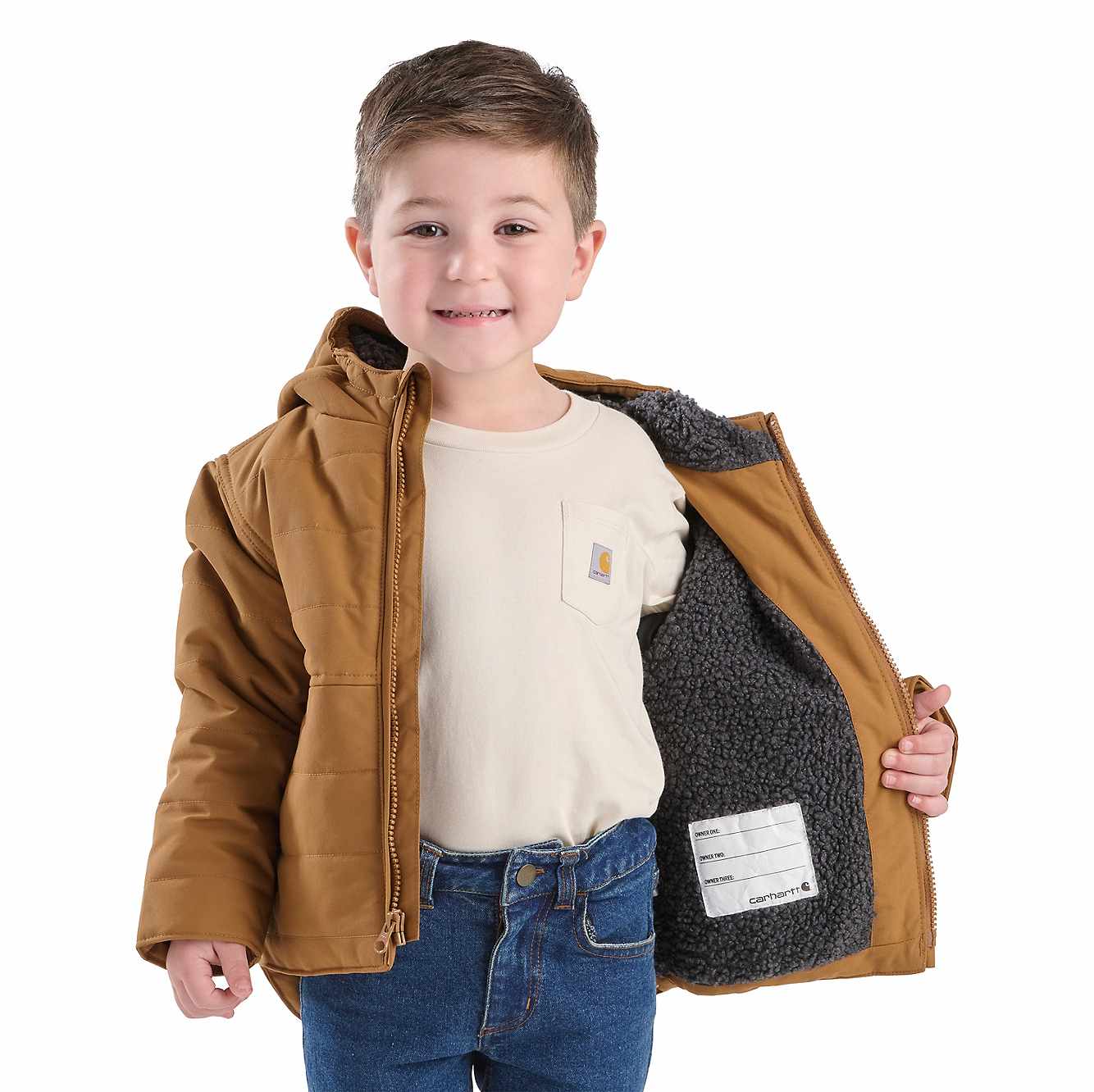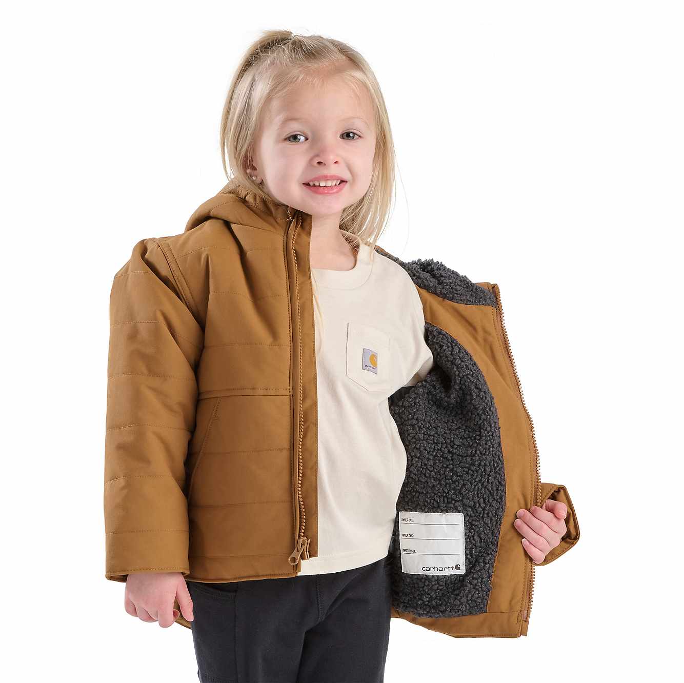 Don't let bad weather keep them cooped up. This Carhartt insulated hooded jacket gets babies and toddlers where they're going in comfort. The fleece lining keeps it warm on the inside, while the water-repellent nylon shell toughs it out against the elements.