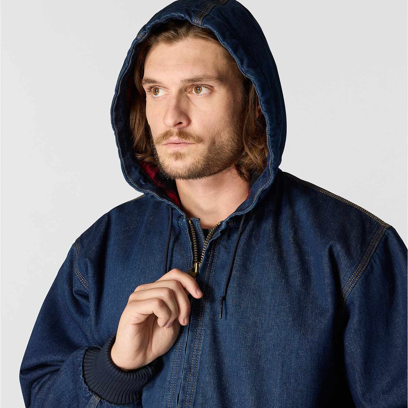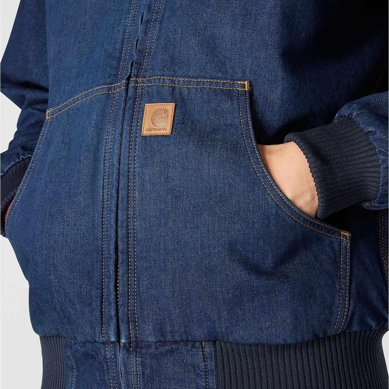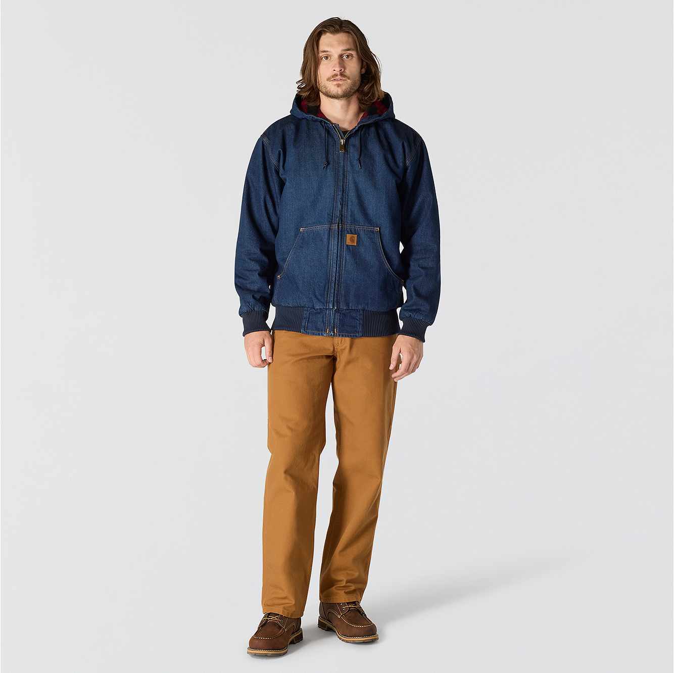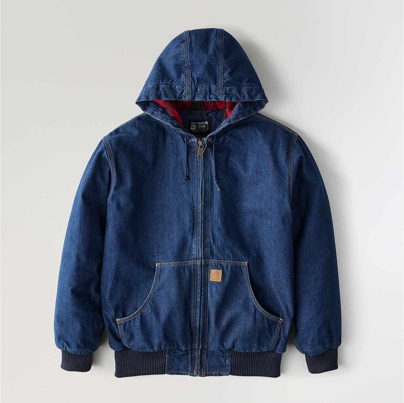 For hard-wearing durability and warmth, reach for this men's Carhartt denim jacket featuring heavyweight, 100% cotton material that handles the wear and tear of ranch, farm, and job site. Synthetic insulation throughout and a flannel lining in the body seal in heat. Taffeta-lined sleeves make it easy to pull on and off, while the loose fit and active jac styling is ideal for layering and won't restrict your movement.