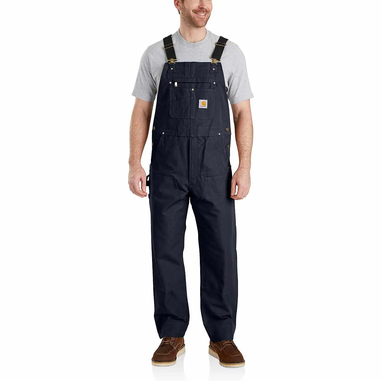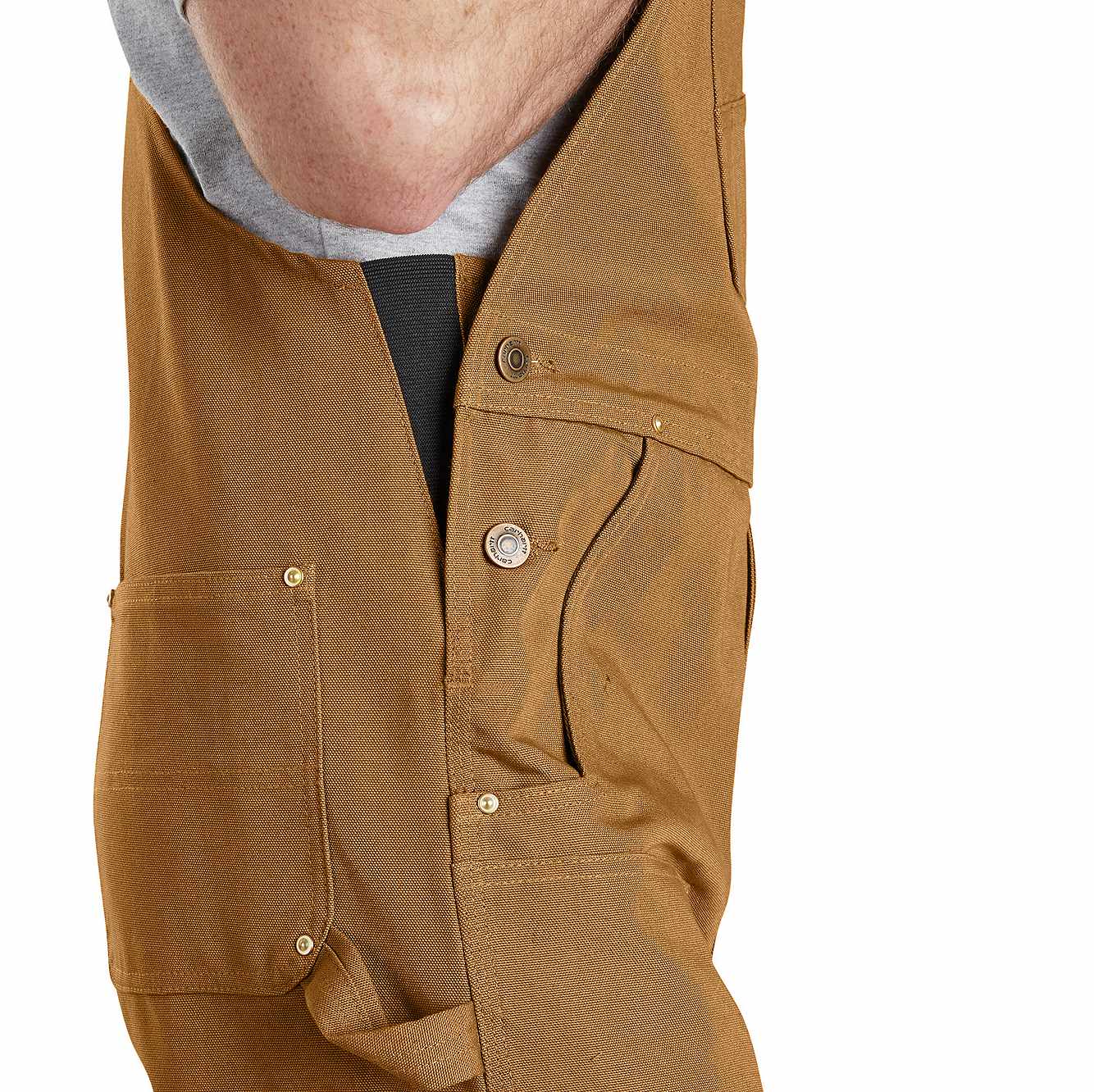 An update to our most popular unlined bib, the R01, these heavyweight men's bib overalls were designed using feedback from our Carhartt Crew. Every detail, from the front-to-back kick panel on the cuffs to the extra stretch around the waist, was informed by the hardworking people who wear our gear day-in and day-out. The heavyweight cotton duck material makes them dependable and durable. Elastic suspenders, a double layer at the knees, and ample pockets provide even more durability and functionality. Compatible with the Carhartt Knee Pad.