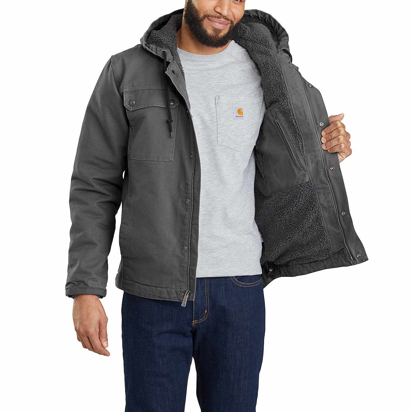 Engineered For midrange warmth in moderately cold conditions, this men's sherpa-lined jacket is built to endure cold, wind, and tough days on the job. Rugged without being rigid, it's made with durable cotton duck and is reinforced with Cordura® at wear points along the cuffs. This warm layer is lined with soft sherpa fleece through the body and hood, with warm quilted nylon through the sleeves. Generous pockets inside and out provide plenty of on-the-go storage options. Previously known as the Washed Duck Bartlett Jacket.