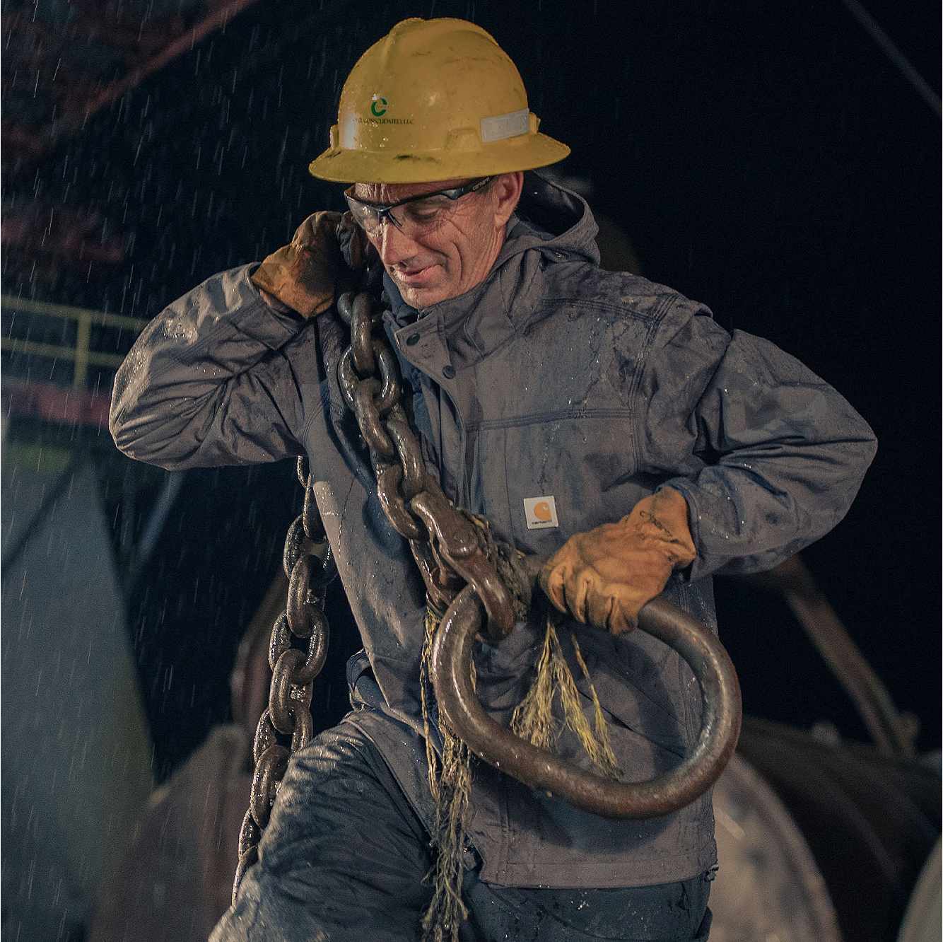 Work doesn't stop for thunderstorms or rain showers, and this men's waterproof jacket is made to stand up to the weather so you can get the job done. Waterproof and breathable thanks to built-in Storm Defender® technology, it keeps the rain out but also lets sweat escape. A detachable hood and an adjustable droptail hem provide full coverage, while the loose fit gives you plenty of room for layering.