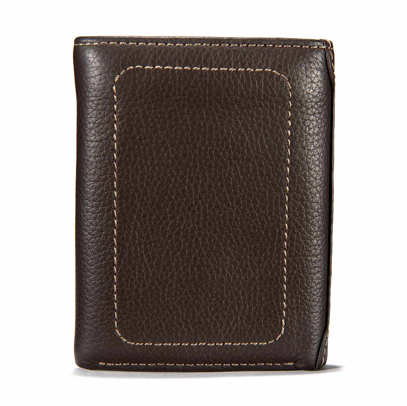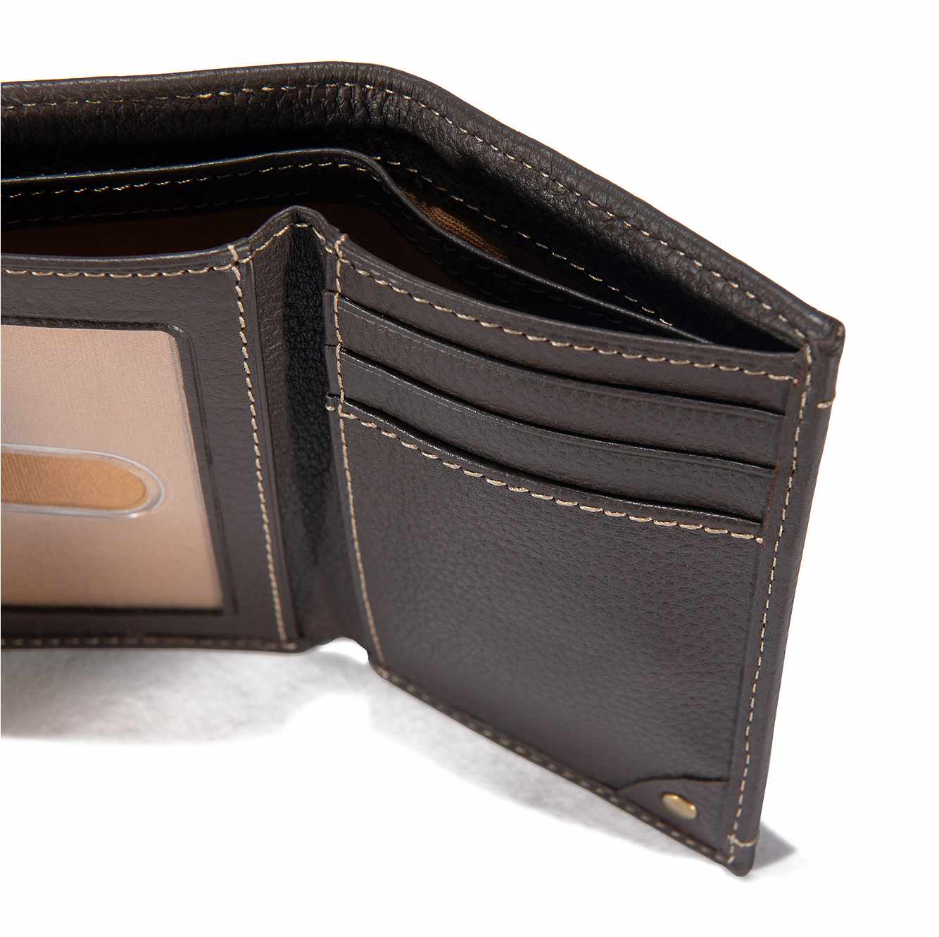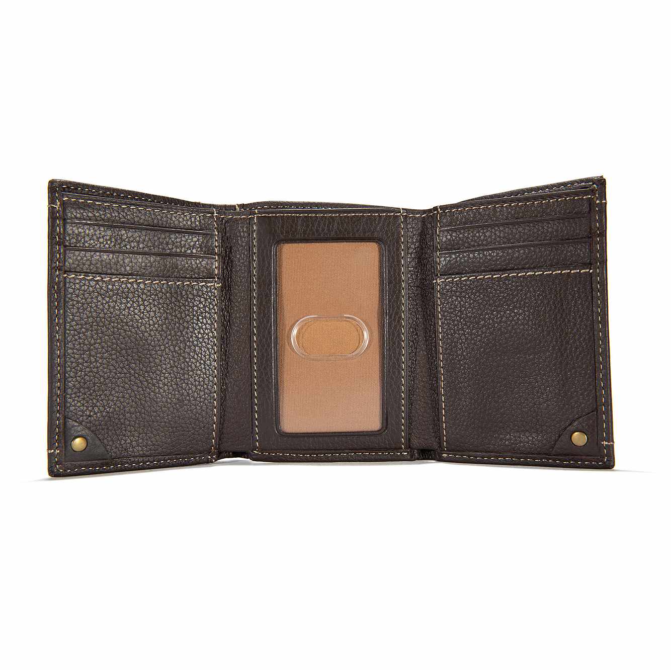 Keep cards and bills organized in this men's trifold wallet. It's made of top-grain leather with stitching details for a Western feel.