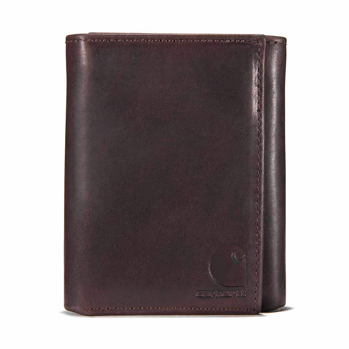 This men's trifold wallet has a simple, old-school design. It's made of durable full-grain leather with a rich oil finish that has a slight shine. An embossed Carhartt logo is its seal of quality.