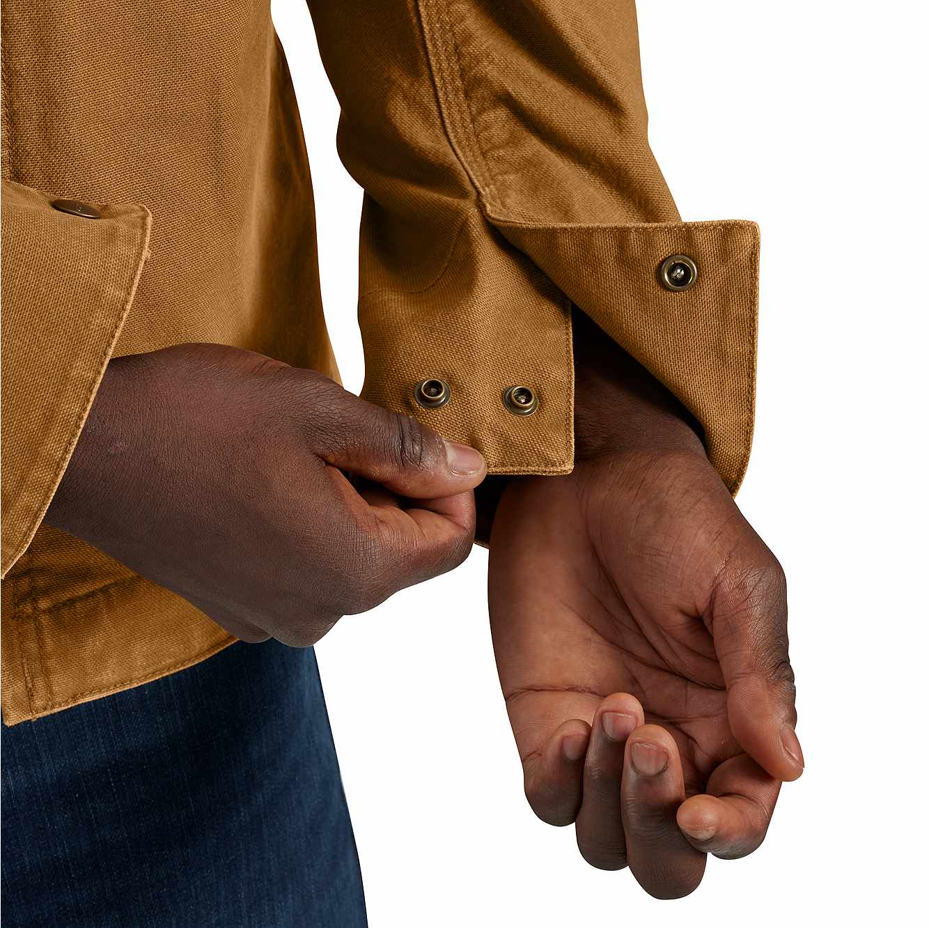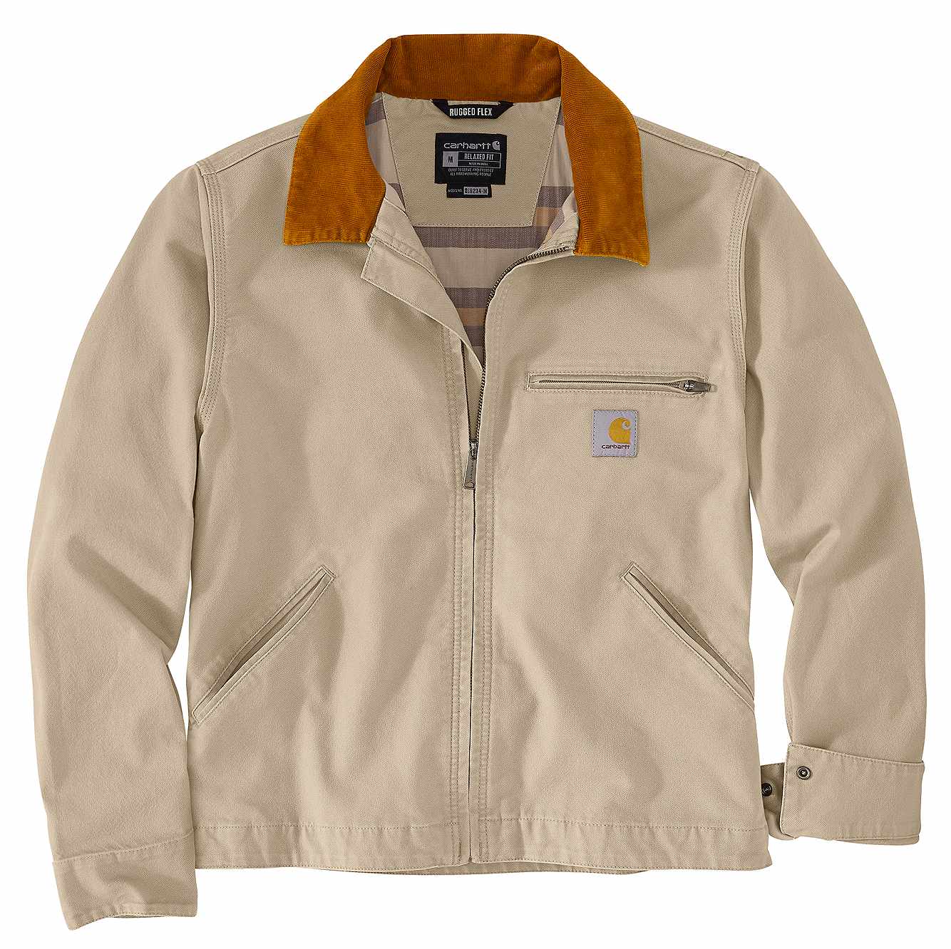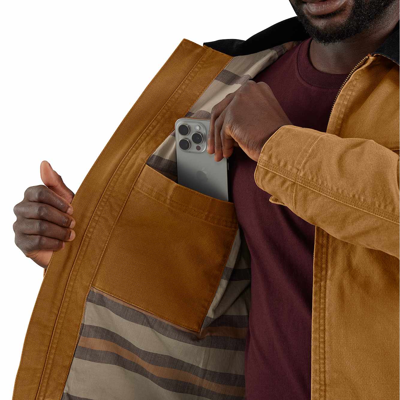 Inspired by legendary styles. From swapping fabrics to adjusting measurements, we've complemented one of our ur most classic styles with a more modern version. A Carhartt classic for over 70 years, the Detroit jacket takes a modern spin. This men's jacket reimagines the hardworking design with a lighter weight fabric for year round wear, a two-tone collar, and built-in flex that lets you move freely. Whether you're on the job or off the clock, rugged duck canvas provides durability, and a snap-adjustable hem lets you adjust the fit. Interior and exterior pockets keep your essentials close by.
