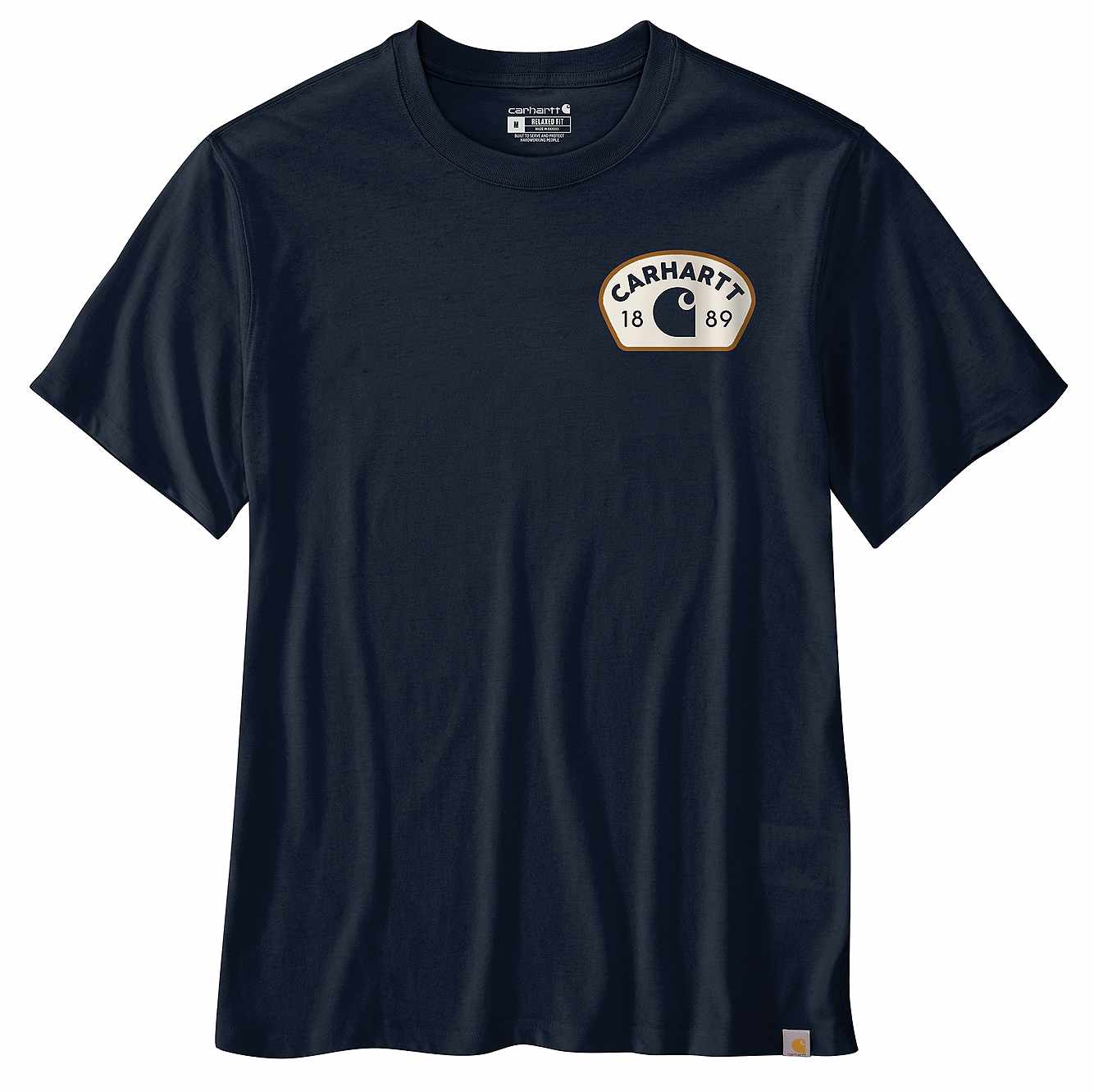 Everyday comfort meets Carhartt toughness with this men's graphic short sleeve tee featuring a Carhartt 1889® graphic on the chest and back using a technique that seamlessly blends plastisol and high-definition ink, creating layers and achieving a faux embroidery look. Constructed from lightweight cotton-blend jersey with an easy, relaxed fit.