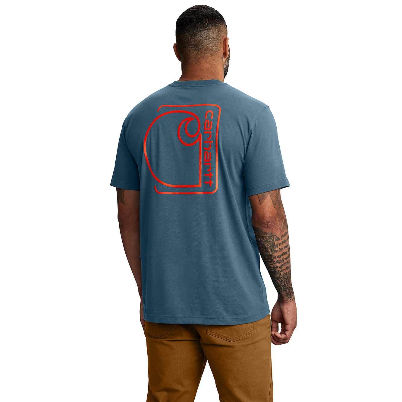 Everyday comfort meets Carhartt toughness with this men's graphic short-sleeve tee featuring a Carhartt "C" on the back. It's made from a lightweight cotton-blend jersey with an easy, relaxed fit and has a chest pocket for added utility. The graphic uses high-density ink to add texture by subtly raising the printed elements.