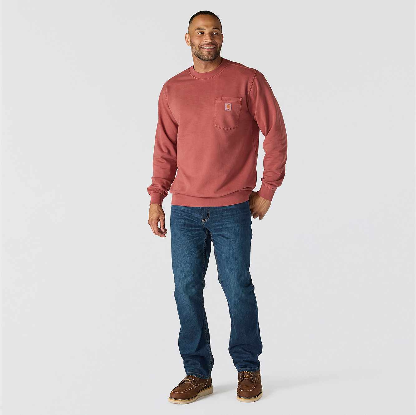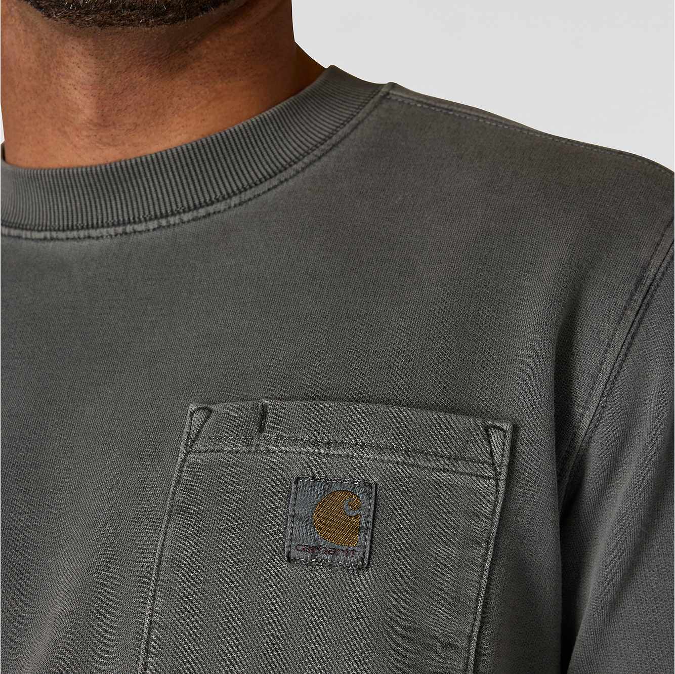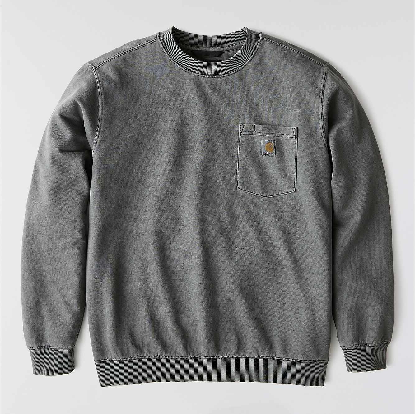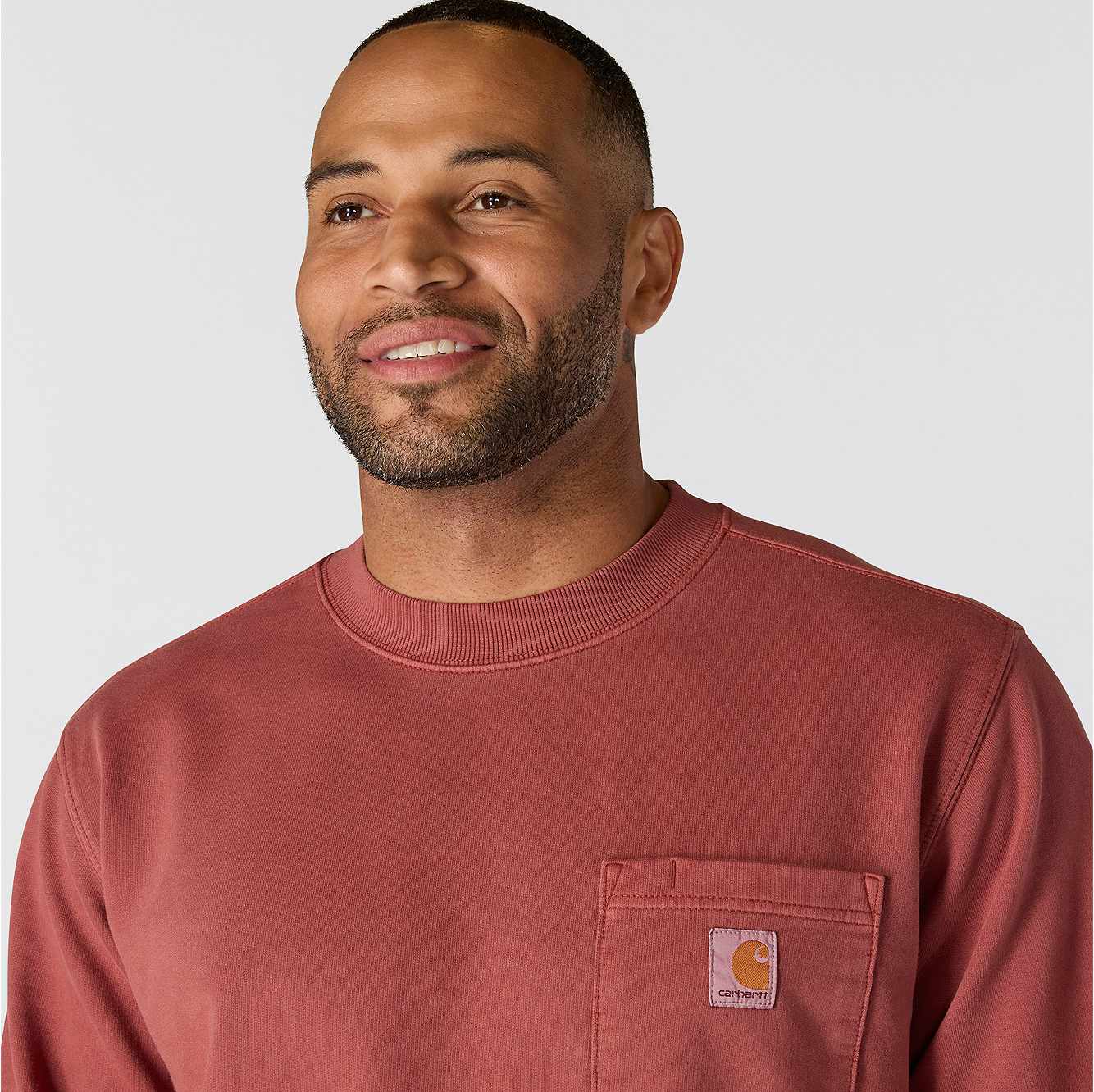 This men's French terry crewneck sweatshirt is garment-dyed for a worn-in, vintage look that only gets better with time. Built to last from midweight all-cotton French terry with a relaxed fit. Featuring a Carhartt label on the chest pocket.