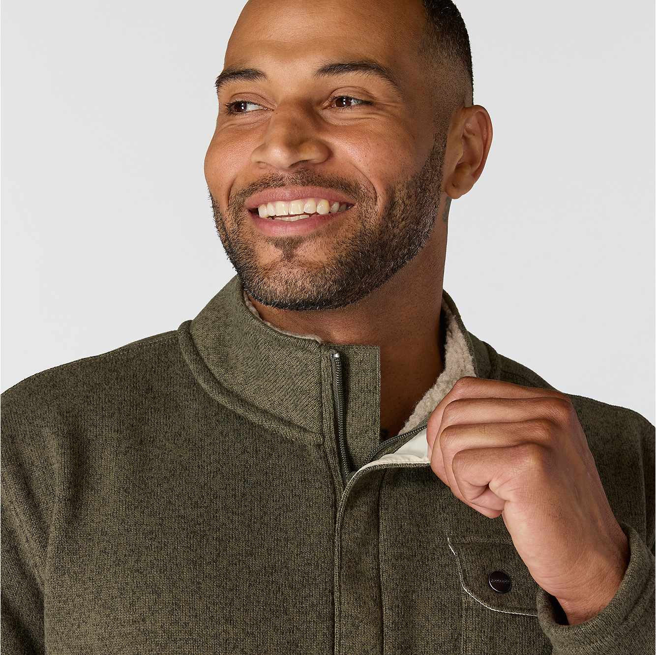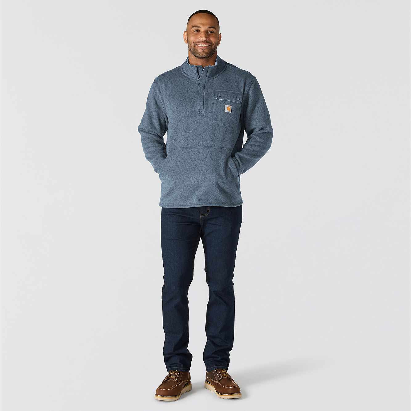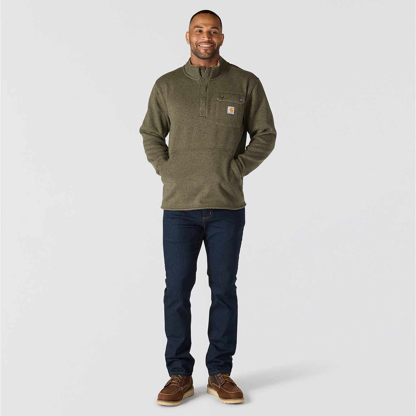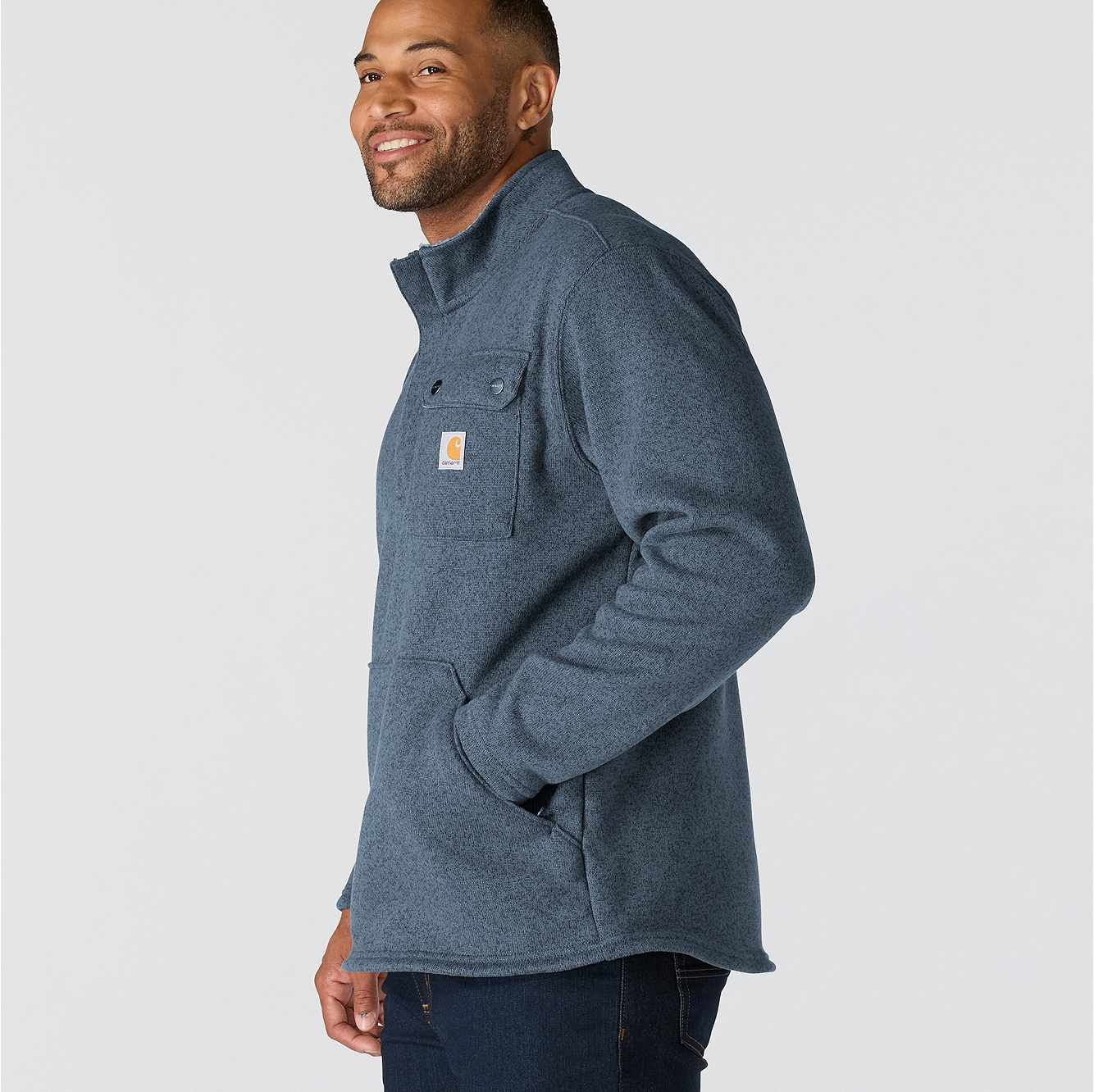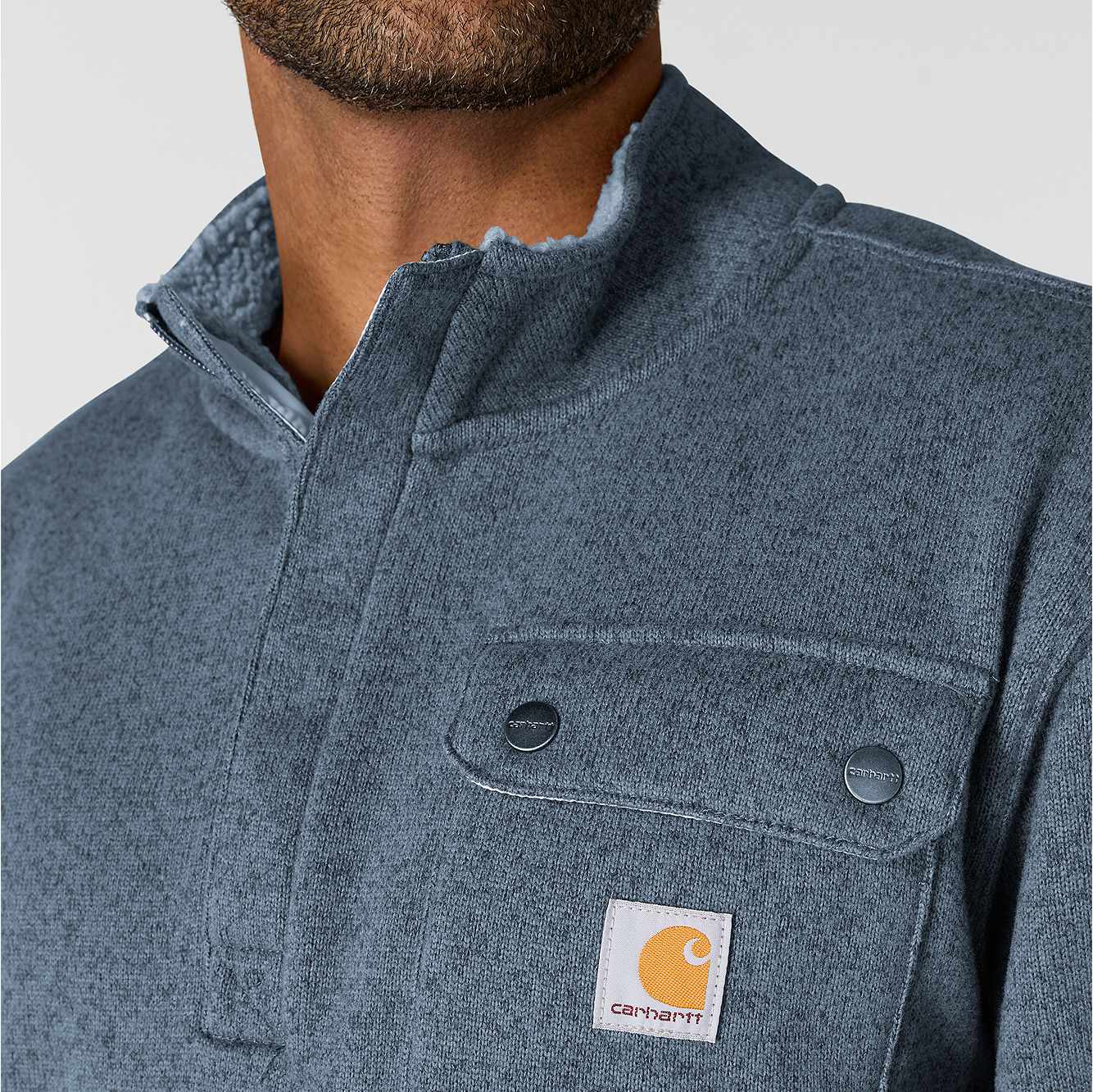 Stay warm when you're working outside. This men's Carhartt fleece sweater is your go-to when the temperatures drop. The collar is lined with sherpa fleece for an extra soft feel. The snap pocket secures essentials for the job ahead.