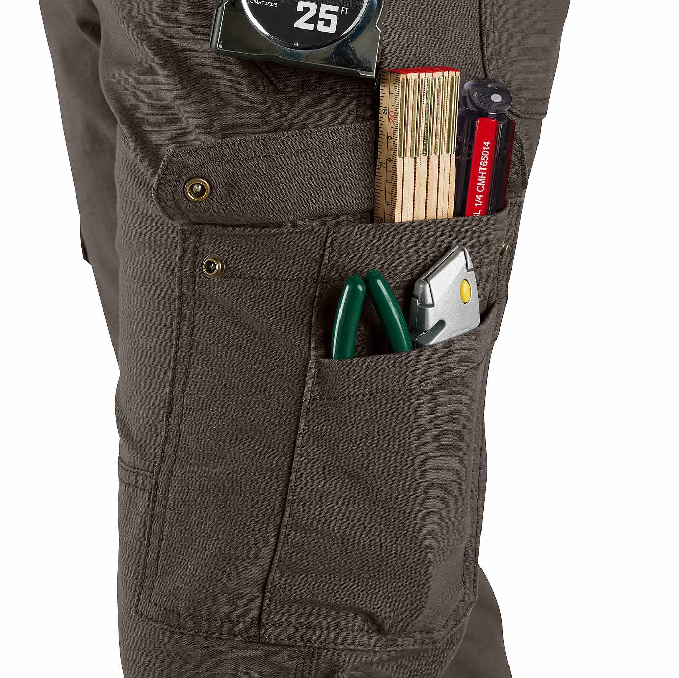 The toughest jobs call for the hardest working cargo work pants around. These men's cargo pants feature spacious, Cordura®-reinforced front ledge and back pockets, as well as numerous slide-in pockets and cargo pockets with snap button closures to keep your most essential tools and accessories secure and accessible. The relaxed fit and gusseted crotch offer even more room through the seat and thigh.