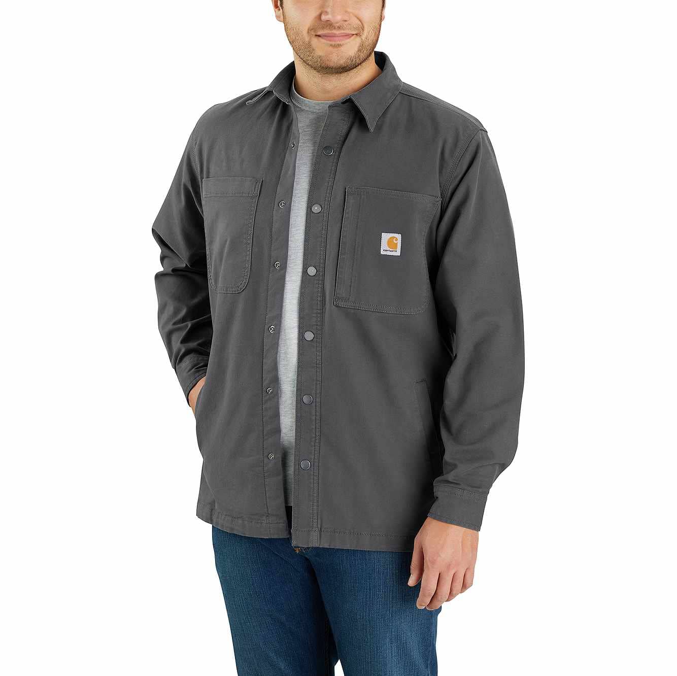 This men's snap-front shirt jac is warm enough to wear as a jacket on cool days. It's made of canvas with built-in flex to give you the range of motion you need on the job. A soft fleece lining defends against the cold. The relaxed-fit layer comes equipped with handwarmer pockets and a zip pocket for your wallet or keys.