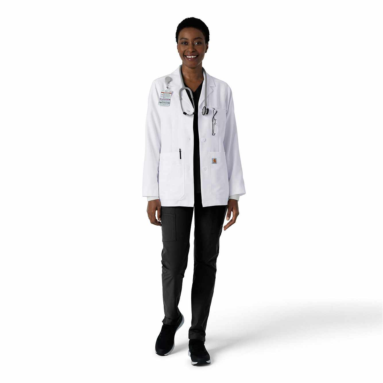 Look polished and professional with Carhartt's Women’s Consultation Lab Coat. Designed with the daily demands of healthcare in mind, this lab coat features durable twill fabric that’s tough yet soft to the touch. The narrow lapels add a refined touch, while the back vent and shoulder pleats ensure you move comfortably throughout your day. It’s built with practical details, like glove-friendly knit cuffs for quick on-and-off wear, a locker loop at the back neck, and plenty of pockets for essentials. With two top-loading pockets, a chest pocket, and additional interior pockets, you’ll have all your tools within easy reach. Plus, the side entry gives convenient access to pant pockets without compromising your look. Narrow lapels, locker loop at internal back neck, shoulder badge loop