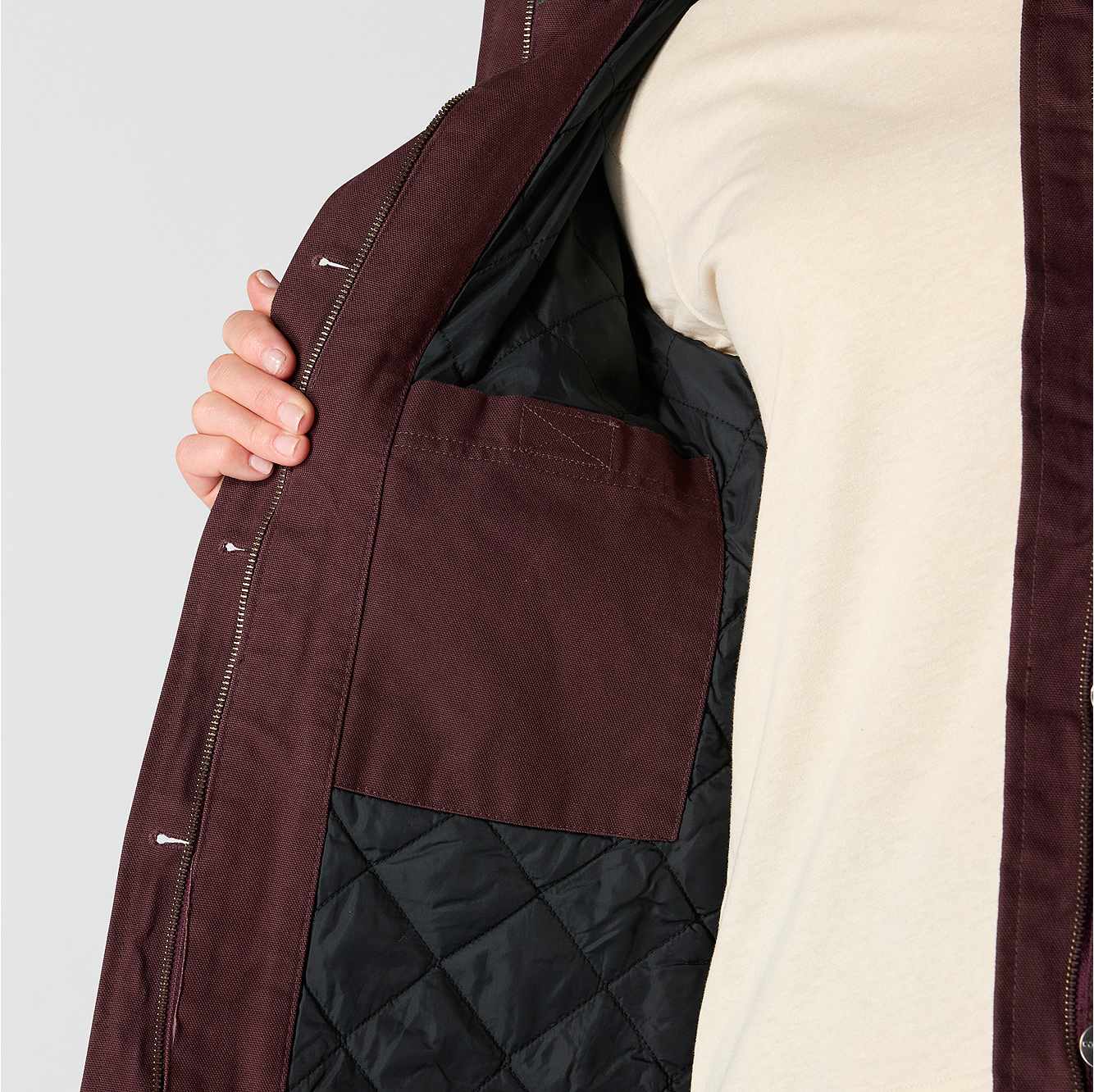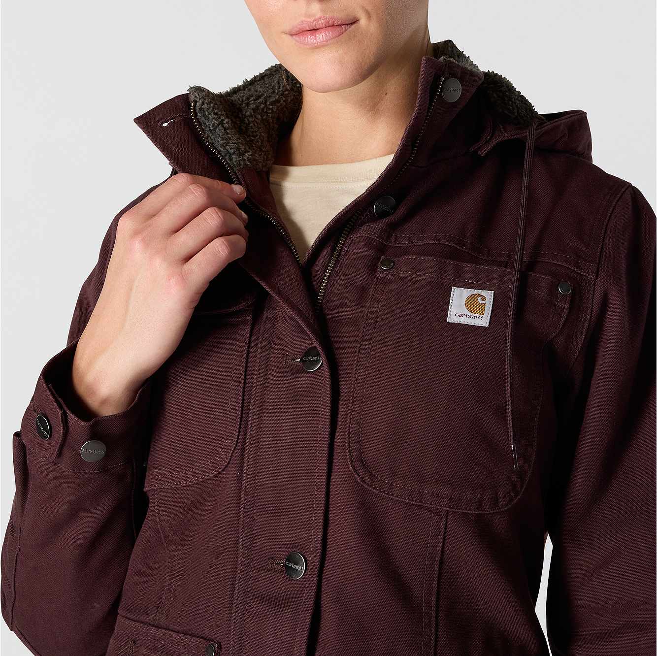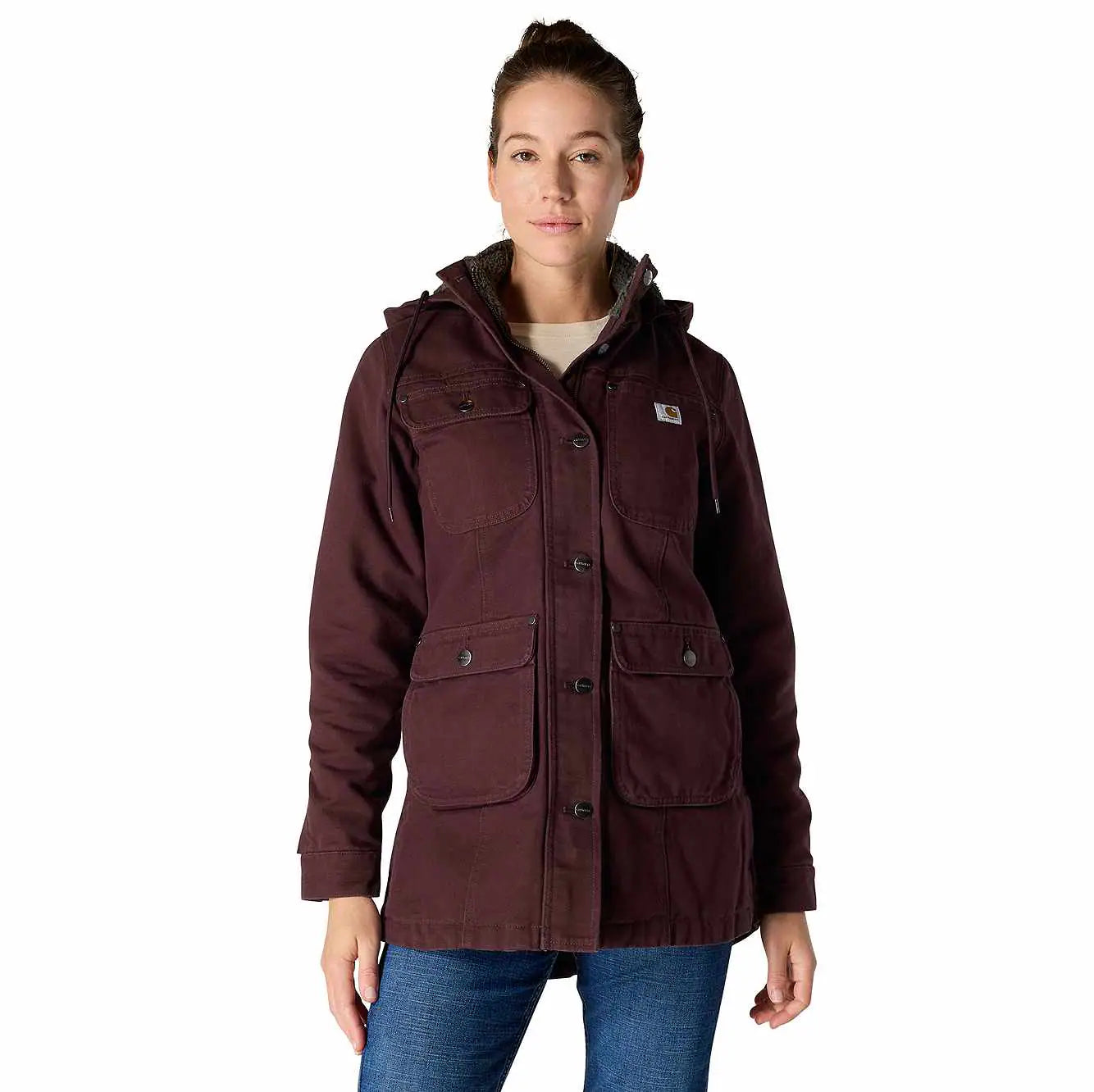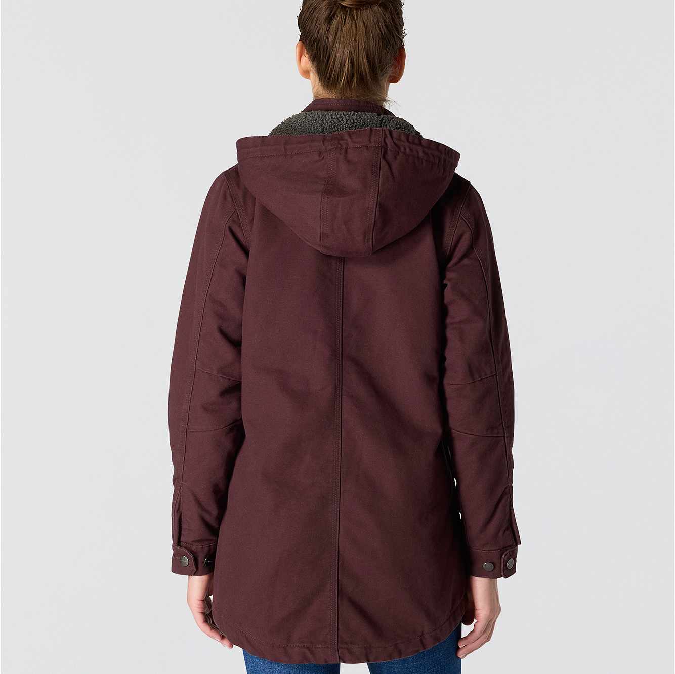 When the work won't wait for warmer weather, zip into this washed duck women's field jacket. Arctic-weight insulation and a sherpa-lined collar keep you warm in the barn or at the job site. The loose fit layers well over pullovers and heavy sweaters through the winter, and a quilted nylon lining makes for easy on and off. Wear it with or without the hood.