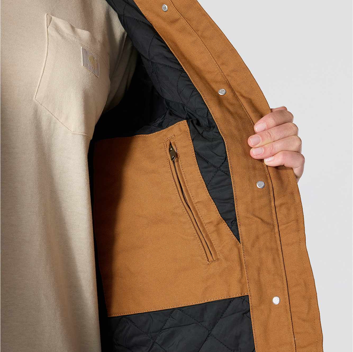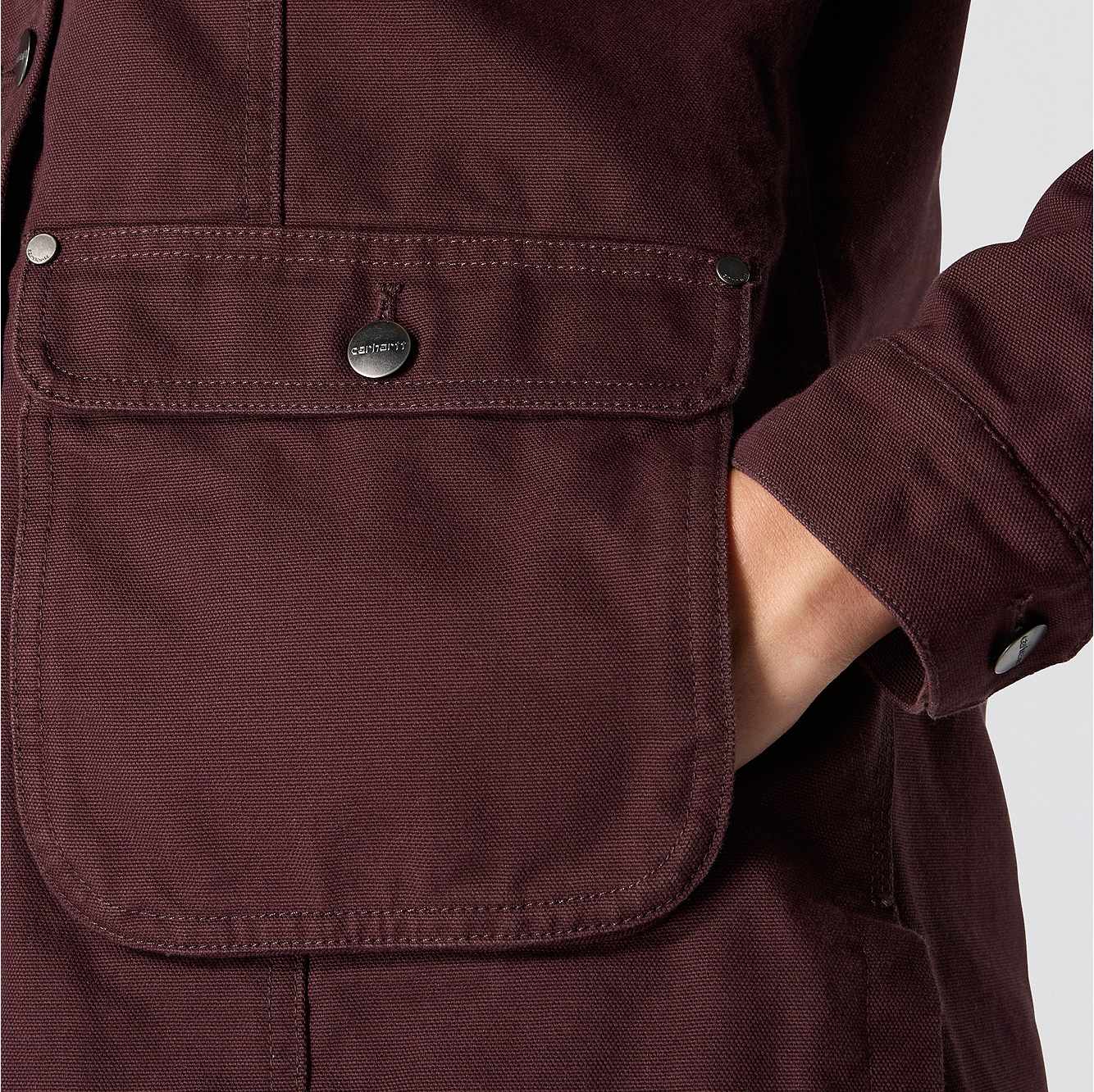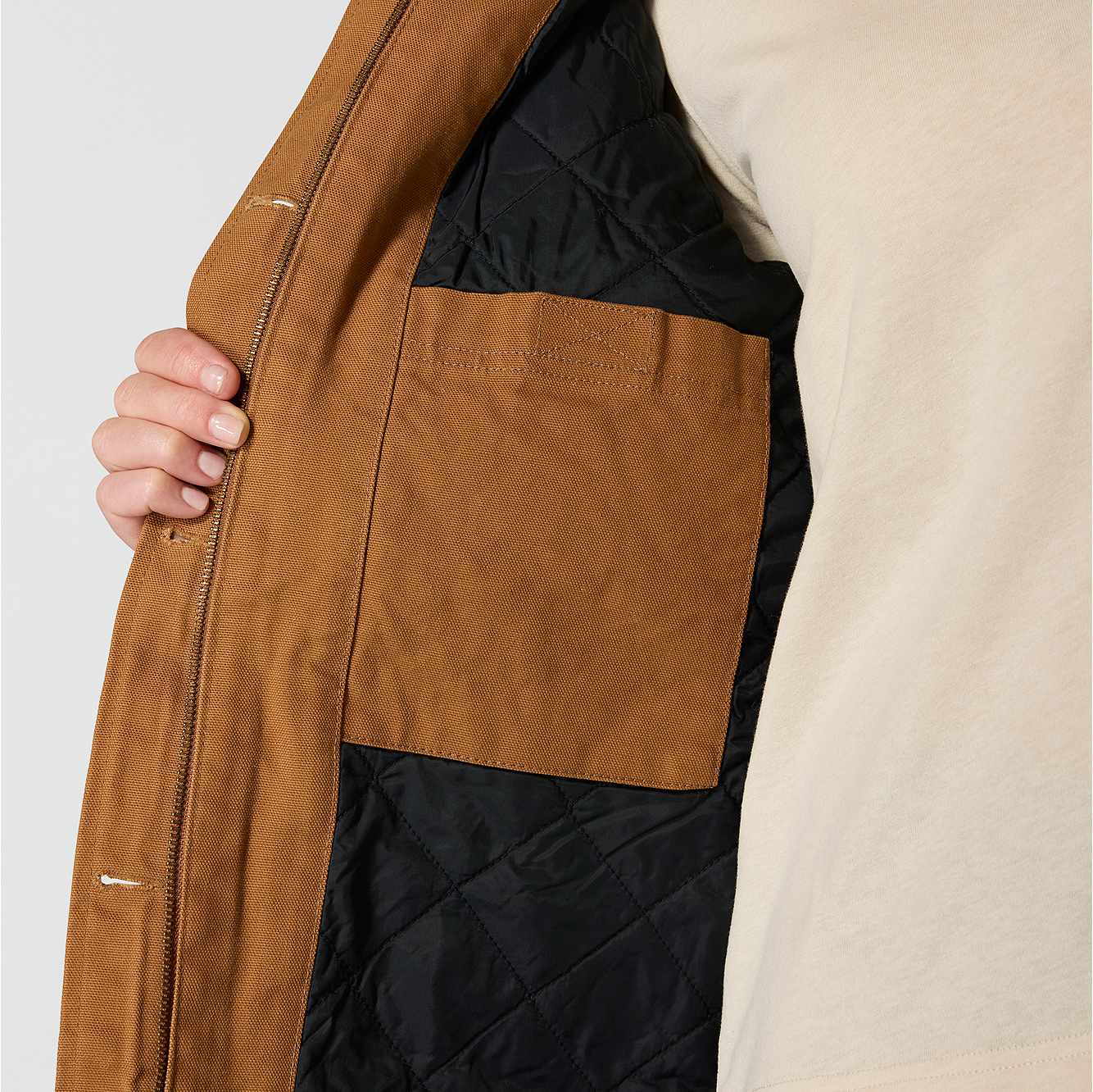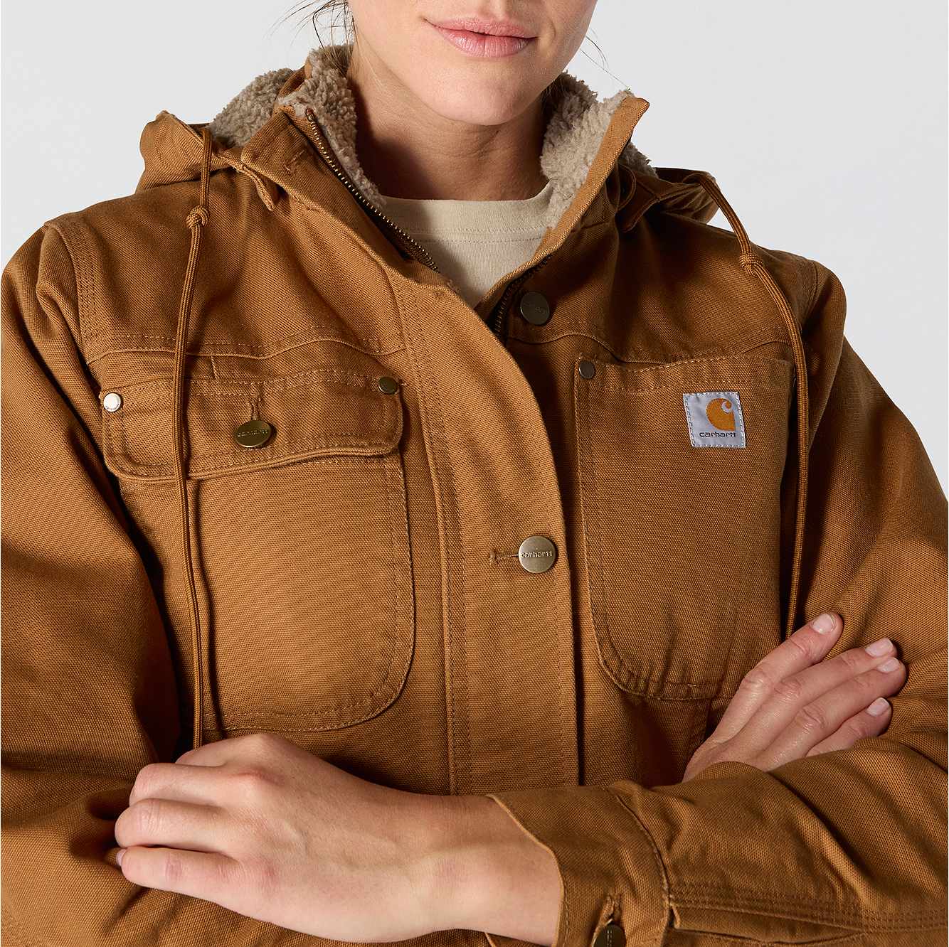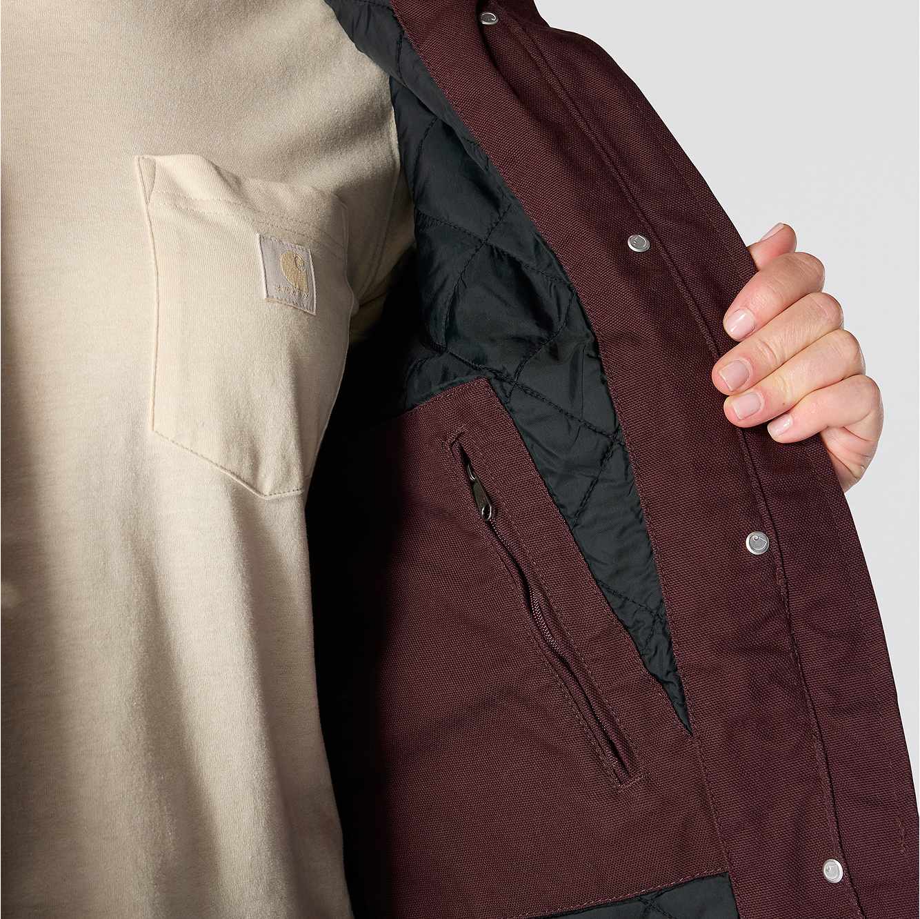 When the work won't wait for warmer weather, zip into this washed duck women's field jacket. Arctic-weight insulation and a sherpa-lined collar keep you warm in the barn or at the job site. The loose fit layers well over pullovers and heavy sweaters through the winter, and a quilted nylon lining makes for easy on and off. Wear it with or without the hood.