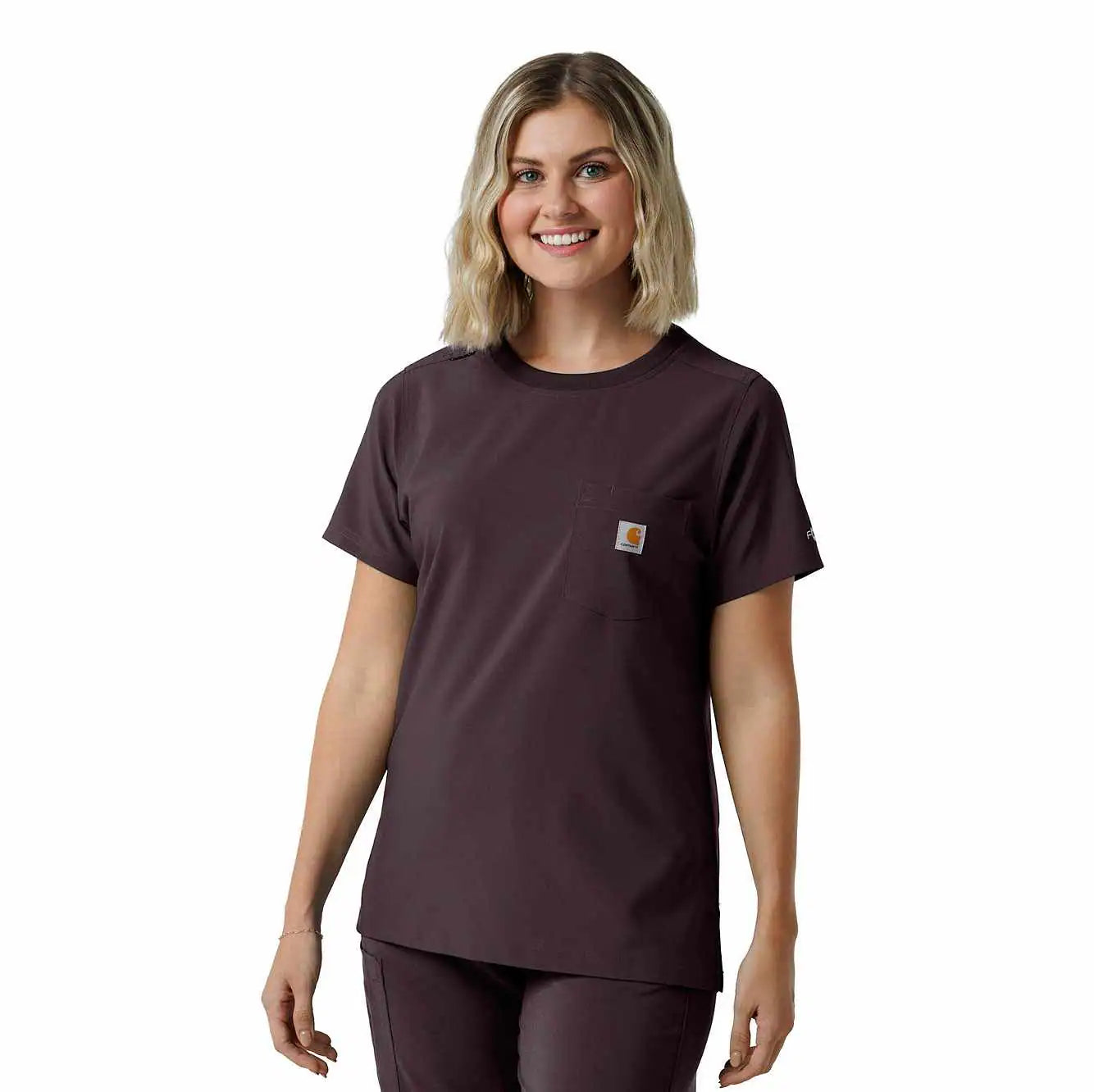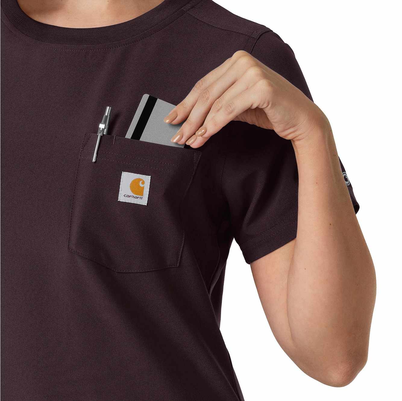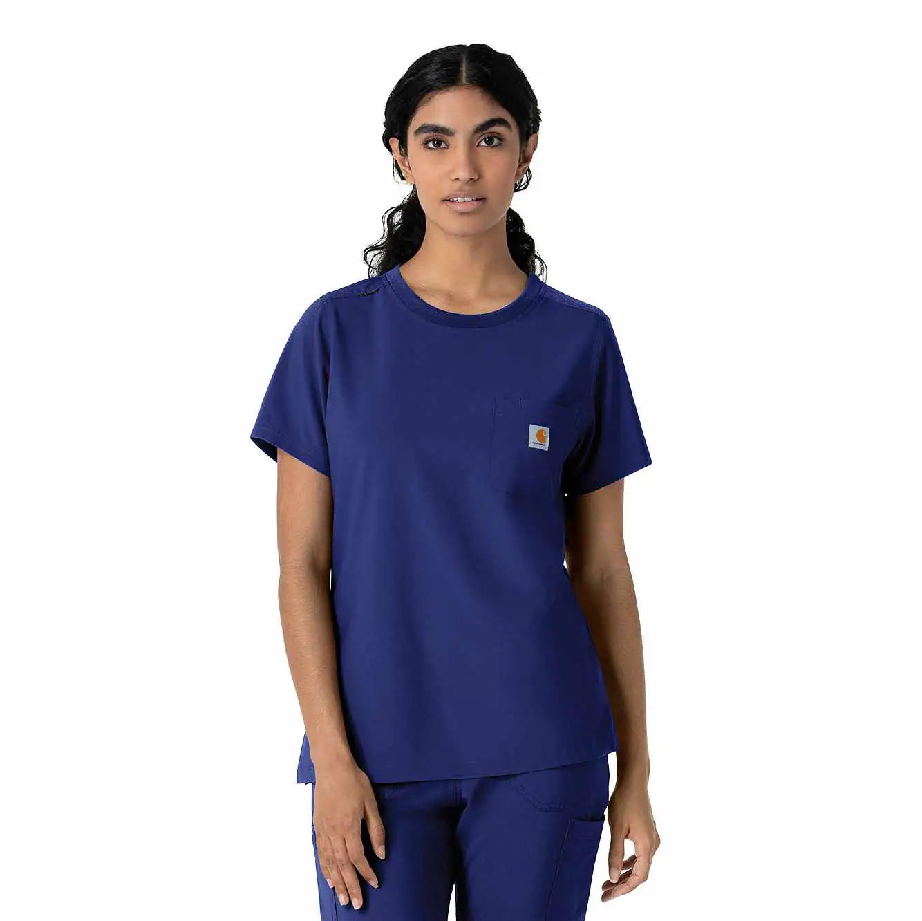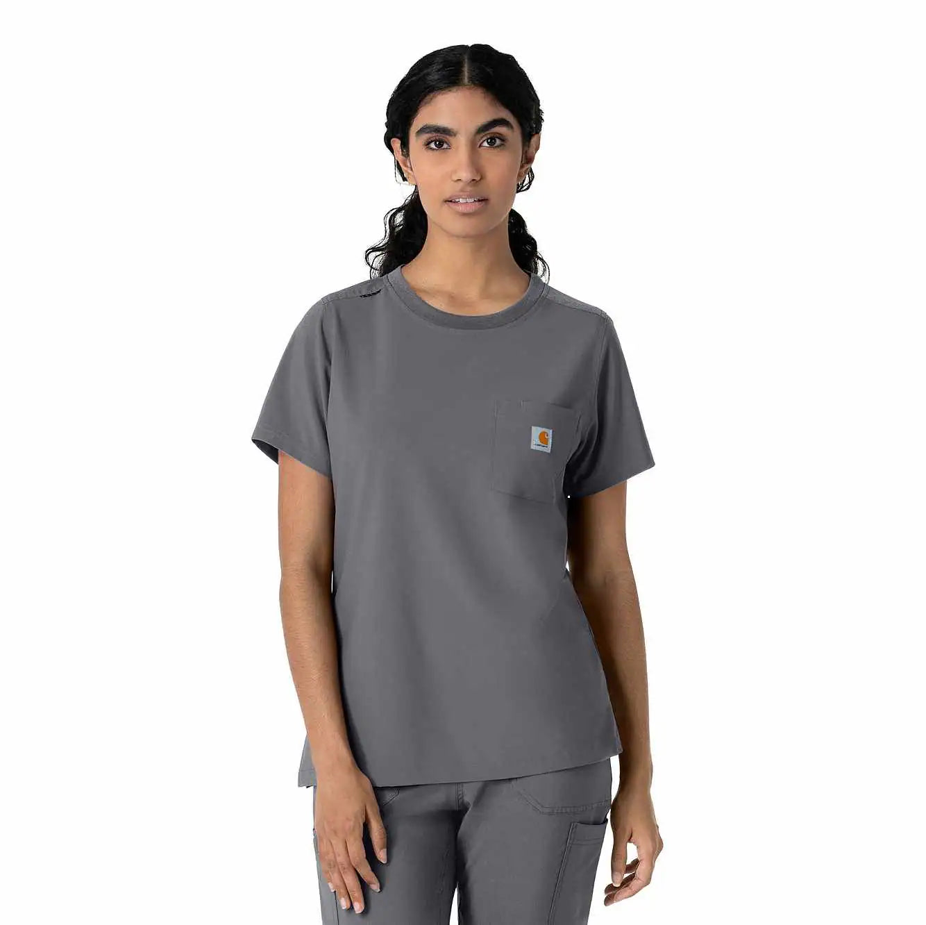 This women's Carhartt scrub top is the perfect blend of everyday comfort and rugged durability, designed to tackle the challenges of long, demanding shifts. It's crafted from a durable stretch polyester fabric that moves with you, providing the flexibility needed for dynamic work environments. The material is built to withstand the wear and tear of a busy workday, ensuring longevity and consistent performance. While it maintains the casual appearance of a classic t-shirt, this scrub top is packed with functional features. A secure zip pocket adds an extra layer of security for valuables. The integrated shoulder badge loop ensures your ID is always visible and readily accessible, streamlining identification procedures. This top is designed to keep you comfortable and organized throughout your shift.