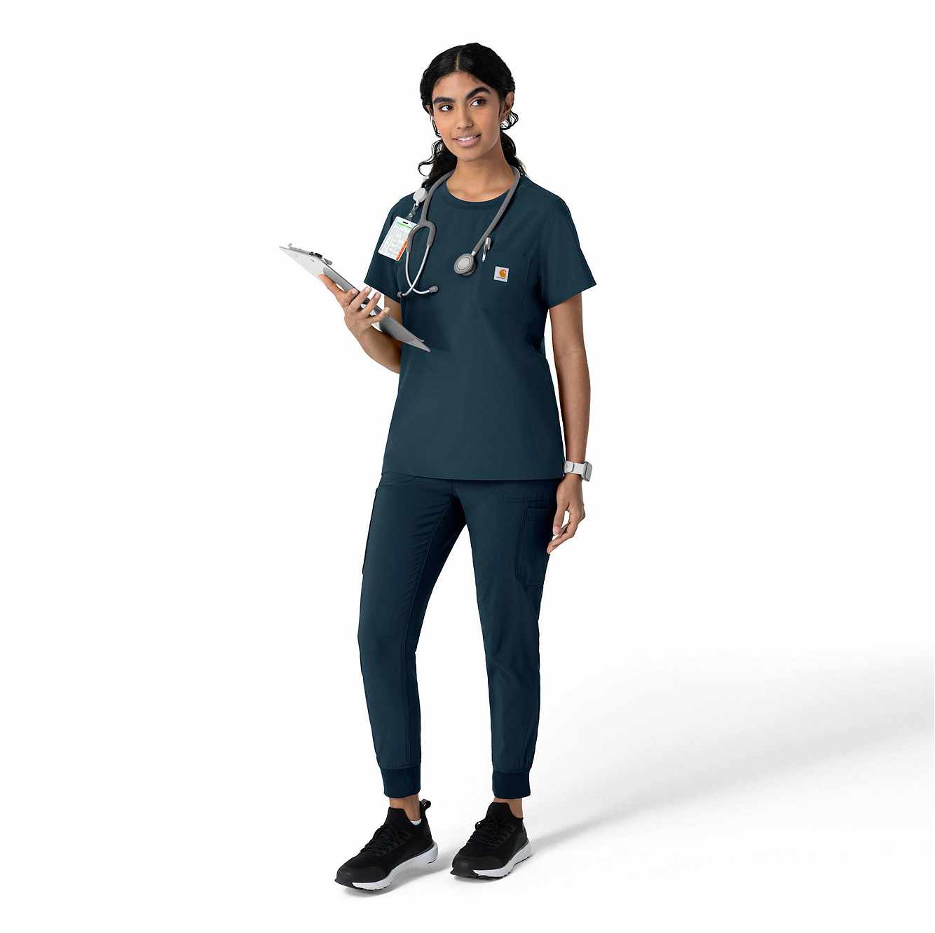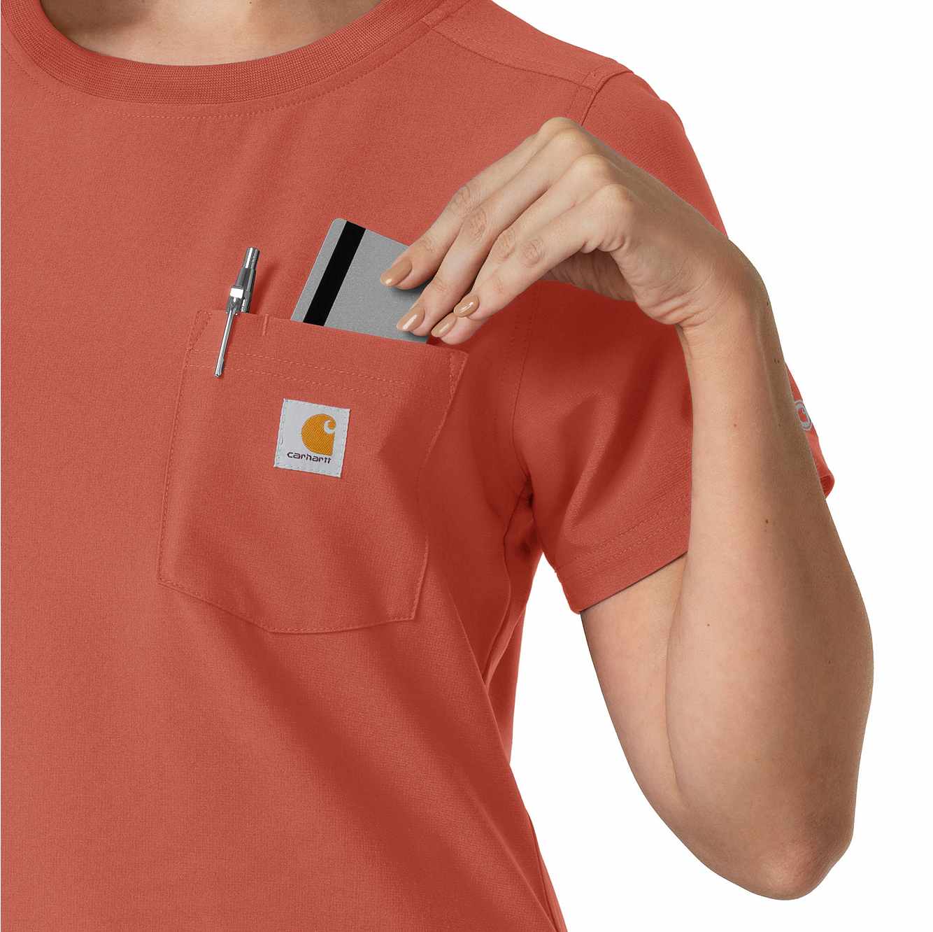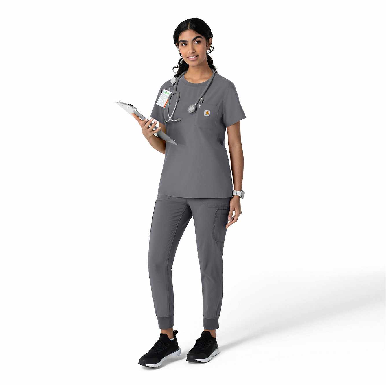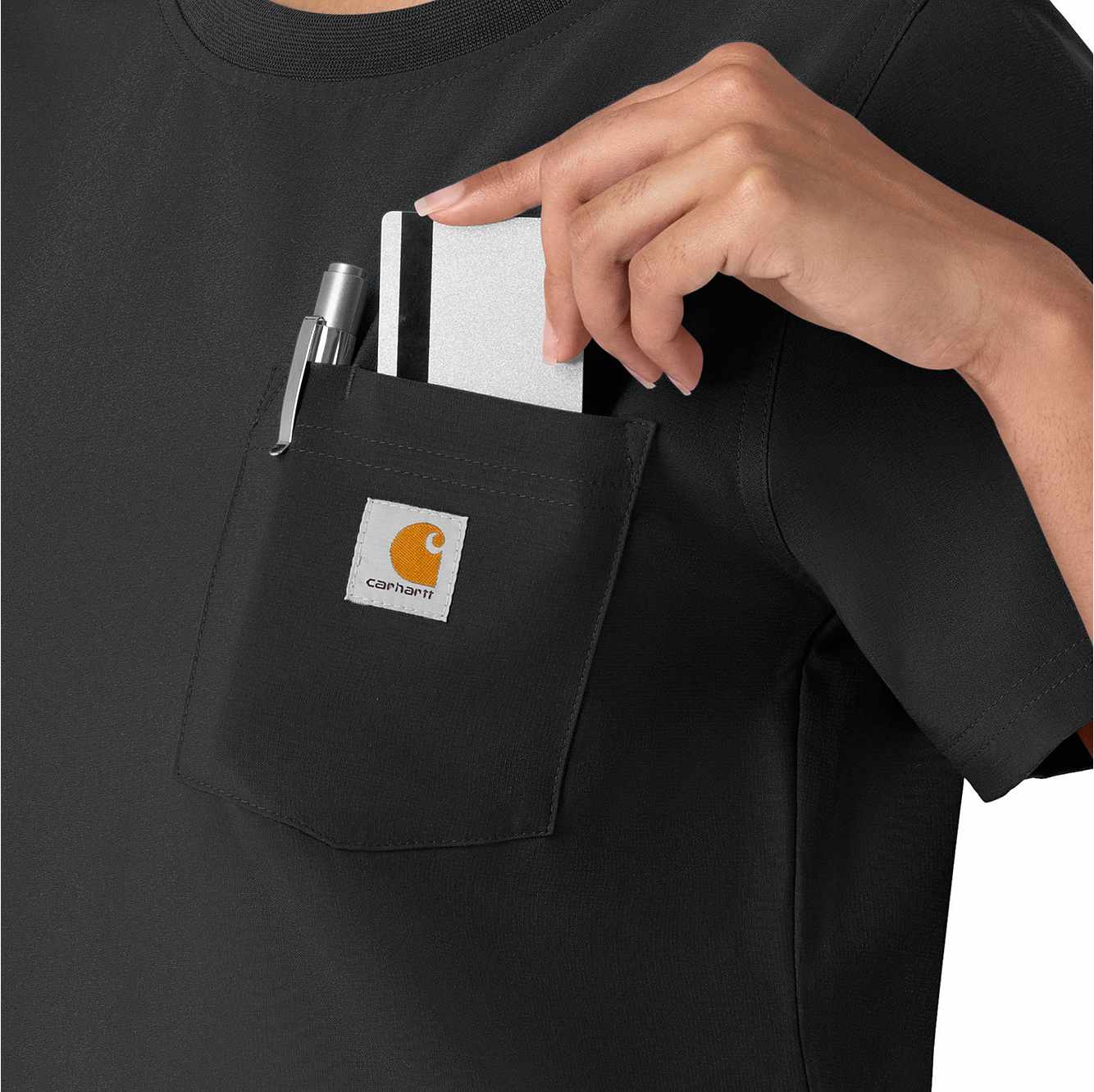 This women's Carhartt scrub top is the perfect blend of everyday comfort and rugged durability, designed to tackle the challenges of long, demanding shifts. It's crafted from a durable stretch polyester fabric that moves with you, providing the flexibility needed for dynamic work environments. The material is built to withstand the wear and tear of a busy workday, ensuring longevity and consistent performance. While it maintains the casual appearance of a classic t-shirt, this scrub top is packed with functional features. A secure zip pocket adds an extra layer of security for valuables. The integrated shoulder badge loop ensures your ID is always visible and readily accessible, streamlining identification procedures. This top is designed to keep you comfortable and organized throughout your shift.