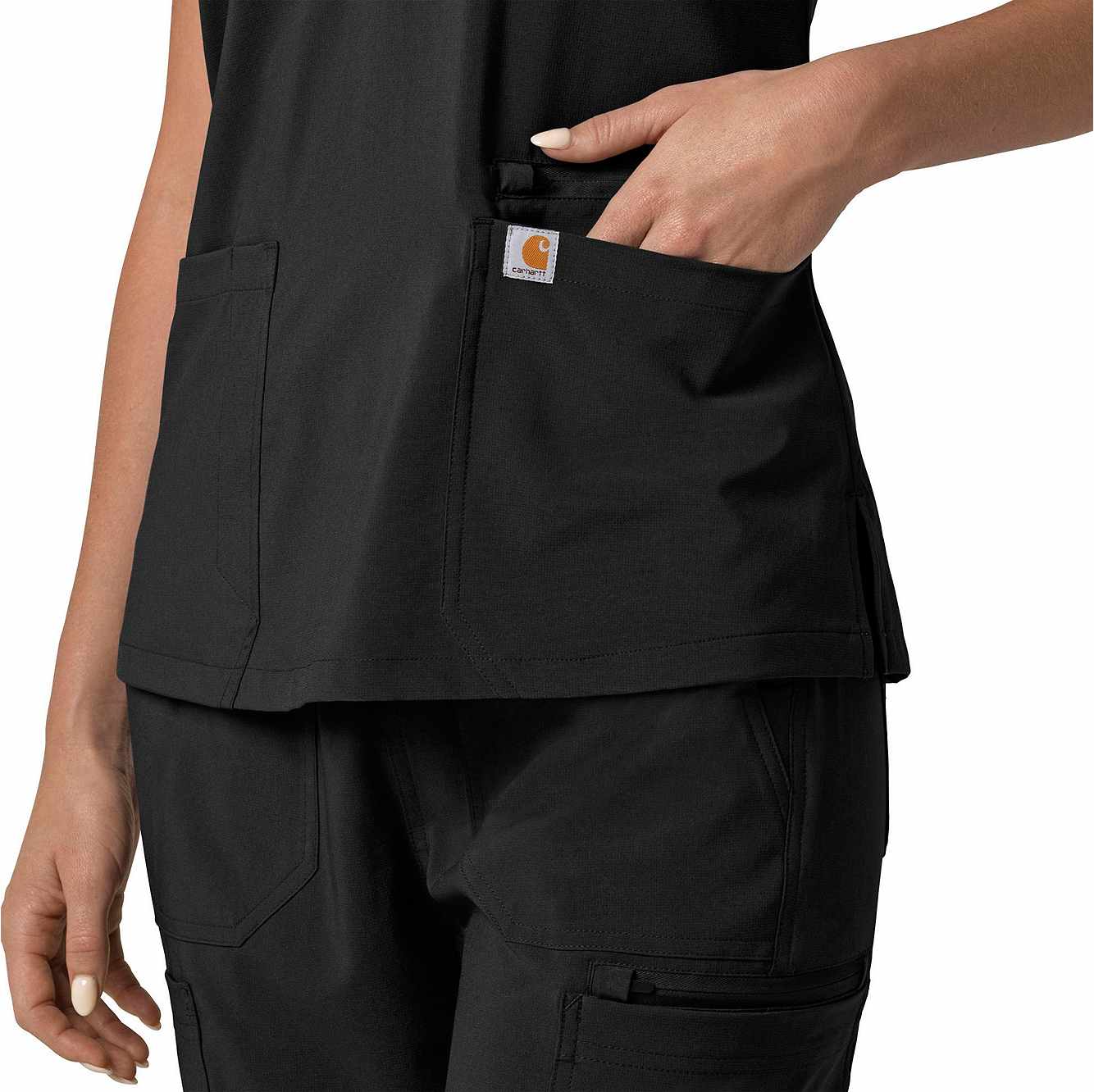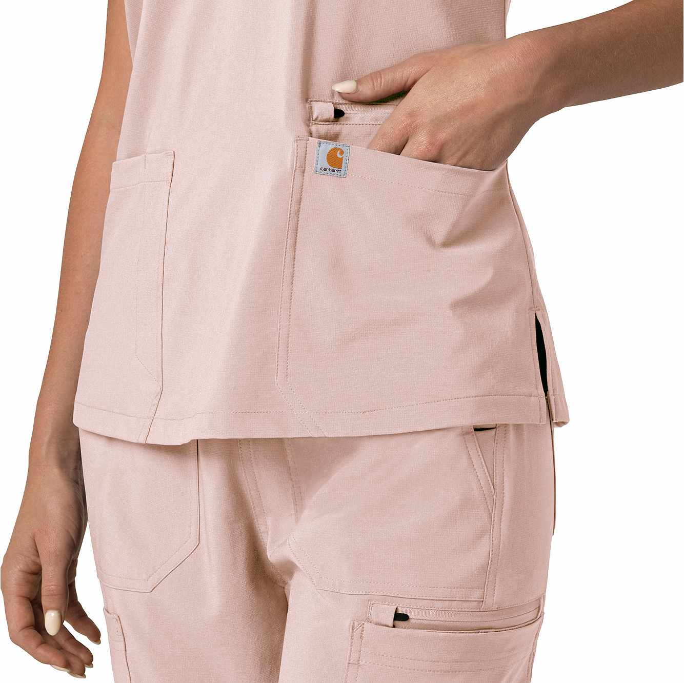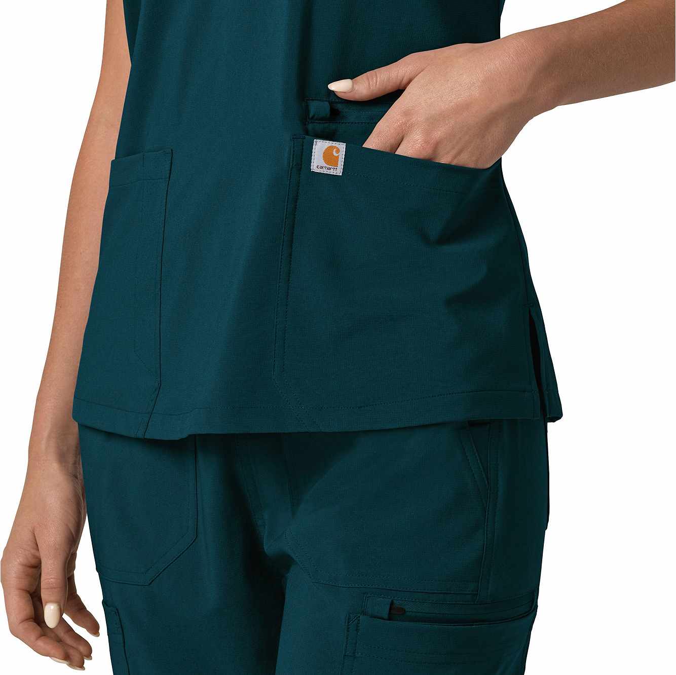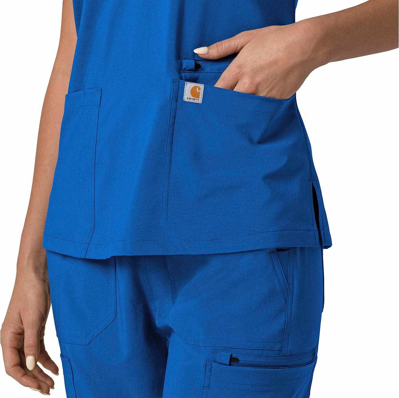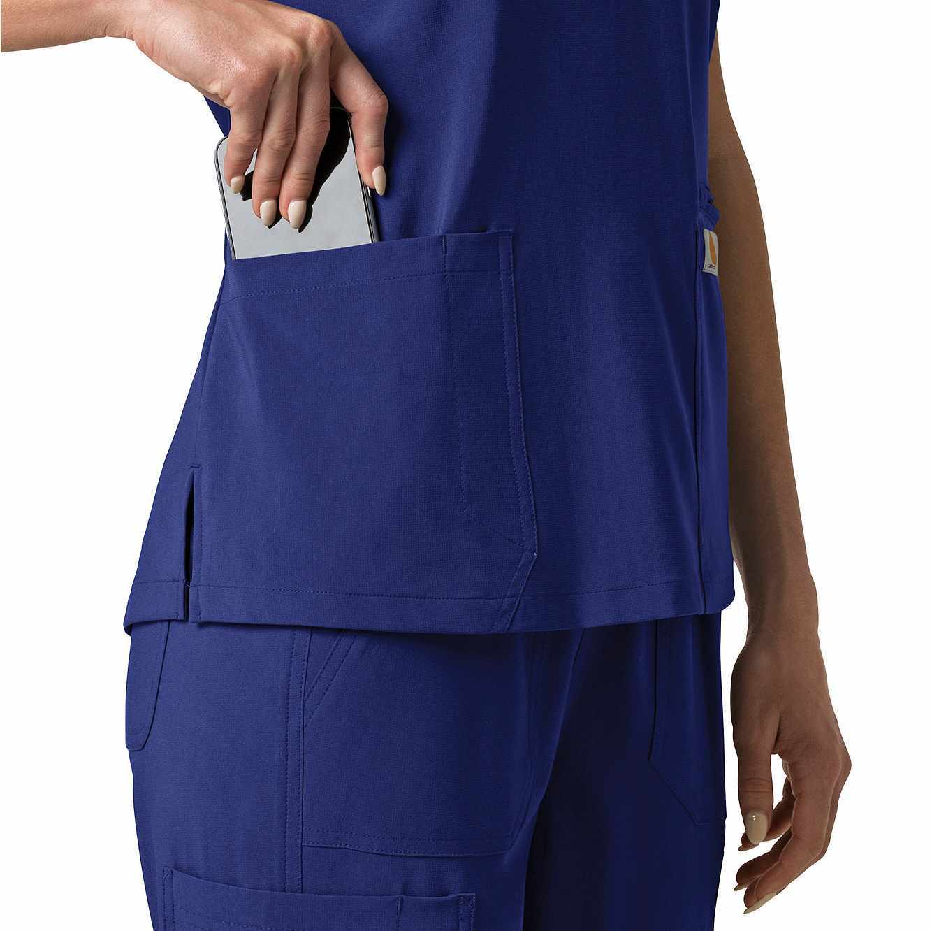The Carhartt Women's Flex Panel V-Neck Scrub Top, constructed from durable, comfortable polyester material with Carhartt's signature Rugged Flex™ stretch technology. This scrub top ensures unrestricted movement, no matter the task. The rib-knit inserts at the shoulders and sleeves, along with the racerback detail, provide the freedom to move with ease, making your job more manageable. Not only do these scrubs keep you comfortable, but they also enhance your productivity. Part of the Force Cross-Flex collection, they wick away sweat and dry quickly, ensuring you stay fresh and focused during every shift. With a V-neck design and convenient features like a shoulder badge loop, two spacious front patch pockets, a pen slot, and a zipped cell pocket, these scrubs are designed to make your life easier. Plus, side vents around the hips offer even more mobility. Choose the Carhartt Women's Flex Panel V-Neck Scrub Top and experience comfort, durability, and performance in one stylish package.