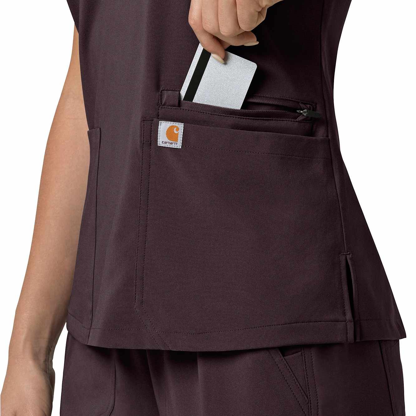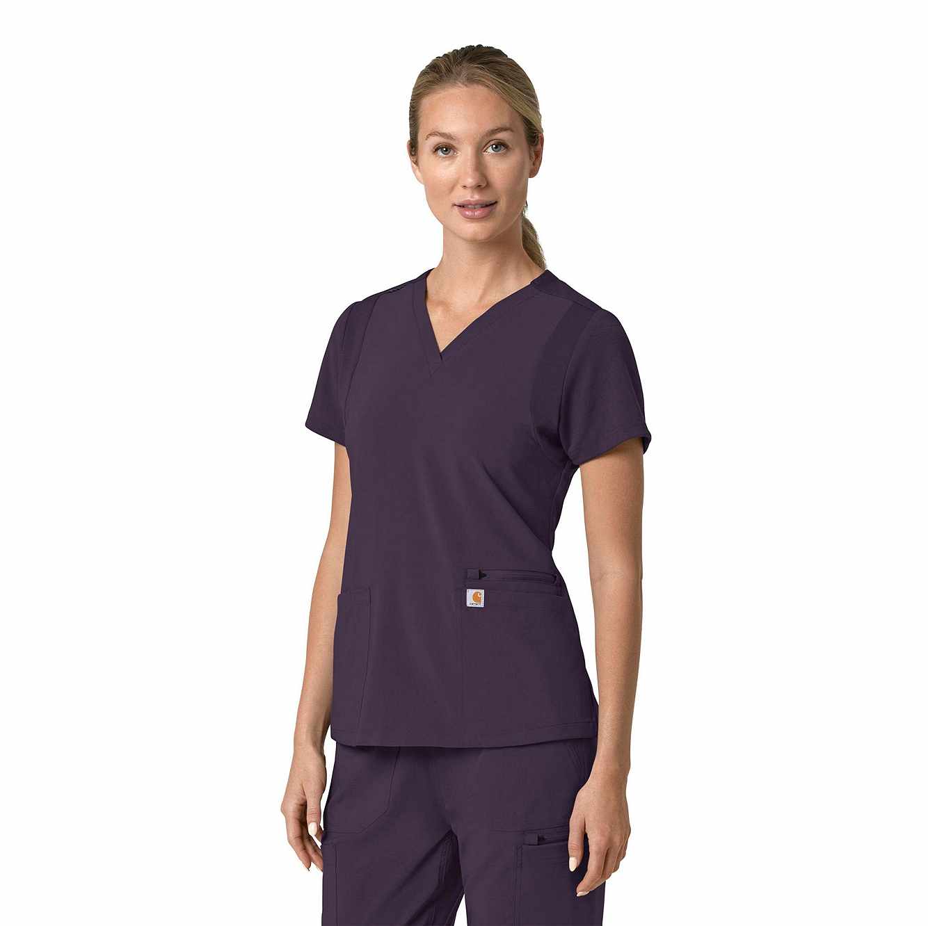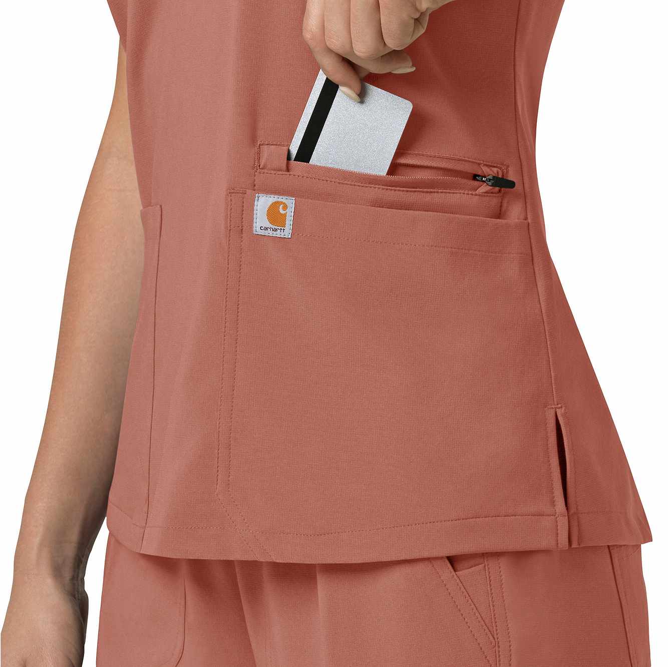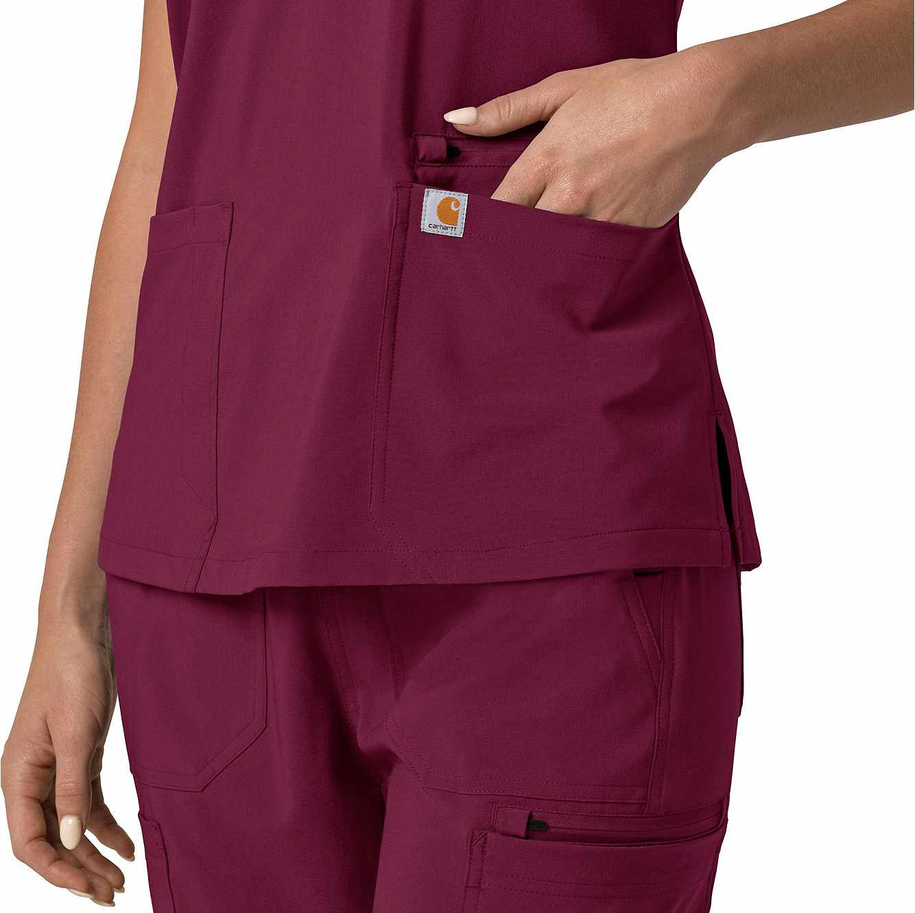 The Carhartt Women's Flex Panel V-Neck Scrub Top, constructed from durable, comfortable polyester material with Carhartt's signature Rugged Flex™ stretch technology. This scrub top ensures unrestricted movement, no matter the task. The rib-knit inserts at the shoulders and sleeves, along with the racerback detail, provide the freedom to move with ease, making your job more manageable. Not only do these scrubs keep you comfortable, but they also enhance your productivity. Part of the Force Cross-Flex collection, they wick away sweat and dry quickly, ensuring you stay fresh and focused during every shift. With a V-neck design and convenient features like a shoulder badge loop, two spacious front patch pockets, a pen slot, and a zipped cell pocket, these scrubs are designed to make your life easier. Plus, side vents around the hips offer even more mobility. Choose the Carhartt Women's Flex Panel V-Neck Scrub Top and experience comfort, durability, and performance in one stylish package.
