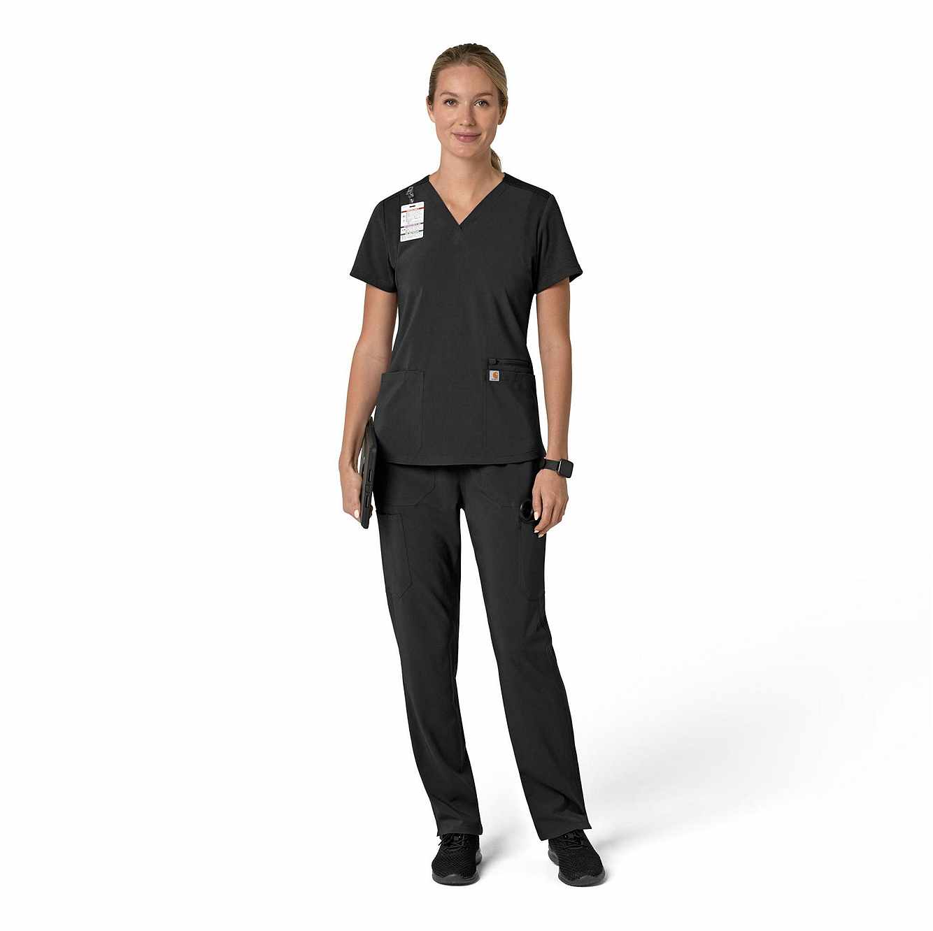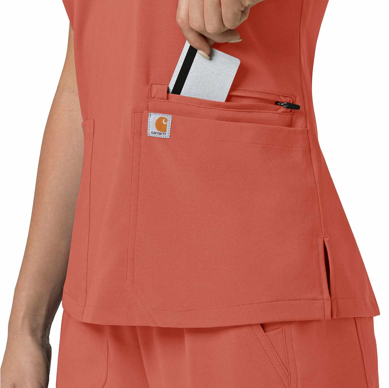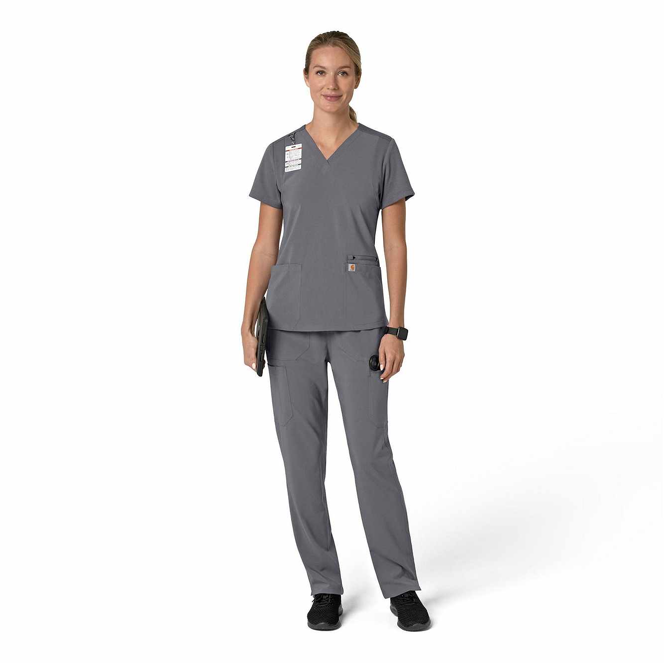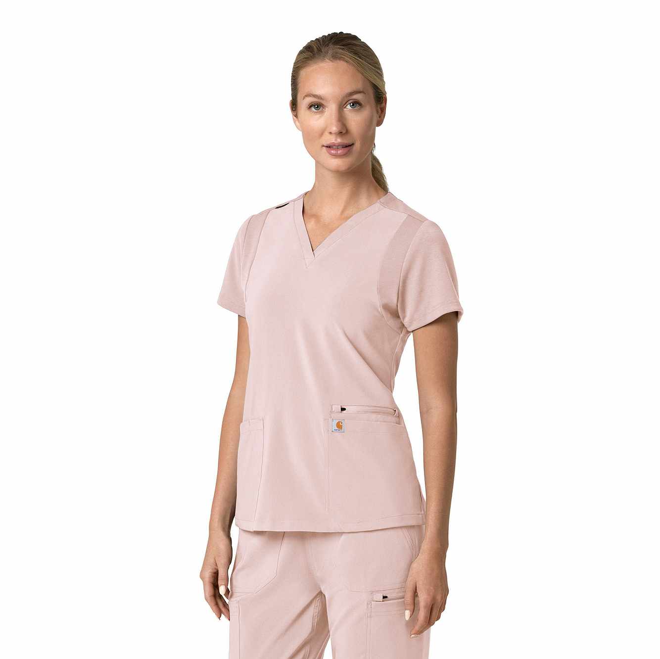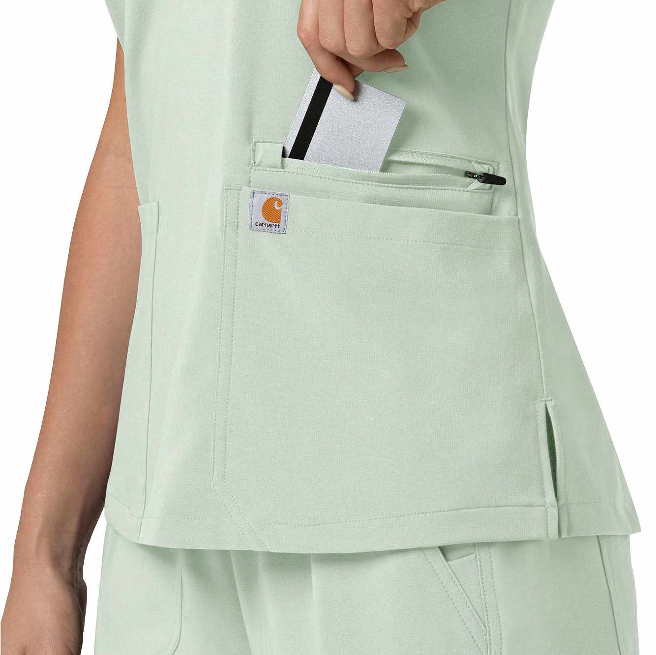 The Carhartt Women's Flex Panel V-Neck Scrub Top, constructed from durable, comfortable polyester material with Carhartt's signature Rugged Flex™ stretch technology. This scrub top ensures unrestricted movement, no matter the task. The rib-knit inserts at the shoulders and sleeves, along with the racerback detail, provide the freedom to move with ease, making your job more manageable. Not only do these scrubs keep you comfortable, but they also enhance your productivity. Part of the Force Cross-Flex collection, they wick away sweat and dry quickly, ensuring you stay fresh and focused during every shift. With a V-neck design and convenient features like a shoulder badge loop, two spacious front patch pockets, a pen slot, and a zipped cell pocket, these scrubs are designed to make your life easier. Plus, side vents around the hips offer even more mobility. Choose the Carhartt Women's Flex Panel V-Neck Scrub Top and experience comfort, durability, and performance in one stylish package.