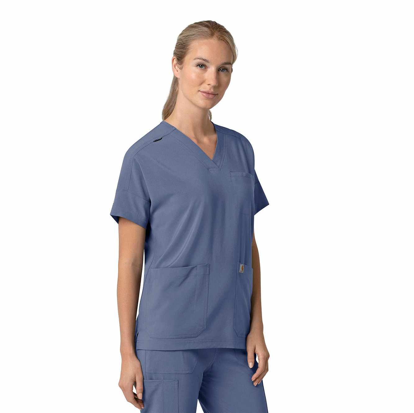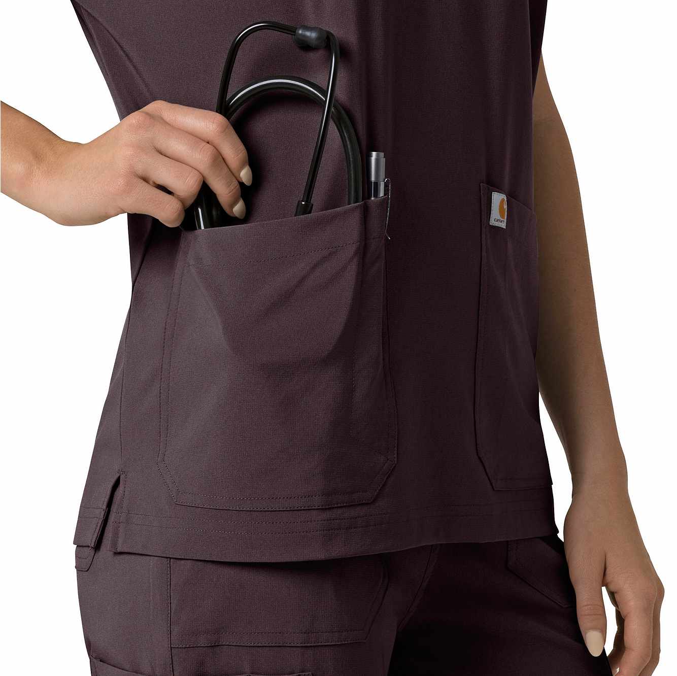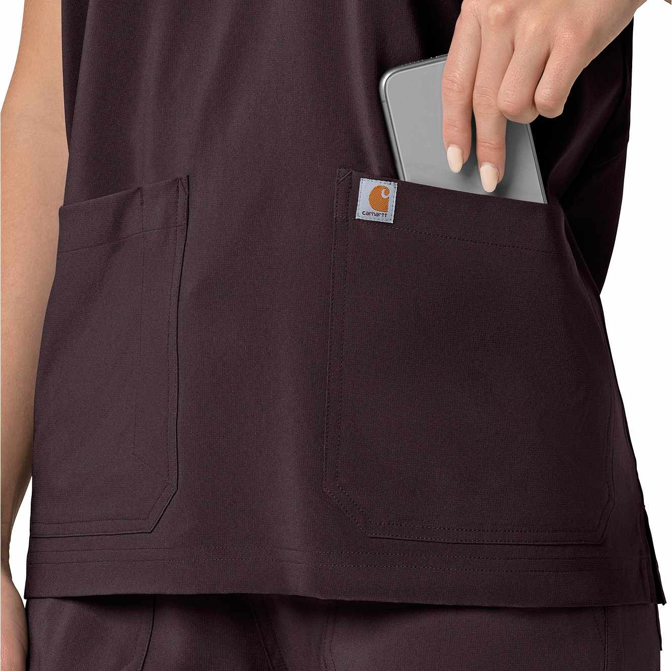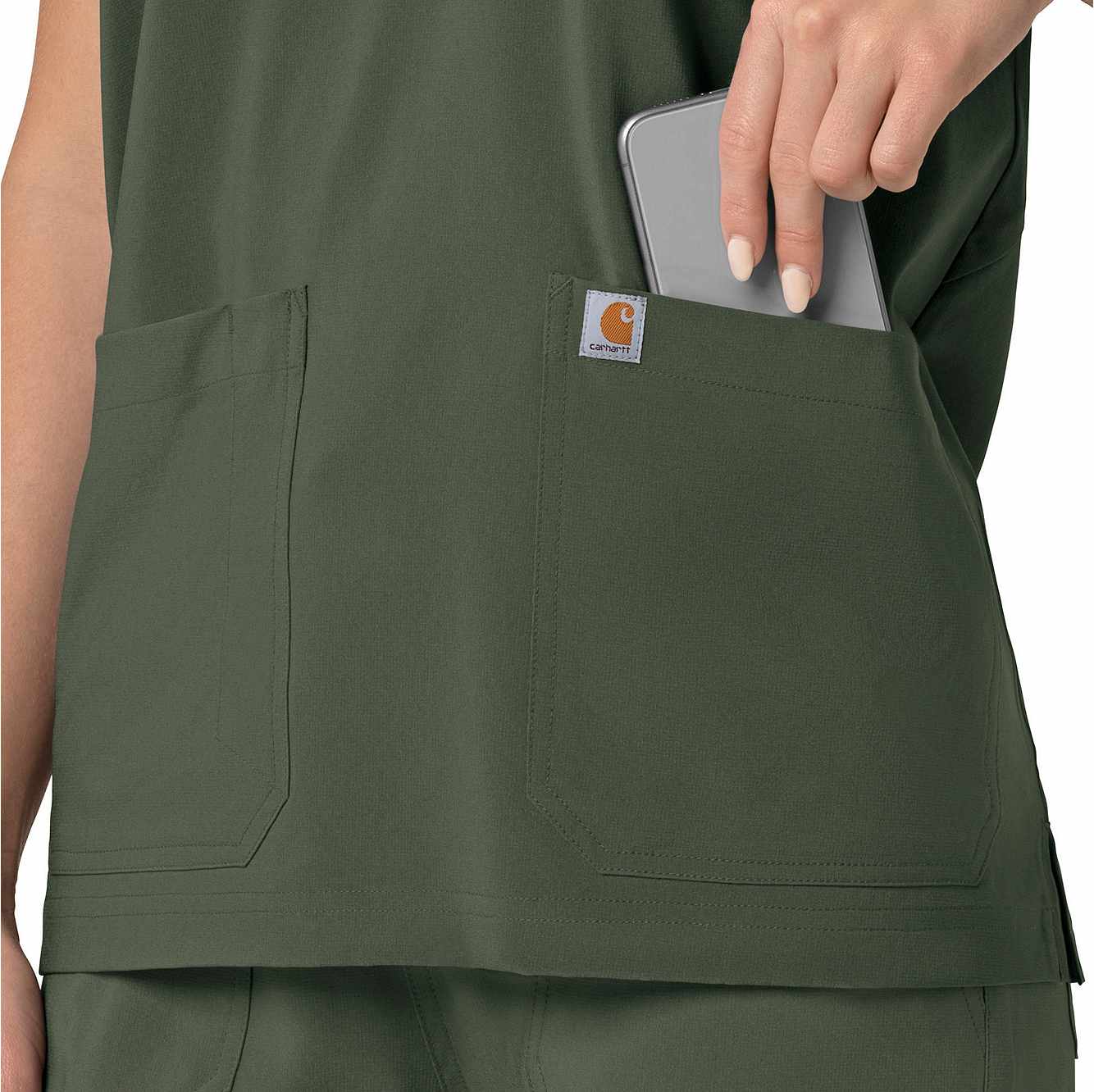 Step into your workday with confidence in the Carhartt Women's Oversized V-Neck Scrub Top. Engineered for healthcare professionals, this scrub top combines style and functionality. The curved V-neck with slim binding and a shoulder badge loop adds a touch of sophistication, while the vented yoke ensures breathability during long shifts. Practicality meets convenience with features like a welt chest pocket, two front top load pockets, a mesh cellphone pocket, and a pen slot. The racerback detail and box pleat at the back provide ease of movement, ensuring you're ready for any task. The straight hem at the front and slightly curved back, along with side vents, create a flattering silhouette. Crafted from a durable and comfortable polyester-spandex blend, this scrub top is not only reliable but also equipped with FastDry® technology to keep you dry under pressure. Elevate your professional look and excel on every shift with Carhartt's Force Cross-Flex collection.