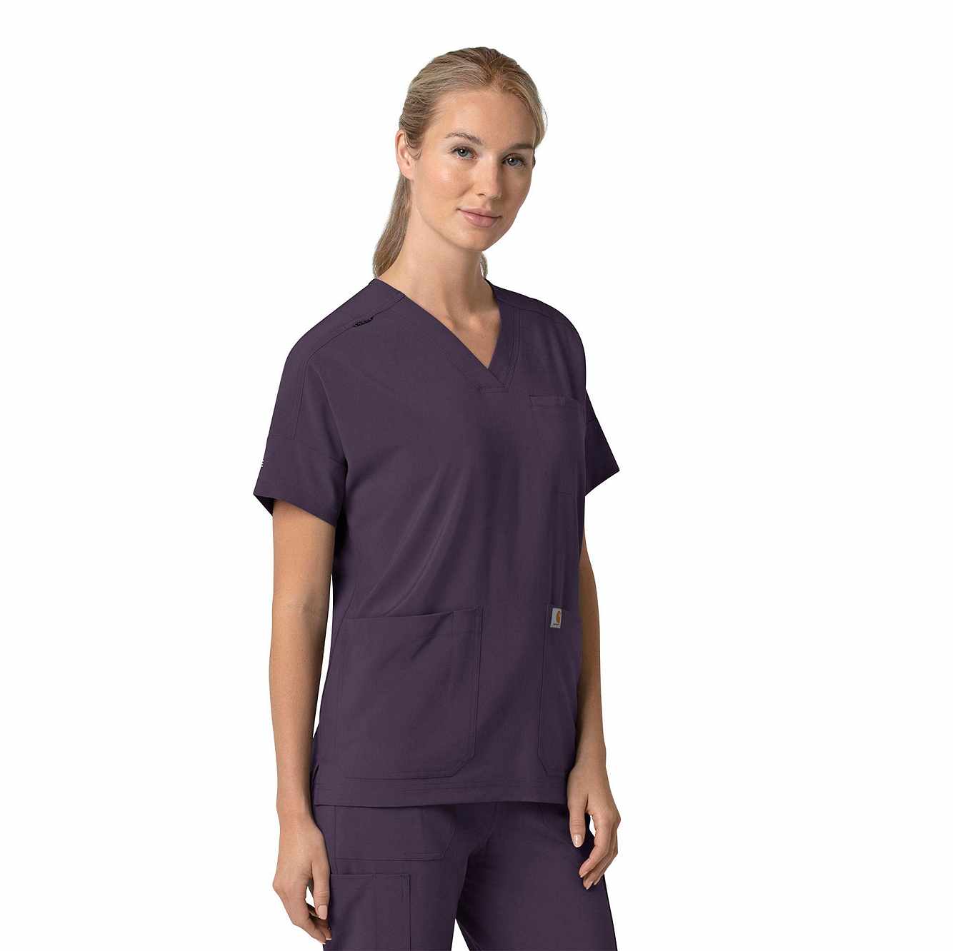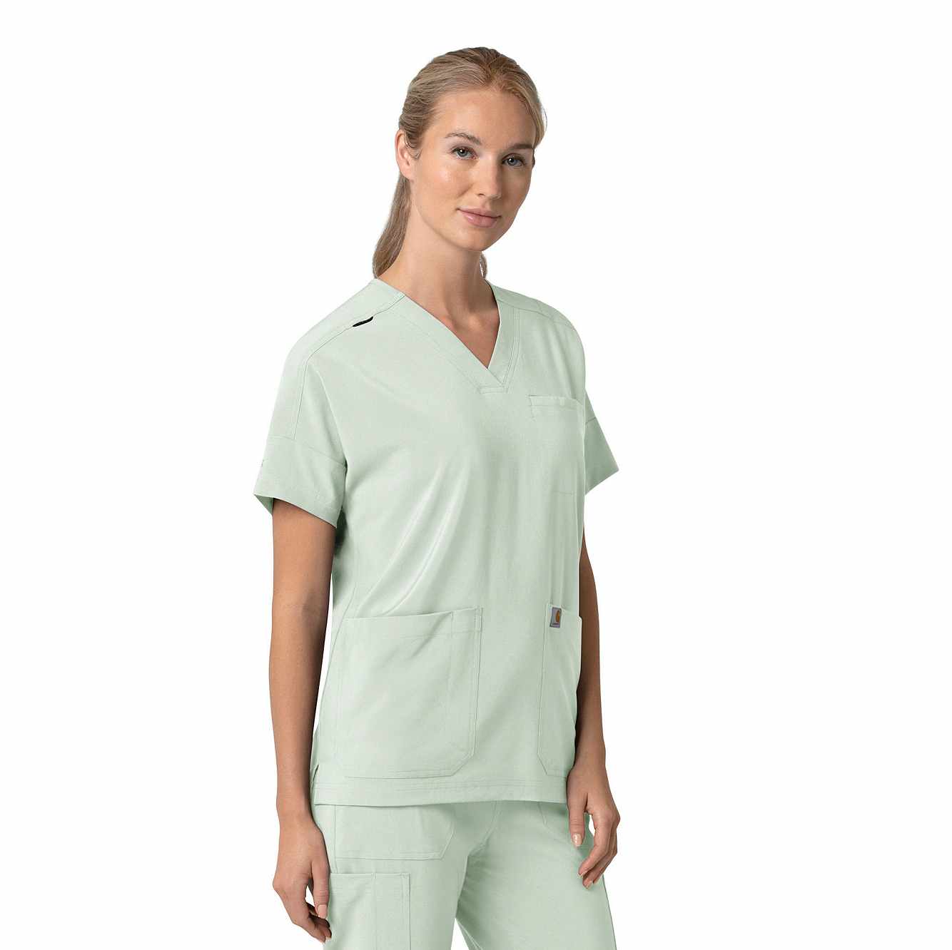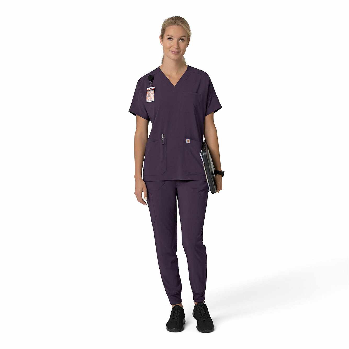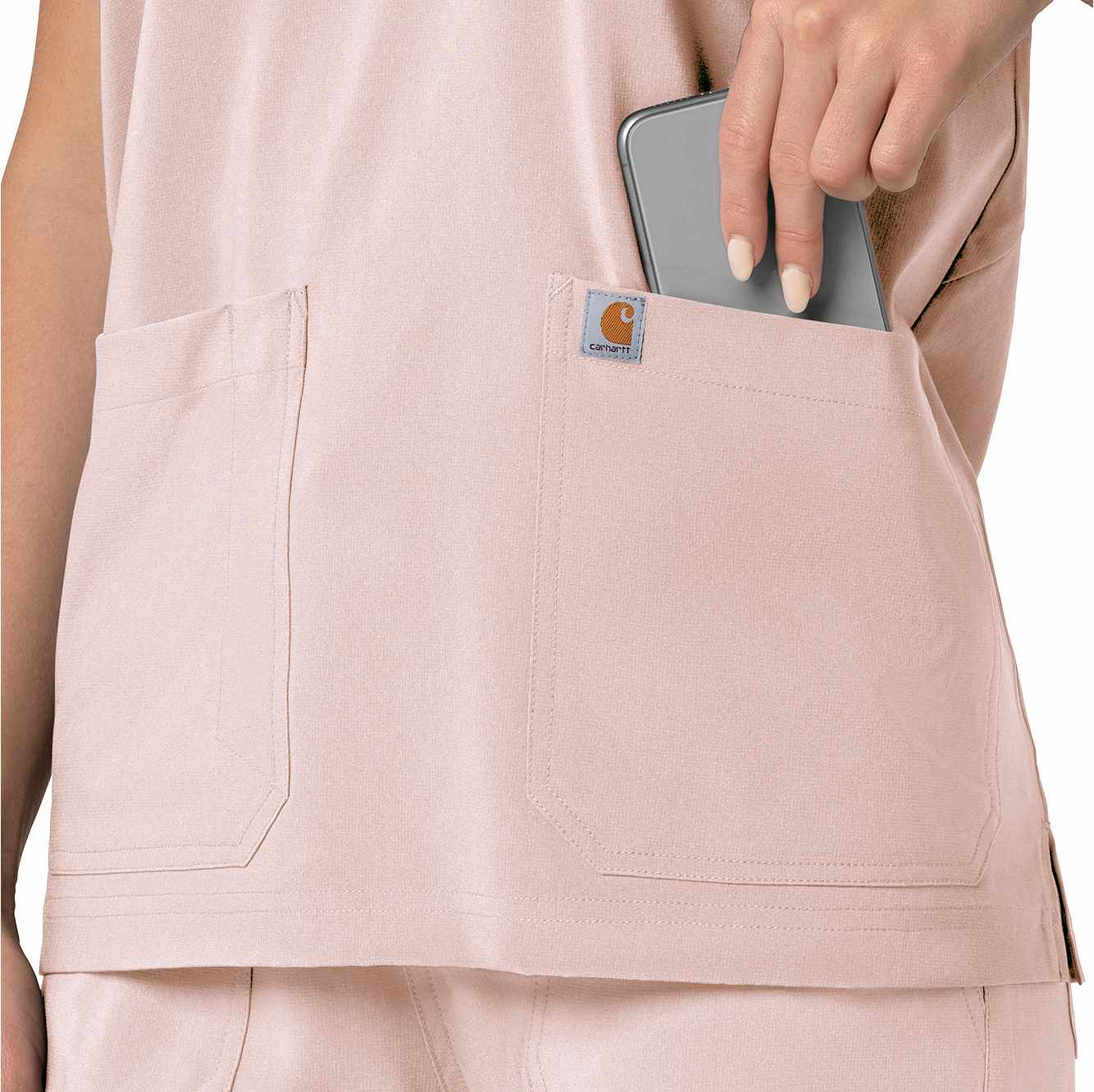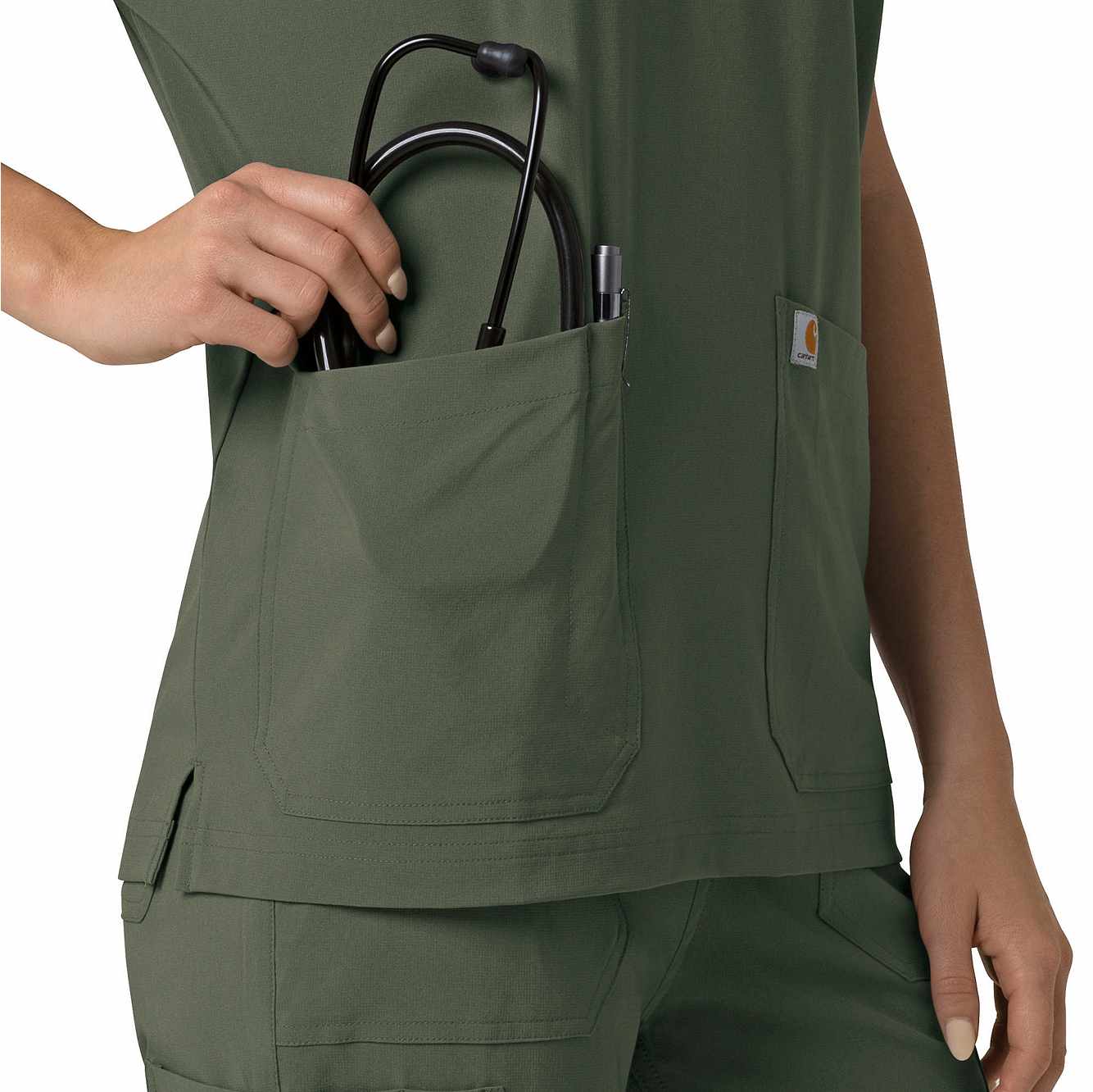 Step into your workday with confidence in the Carhartt Women's Oversized V-Neck Scrub Top. Engineered for healthcare professionals, this scrub top combines style and functionality. The curved V-neck with slim binding and a shoulder badge loop adds a touch of sophistication, while the vented yoke ensures breathability during long shifts. Practicality meets convenience with features like a welt chest pocket, two front top load pockets, a mesh cellphone pocket, and a pen slot. The racerback detail and box pleat at the back provide ease of movement, ensuring you're ready for any task. The straight hem at the front and slightly curved back, along with side vents, create a flattering silhouette. Crafted from a durable and comfortable polyester-spandex blend, this scrub top is not only reliable but also equipped with FastDry® technology to keep you dry under pressure. Elevate your professional look and excel on every shift with Carhartt's Force Cross-Flex collection.