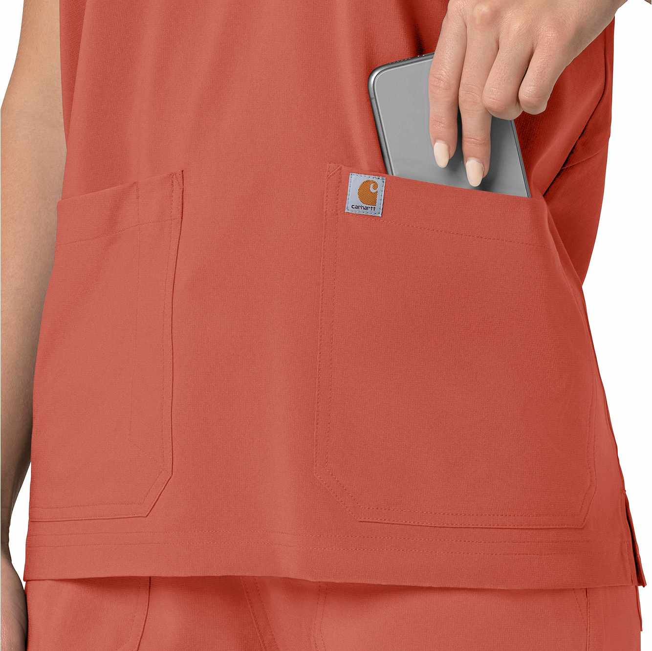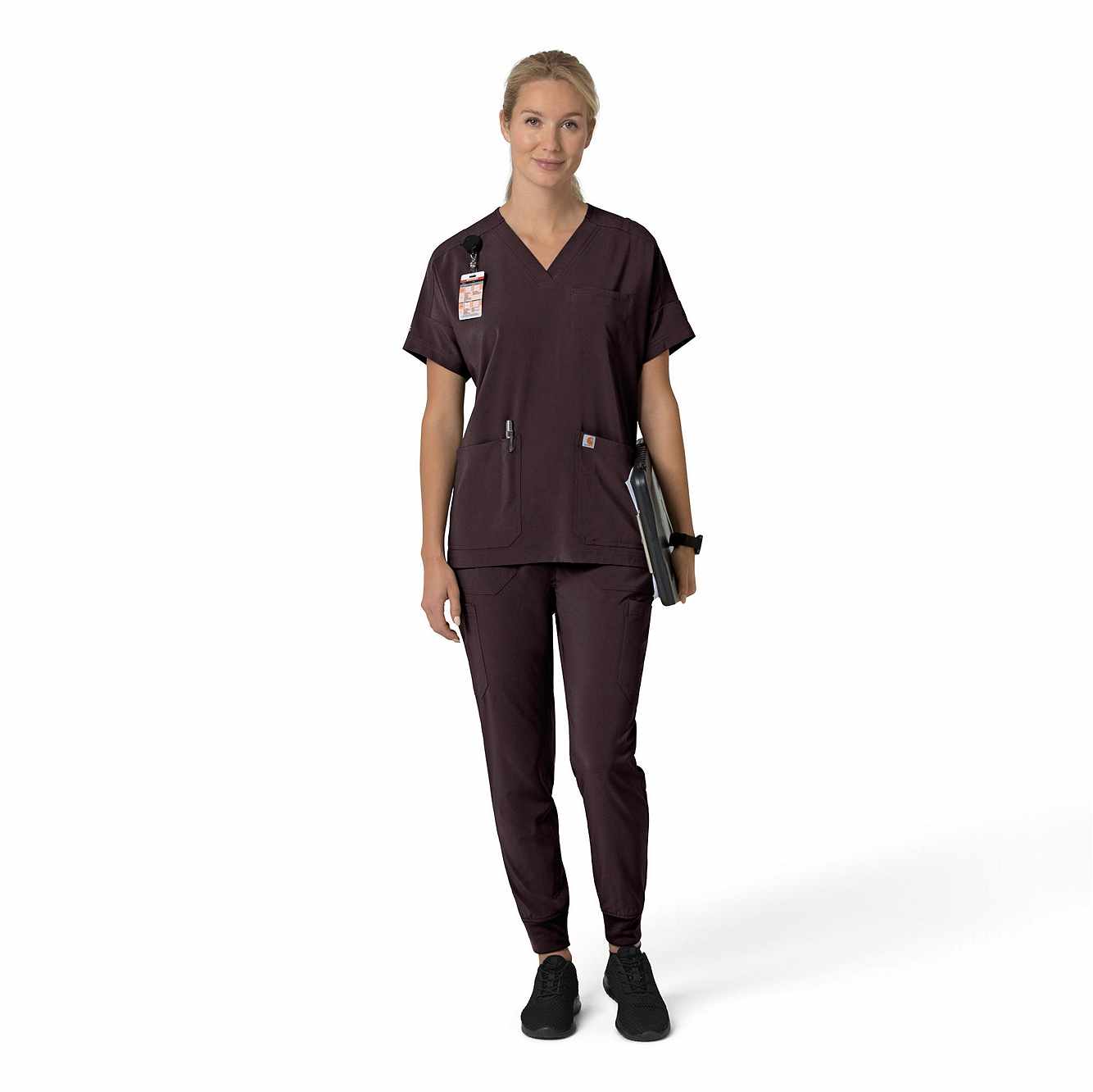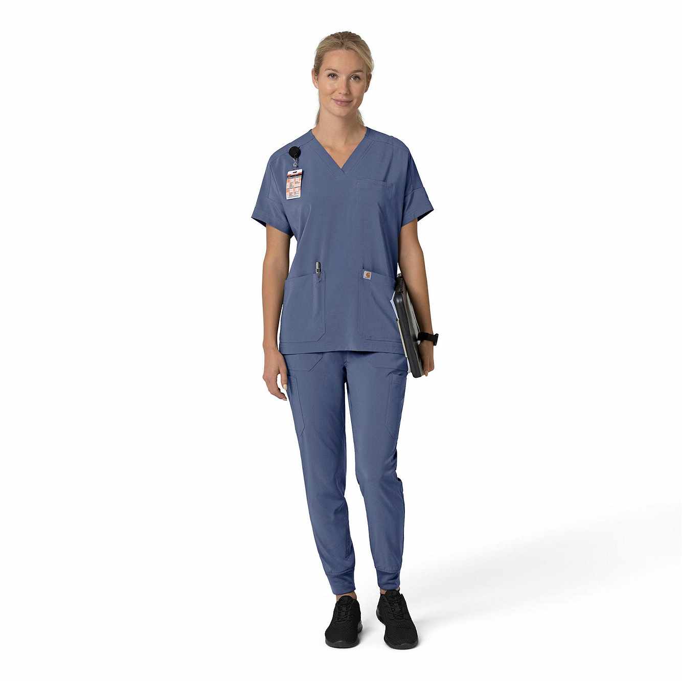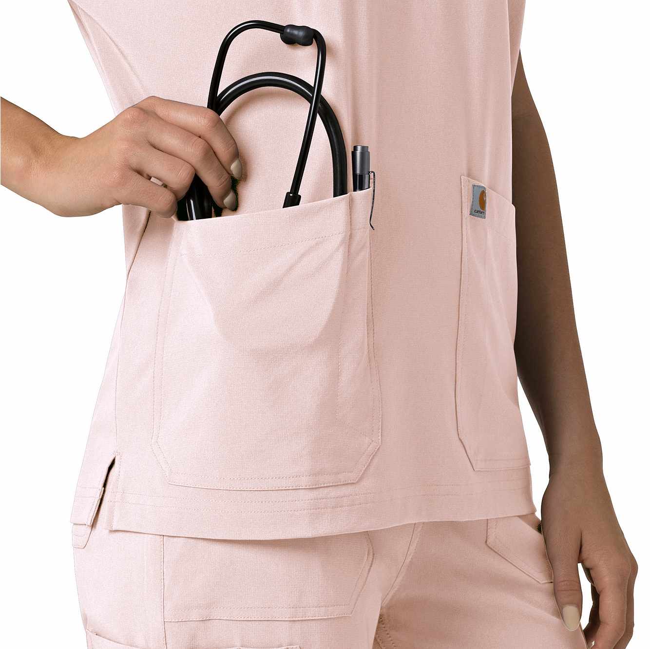 Step into your workday with confidence in the Carhartt Women's Oversized V-Neck Scrub Top. Engineered for healthcare professionals, this scrub top combines style and functionality. The curved V-neck with slim binding and a shoulder badge loop adds a touch of sophistication, while the vented yoke ensures breathability during long shifts. Practicality meets convenience with features like a welt chest pocket, two front top load pockets, a mesh cellphone pocket, and a pen slot. The racerback detail and box pleat at the back provide ease of movement, ensuring you're ready for any task. The straight hem at the front and slightly curved back, along with side vents, create a flattering silhouette. Crafted from a durable and comfortable polyester-spandex blend, this scrub top is not only reliable but also equipped with FastDry® technology to keep you dry under pressure. Elevate your professional look and excel on every shift with Carhartt's Force Cross-Flex collection.