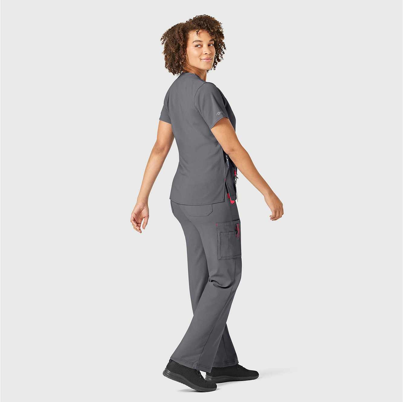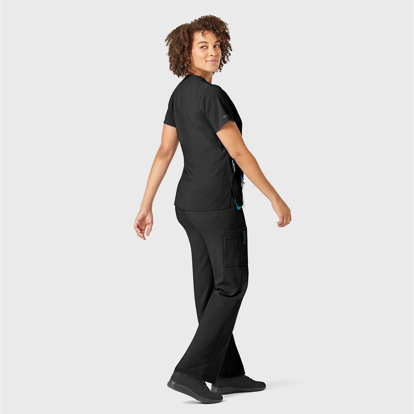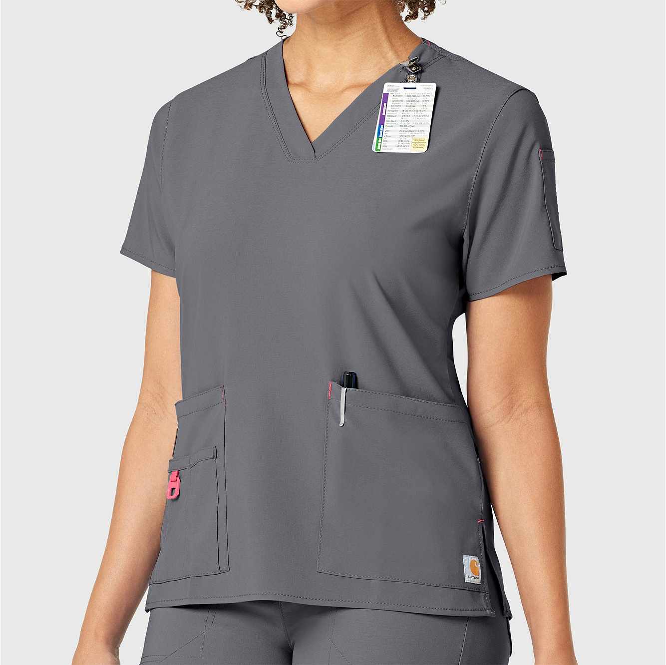 Stay connected and ready for the demands of your shift in this women's V-neck scrub top. The polyester blend is built for mobility and stain resistance to keep you clean and presentable all shift long. A dedicated media pocket includes routing for earbuds to keep cords safely out of the way. Easy access front pockets keep essentials close at hand.