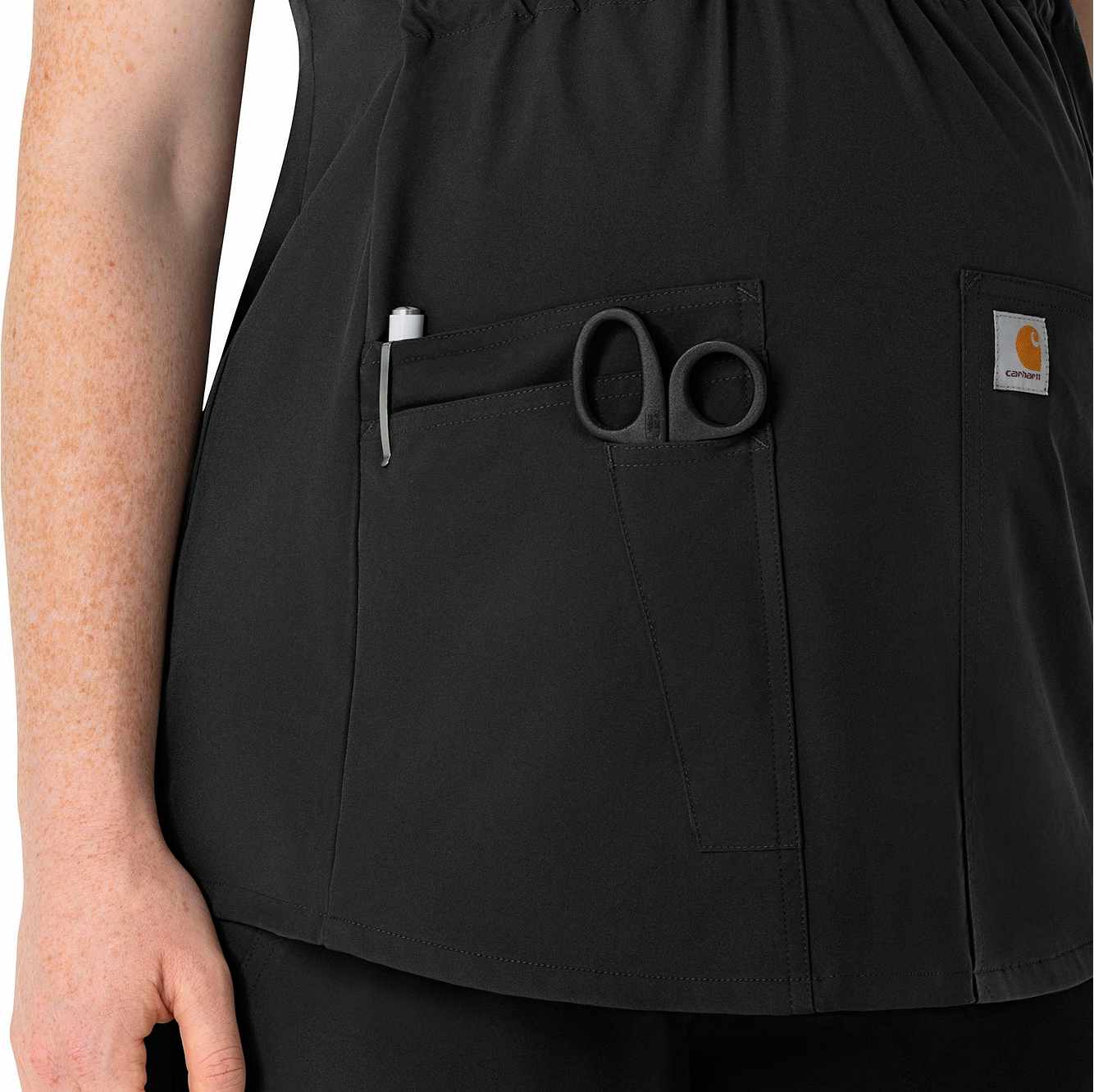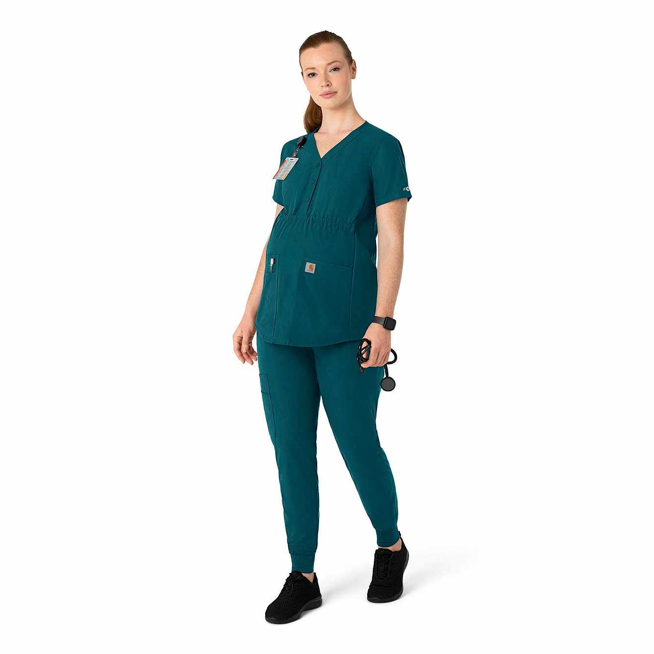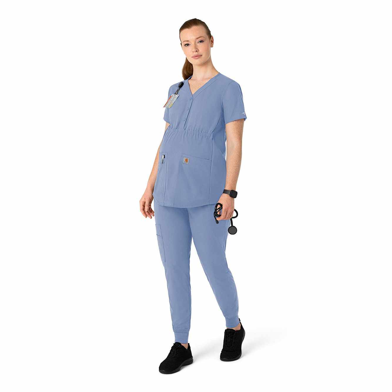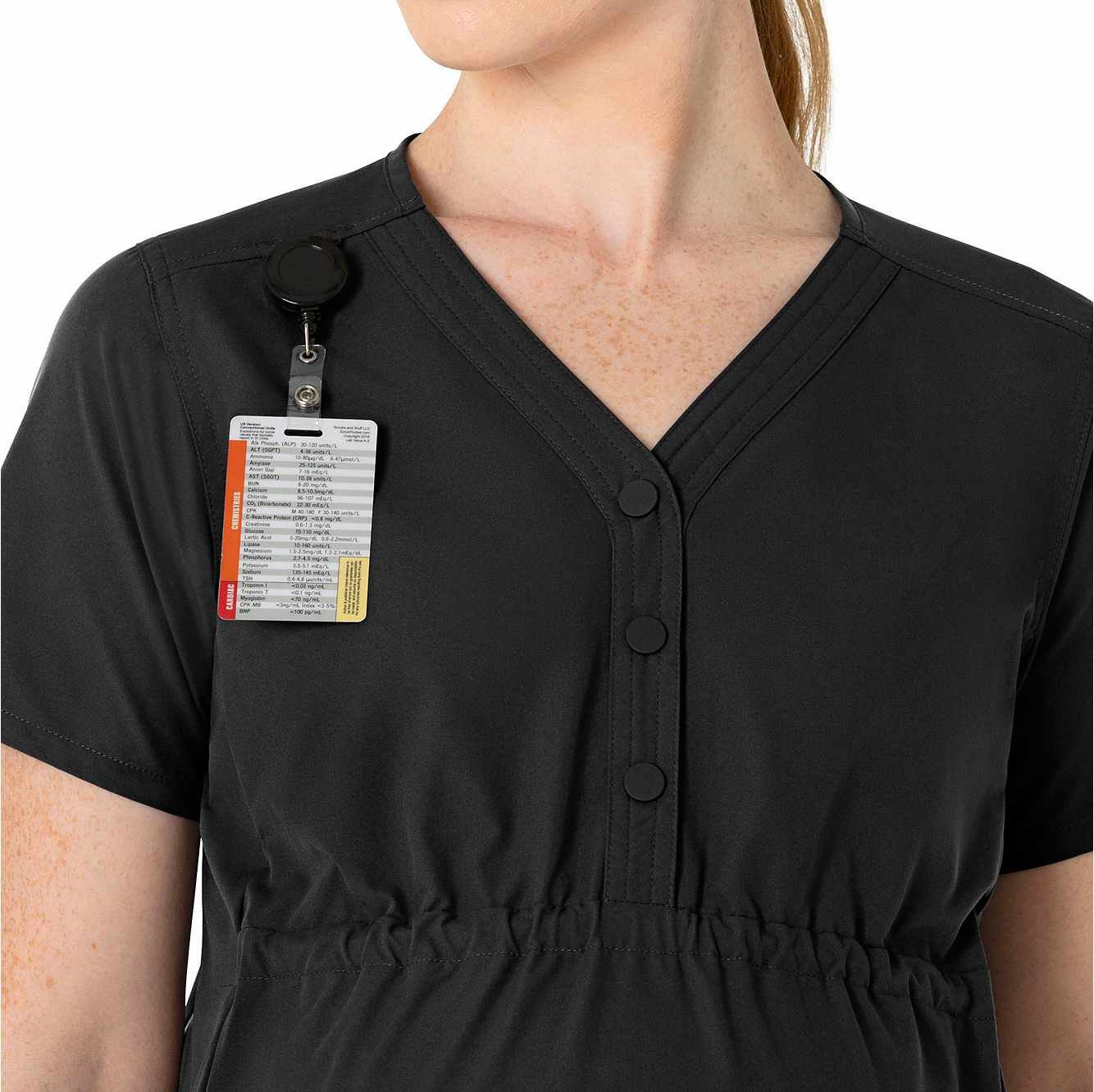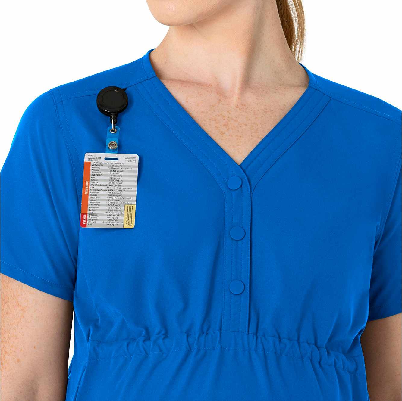 This maternity scrub top simplifies your life so your focus stays sharp and your comfort stays strong while you're expecting. It's designed with all the features you need for practical wear at work, like two oversized top-loading front pockets that take care of larger essentials and daily must-haves. Slip your phone into a smaller mesh pocket built right in, so you always know where it is and have easy access when you need to check in. A scissor pocket on your right keeps that must-have tool in place, and a loop on the shoulder displays your badge while making sure it stays out of your way as you're attending to patients or answering calls. Adjust the elastic on the empire waist to get the fit you want as your belly grows. A curved hem creates a well-rounded silhouette, and a Henley neckline with a snap-button placket finishes the look in tailored style. This scrub top is designed with technologies that help you to perform at your very best. It wicks sweat, dries fast and resists stains, so you stay looking and feeling professional all through your shift.
