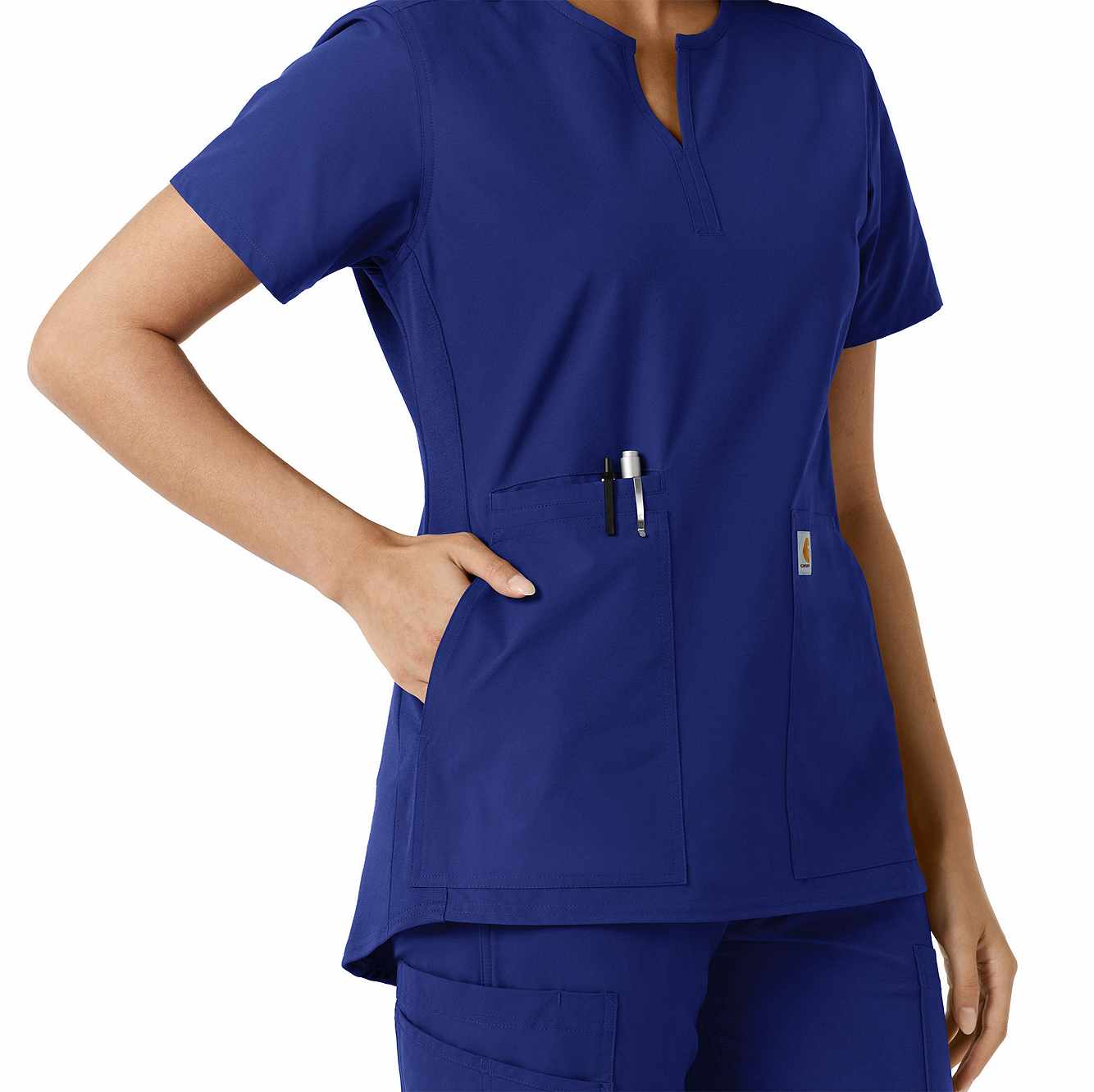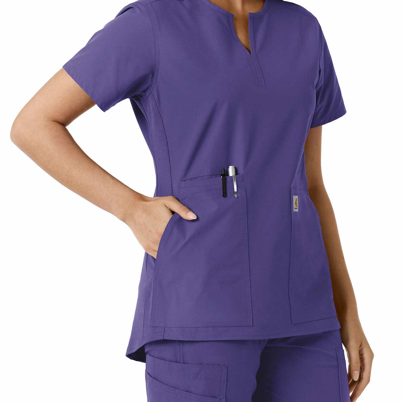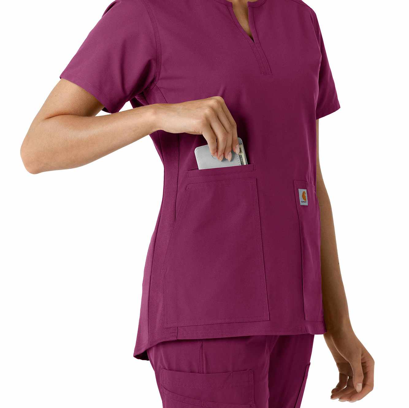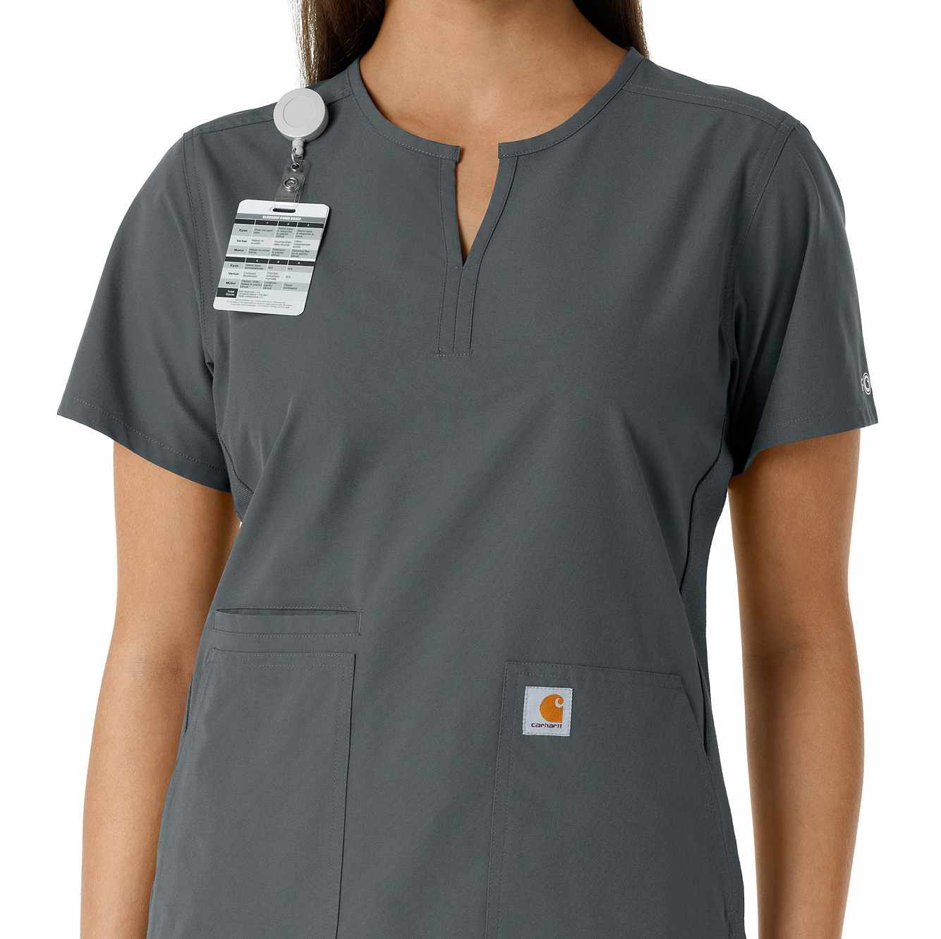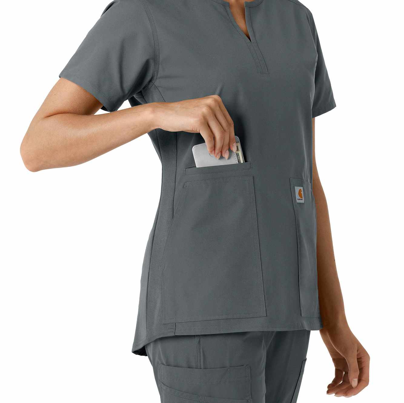 Designed for busy shifts, this Carhartt scrub top offers a polished look with unbeatable comfort. Made from a durable, lightweight polyester blend, it features Rugged Flex® stretch and knit side panels for easy movement, plus FastDry® and Stain Breaker® technologies to keep you cool and clean. Large pockets, a hidden phone pocket, and a badge ID loop make it practical, while princess seams and a curved hem add a professional finish. Perfect for those who need both style and performance on the job.
