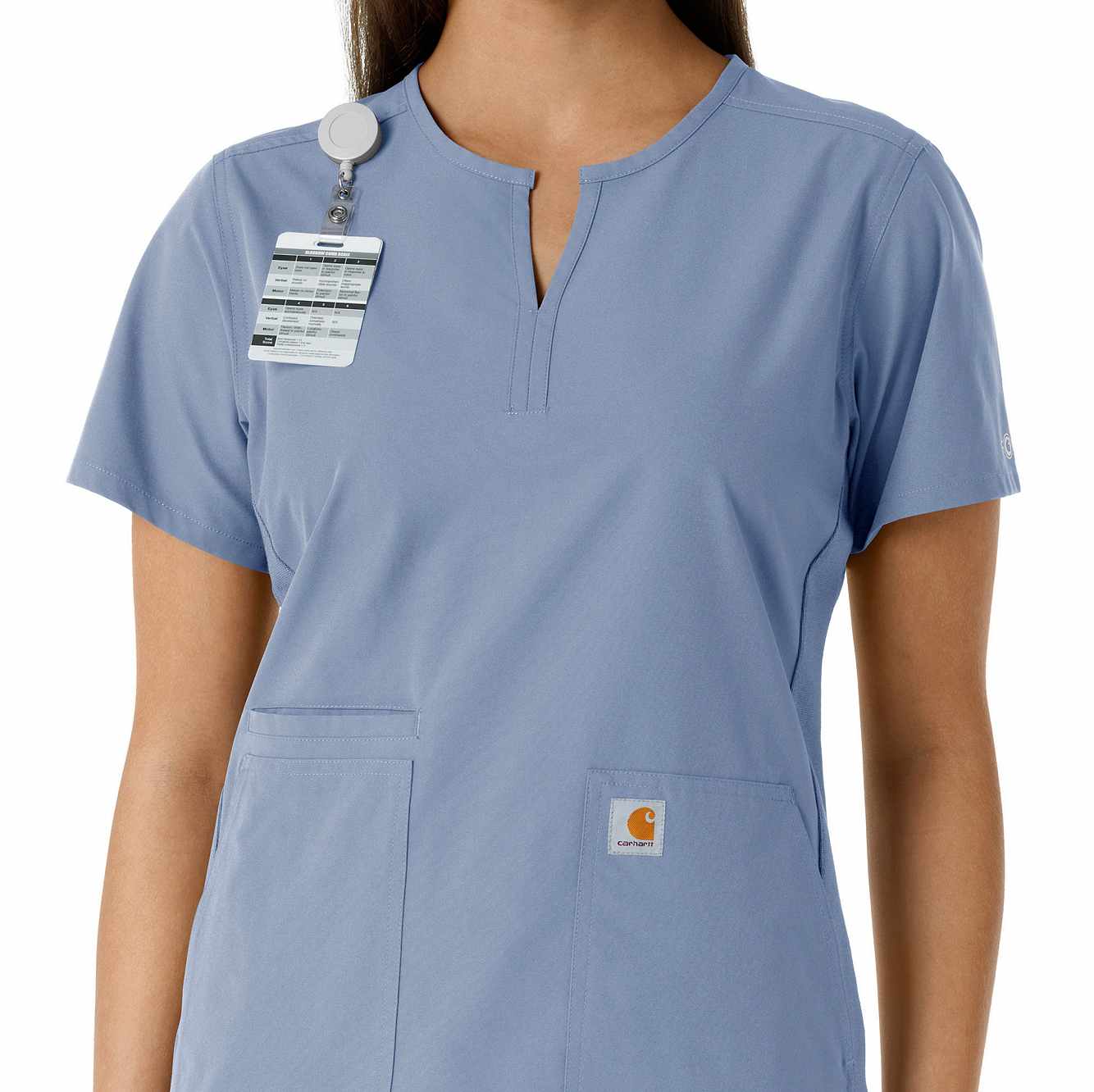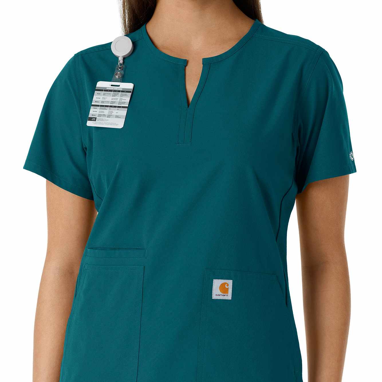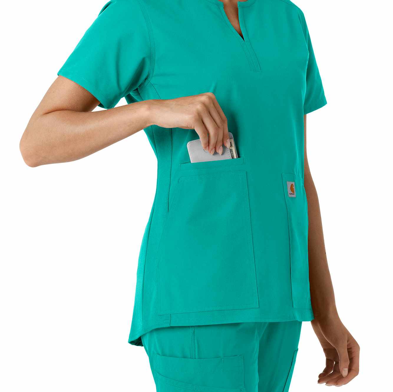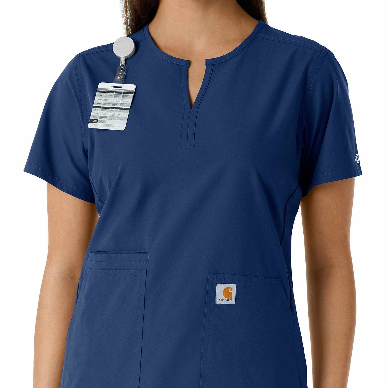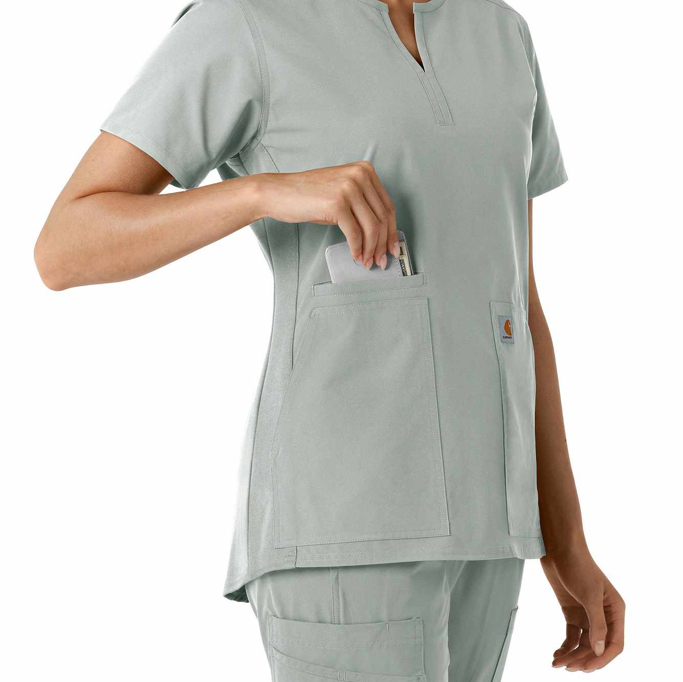 Designed for busy shifts, this Carhartt scrub top offers a polished look with unbeatable comfort. Made from a durable, lightweight polyester blend, it features Rugged Flex® stretch and knit side panels for easy movement, plus FastDry® and Stain Breaker® technologies to keep you cool and clean. Large pockets, a hidden phone pocket, and a badge ID loop make it practical, while princess seams and a curved hem add a professional finish. Perfect for those who need both style and performance on the job.