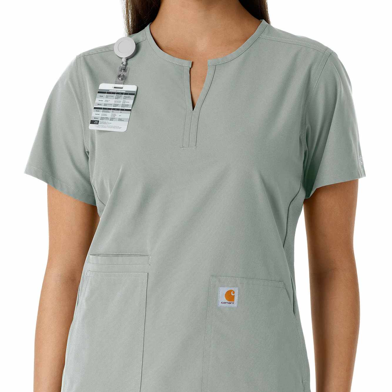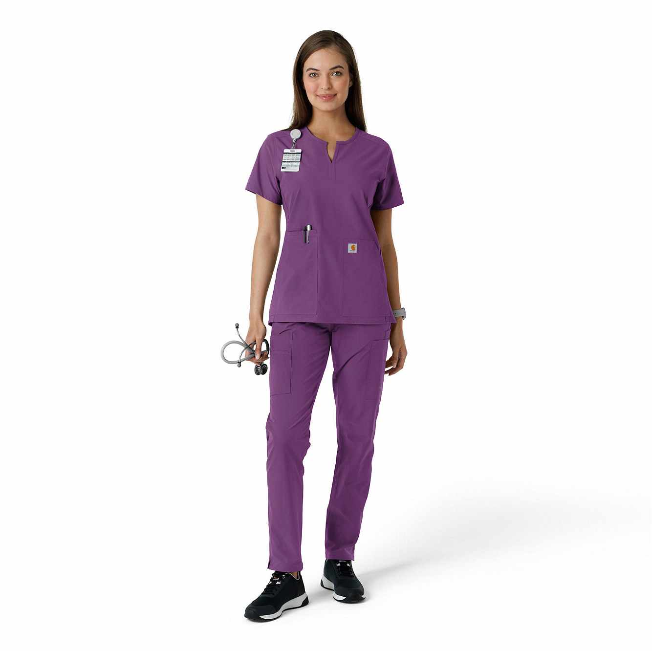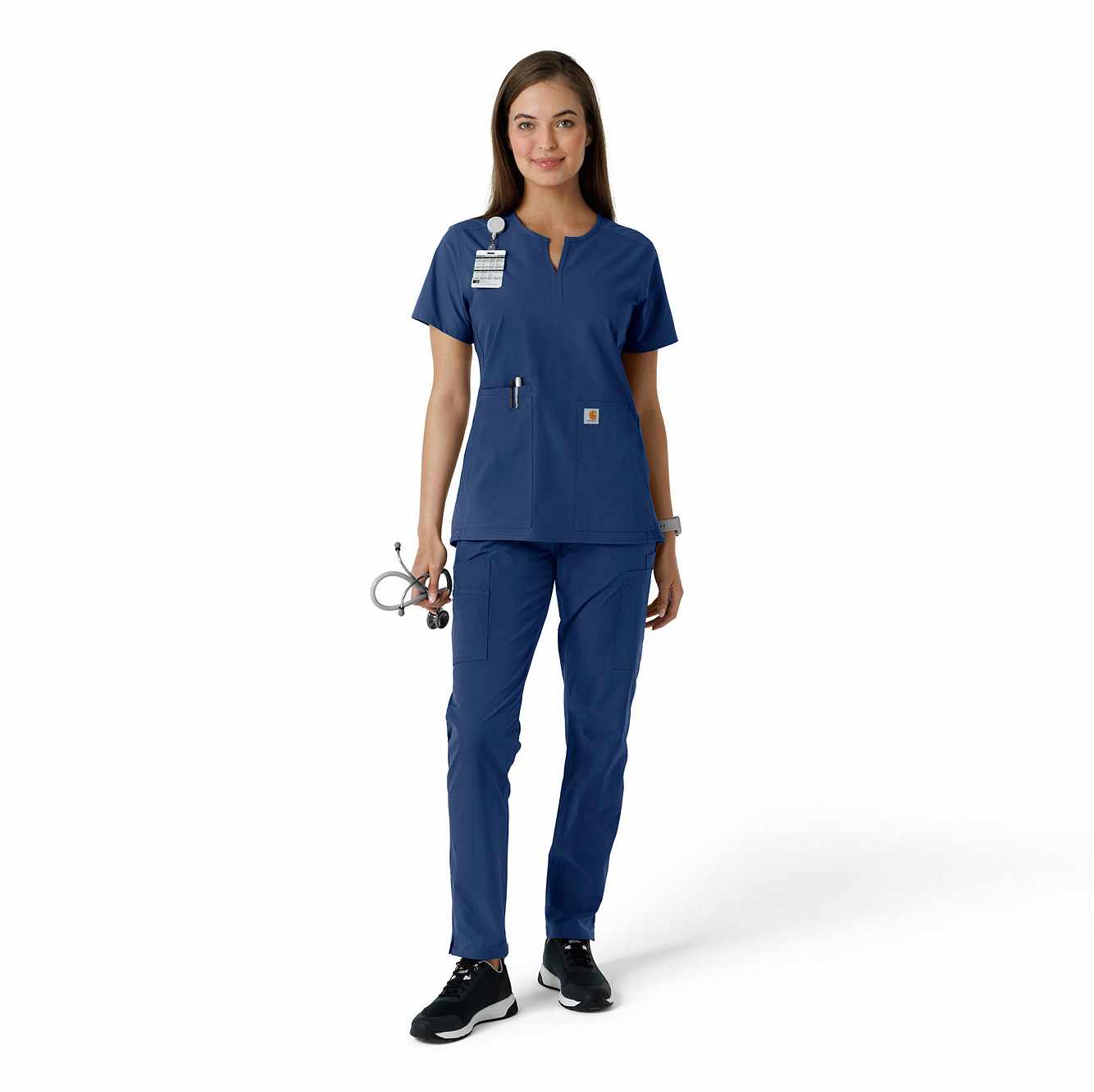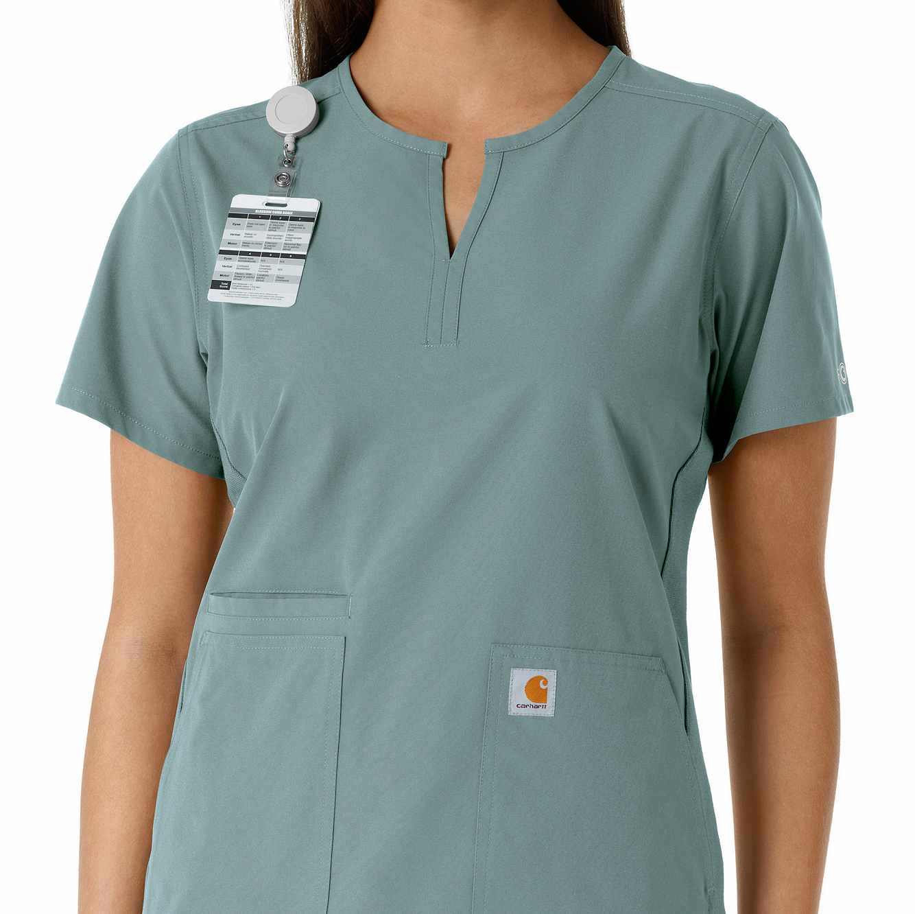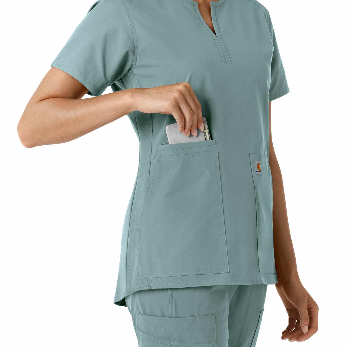 Designed for busy shifts, this Carhartt scrub top offers a polished look with unbeatable comfort. Made from a durable, lightweight polyester blend, it features Rugged Flex® stretch and knit side panels for easy movement, plus FastDry® and Stain Breaker® technologies to keep you cool and clean. Large pockets, a hidden phone pocket, and a badge ID loop make it practical, while princess seams and a curved hem add a professional finish. Perfect for those who need both style and performance on the job.