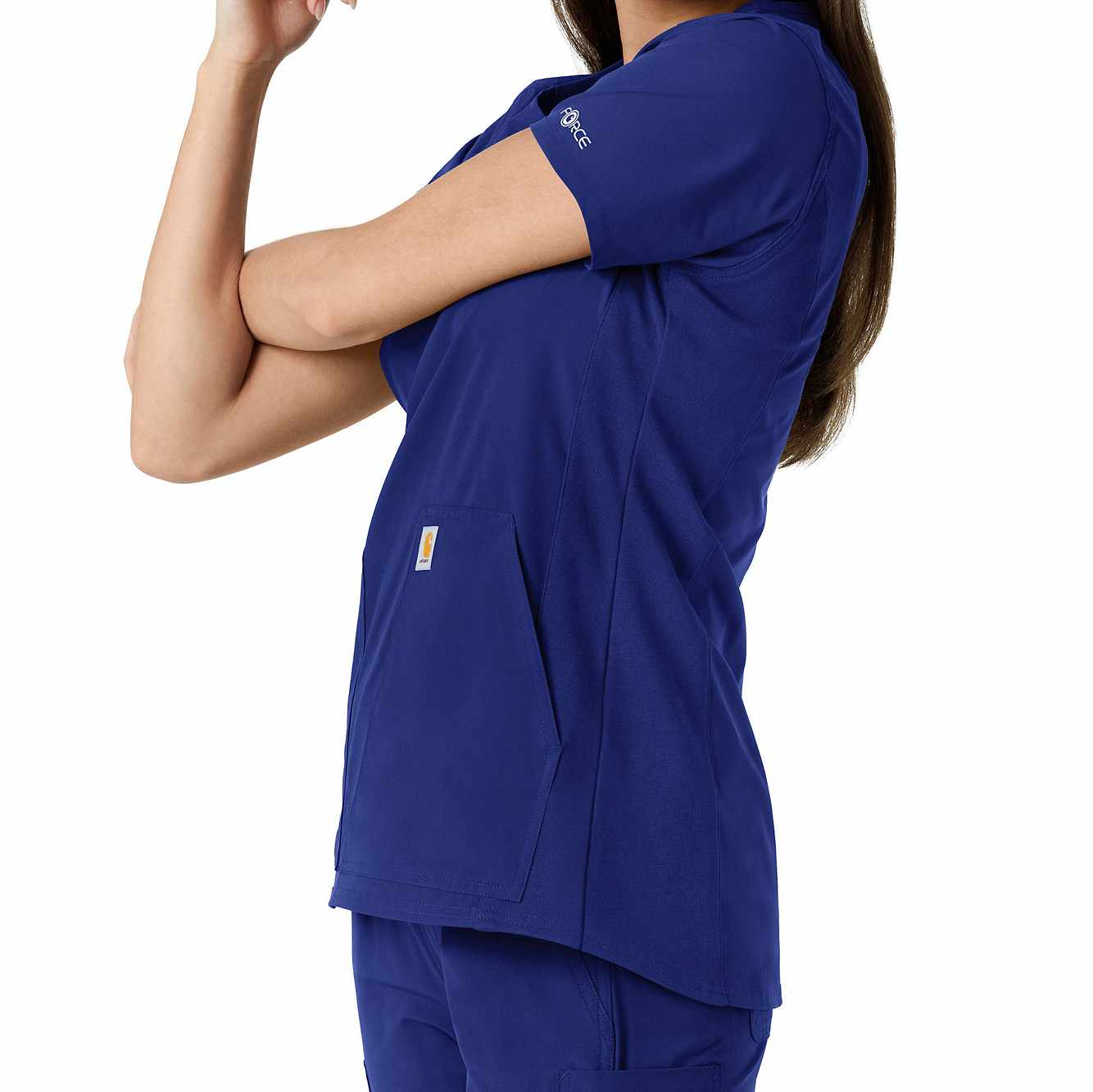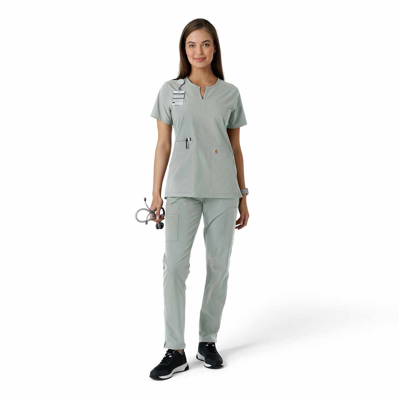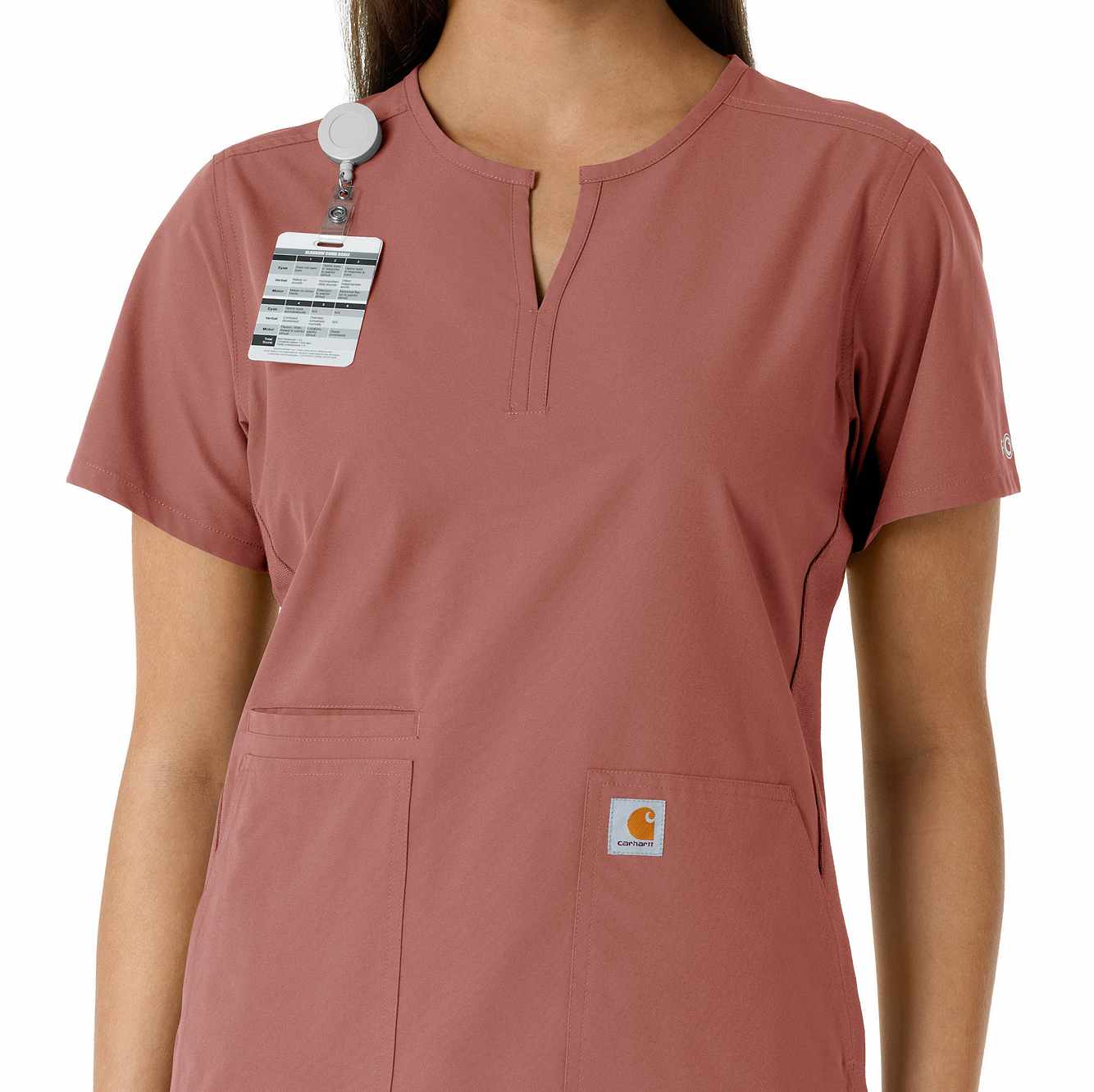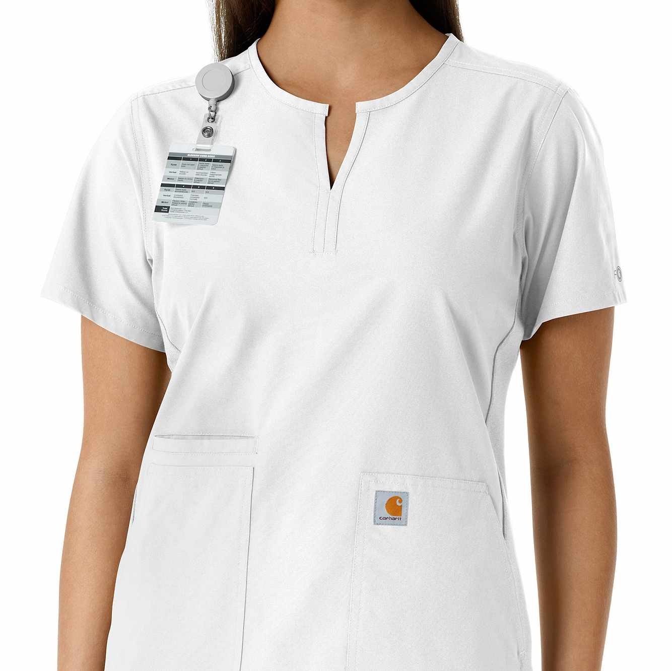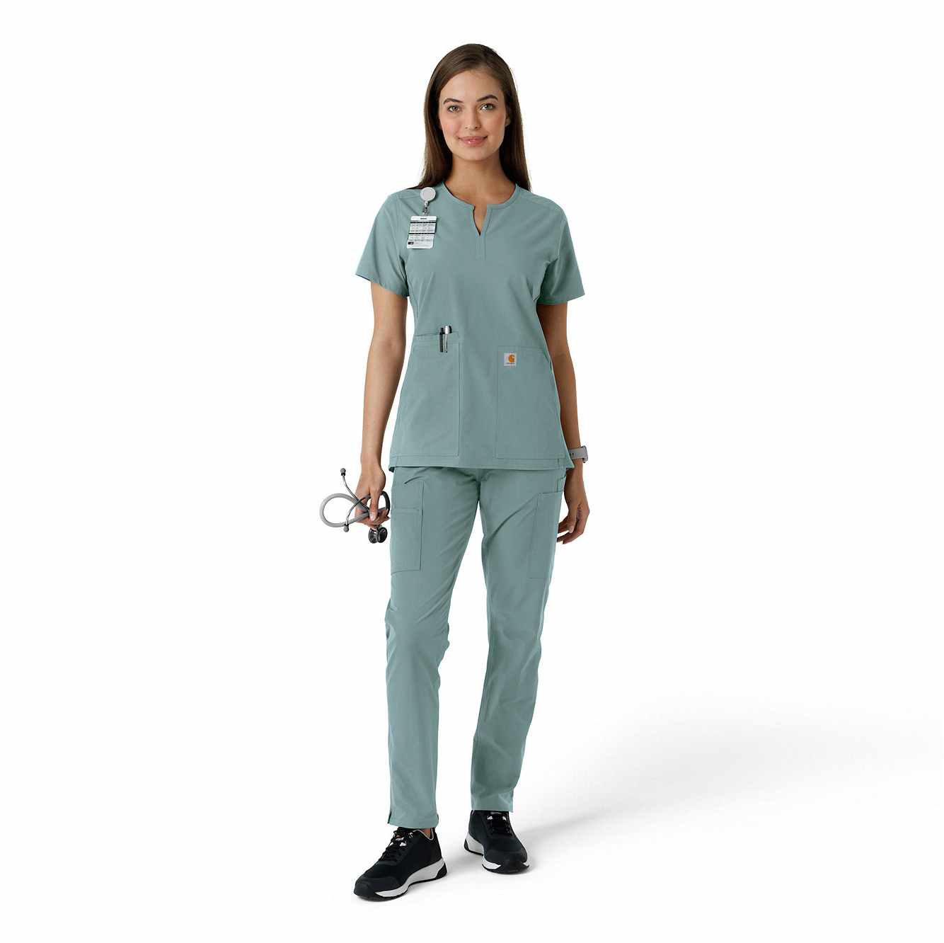 Designed for busy shifts, this Carhartt scrub top offers a polished look with unbeatable comfort. Made from a durable, lightweight polyester blend, it features Rugged Flex® stretch and knit side panels for easy movement, plus FastDry® and Stain Breaker® technologies to keep you cool and clean. Large pockets, a hidden phone pocket, and a badge ID loop make it practical, while princess seams and a curved hem add a professional finish. Perfect for those who need both style and performance on the job.