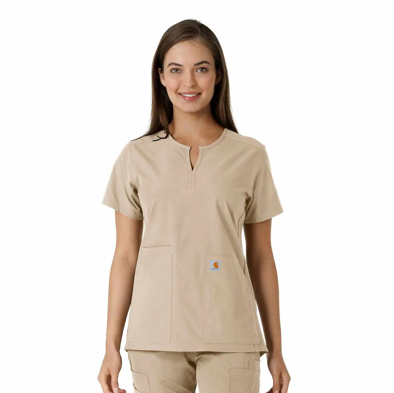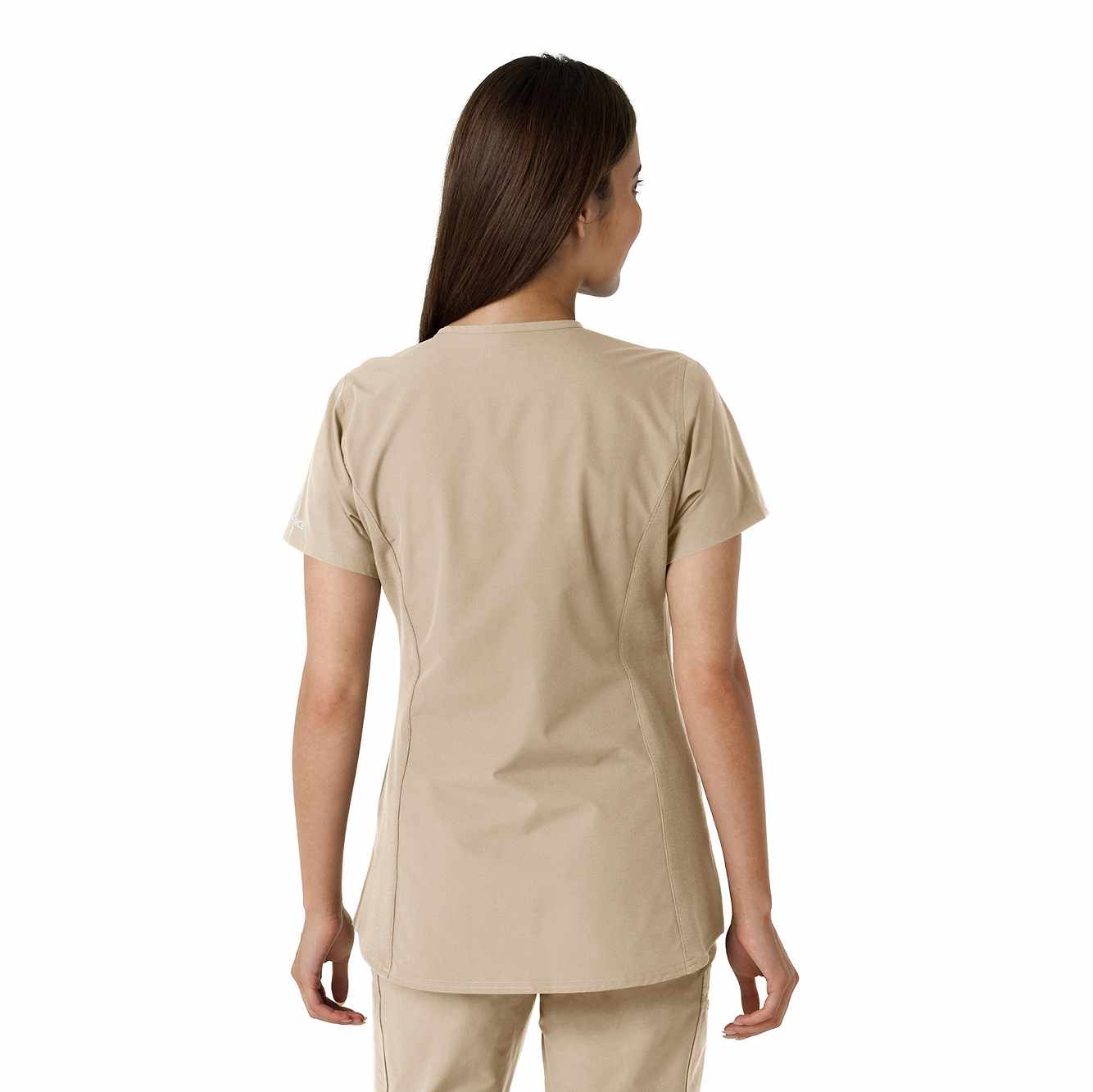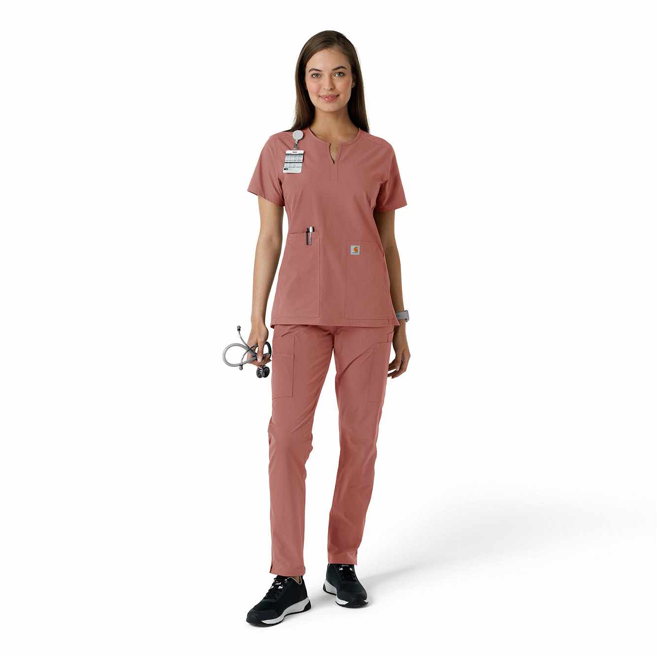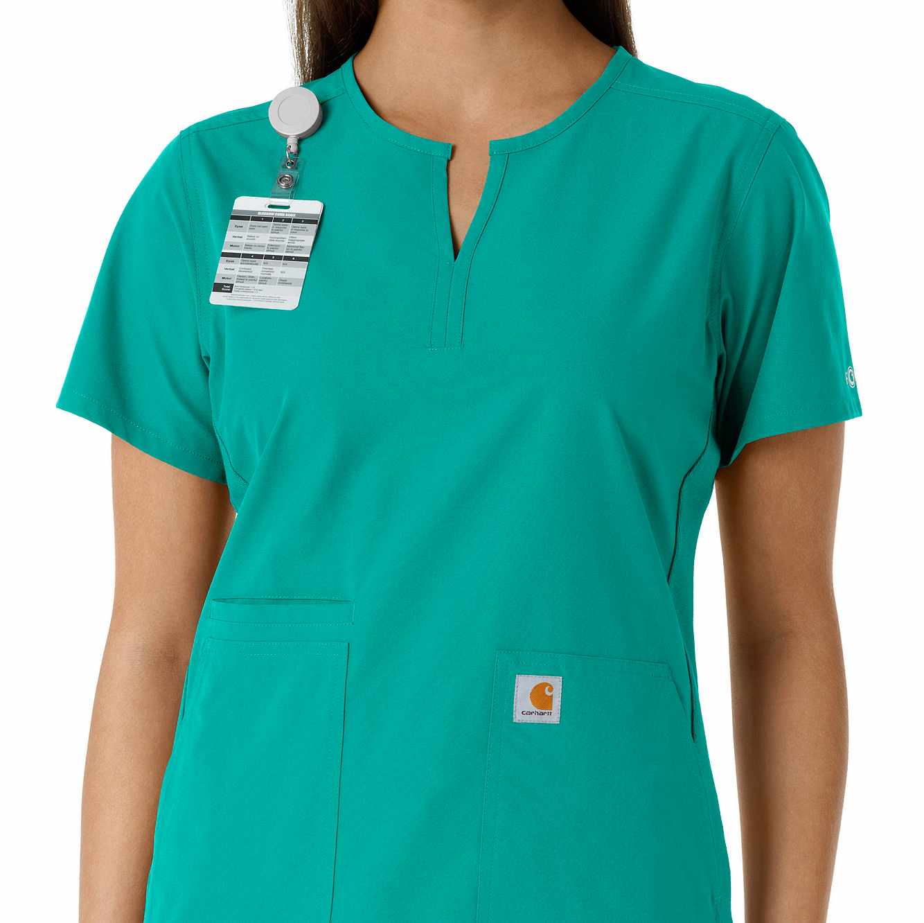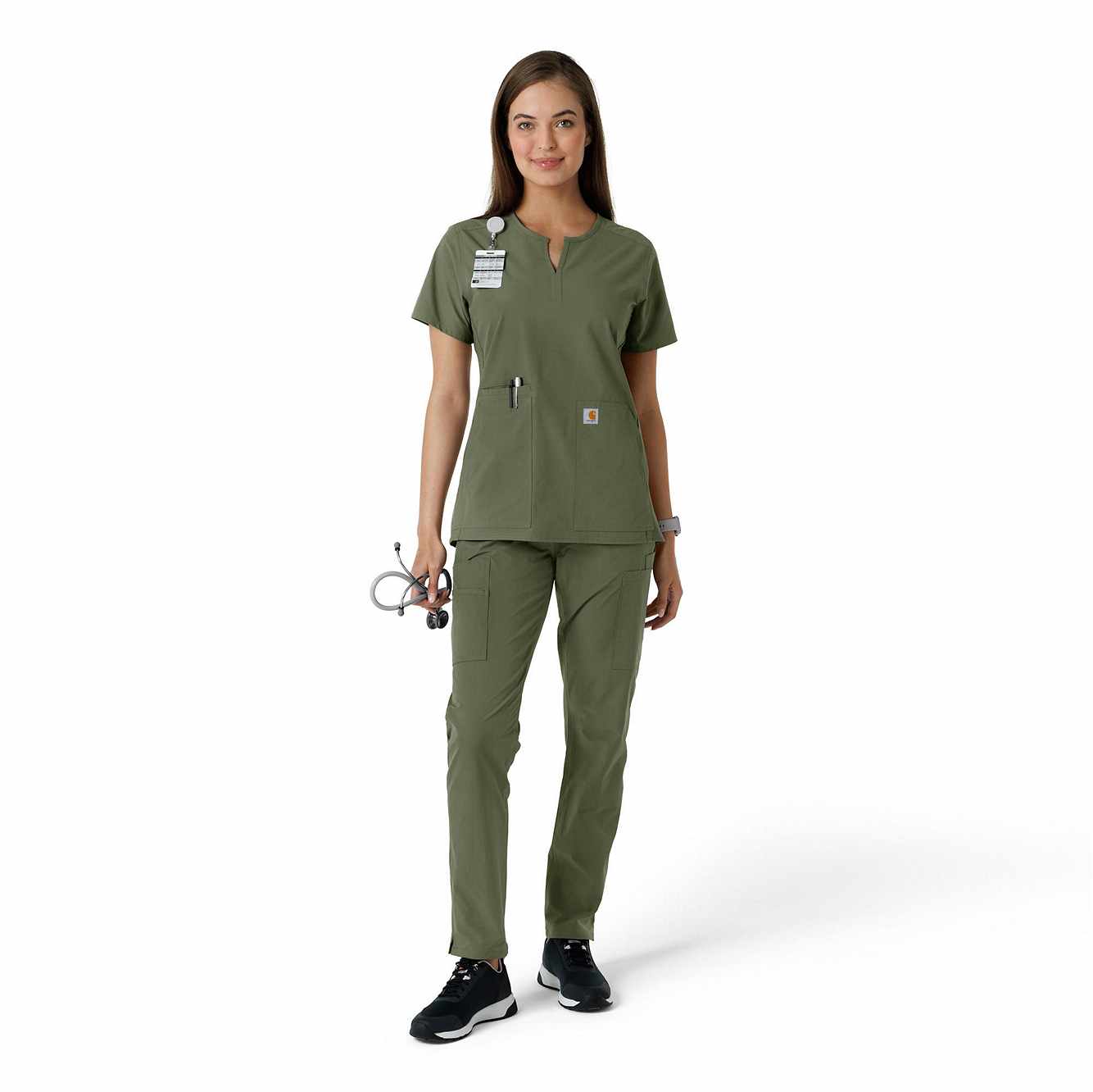 Designed for busy shifts, this Carhartt scrub top offers a polished look with unbeatable comfort. Made from a durable, lightweight polyester blend, it features Rugged Flex® stretch and knit side panels for easy movement, plus FastDry® and Stain Breaker® technologies to keep you cool and clean. Large pockets, a hidden phone pocket, and a badge ID loop make it practical, while princess seams and a curved hem add a professional finish. Perfect for those who need both style and performance on the job.