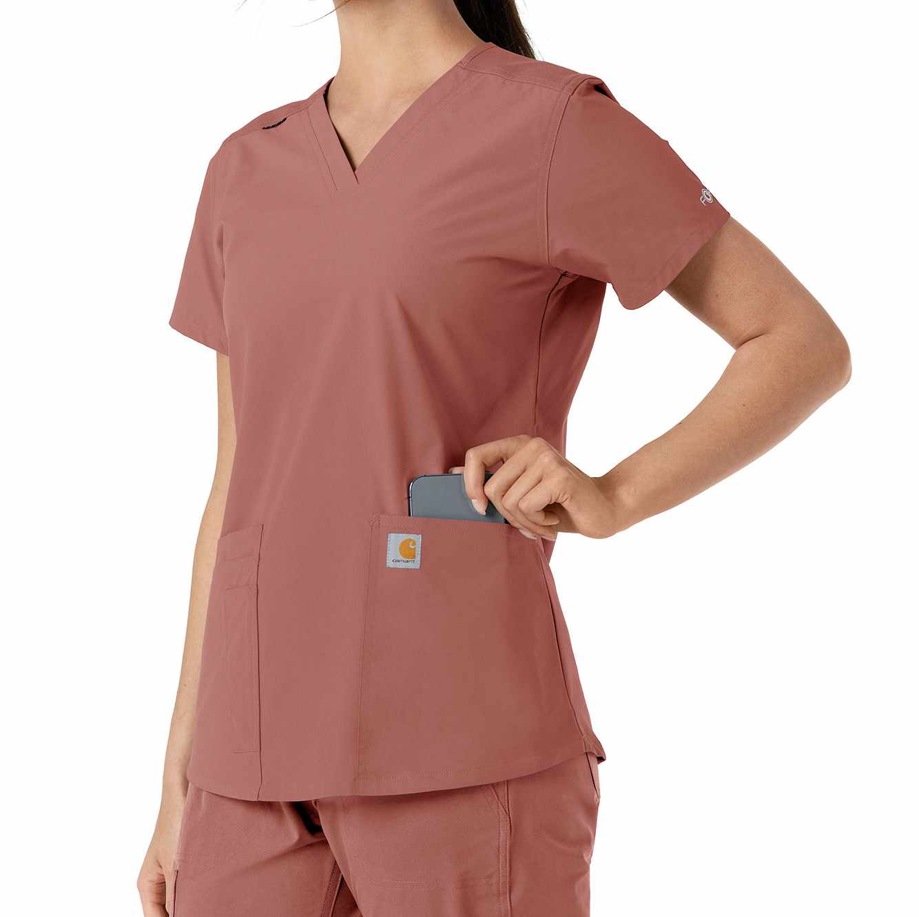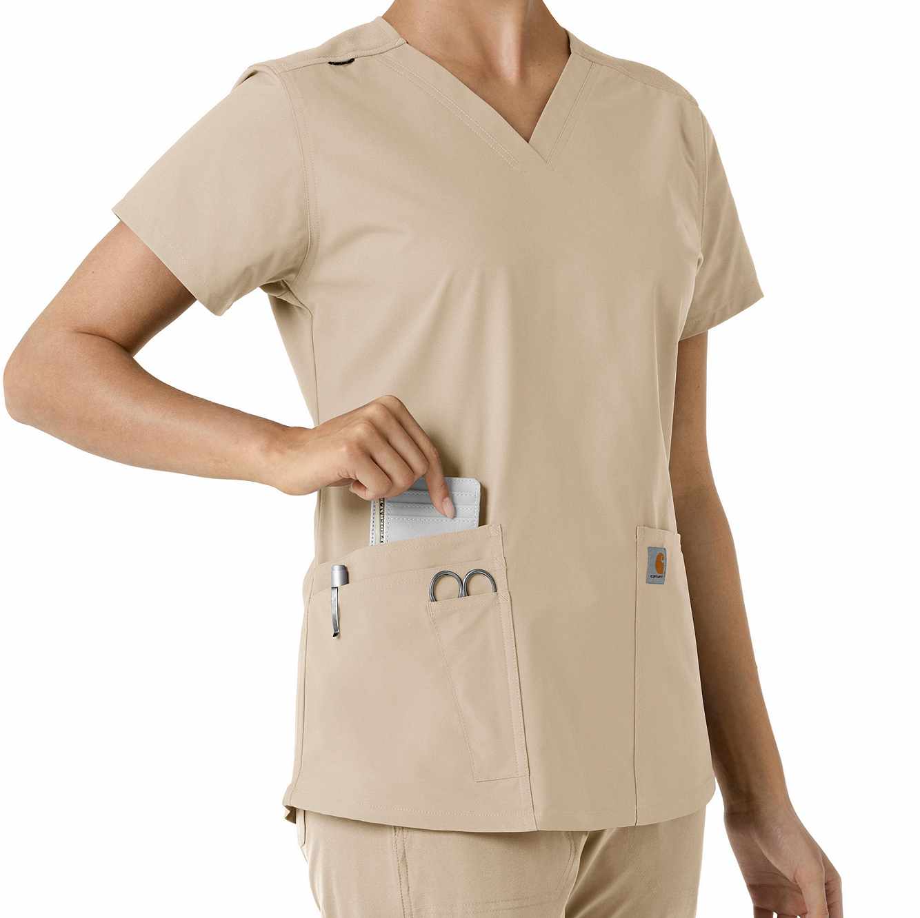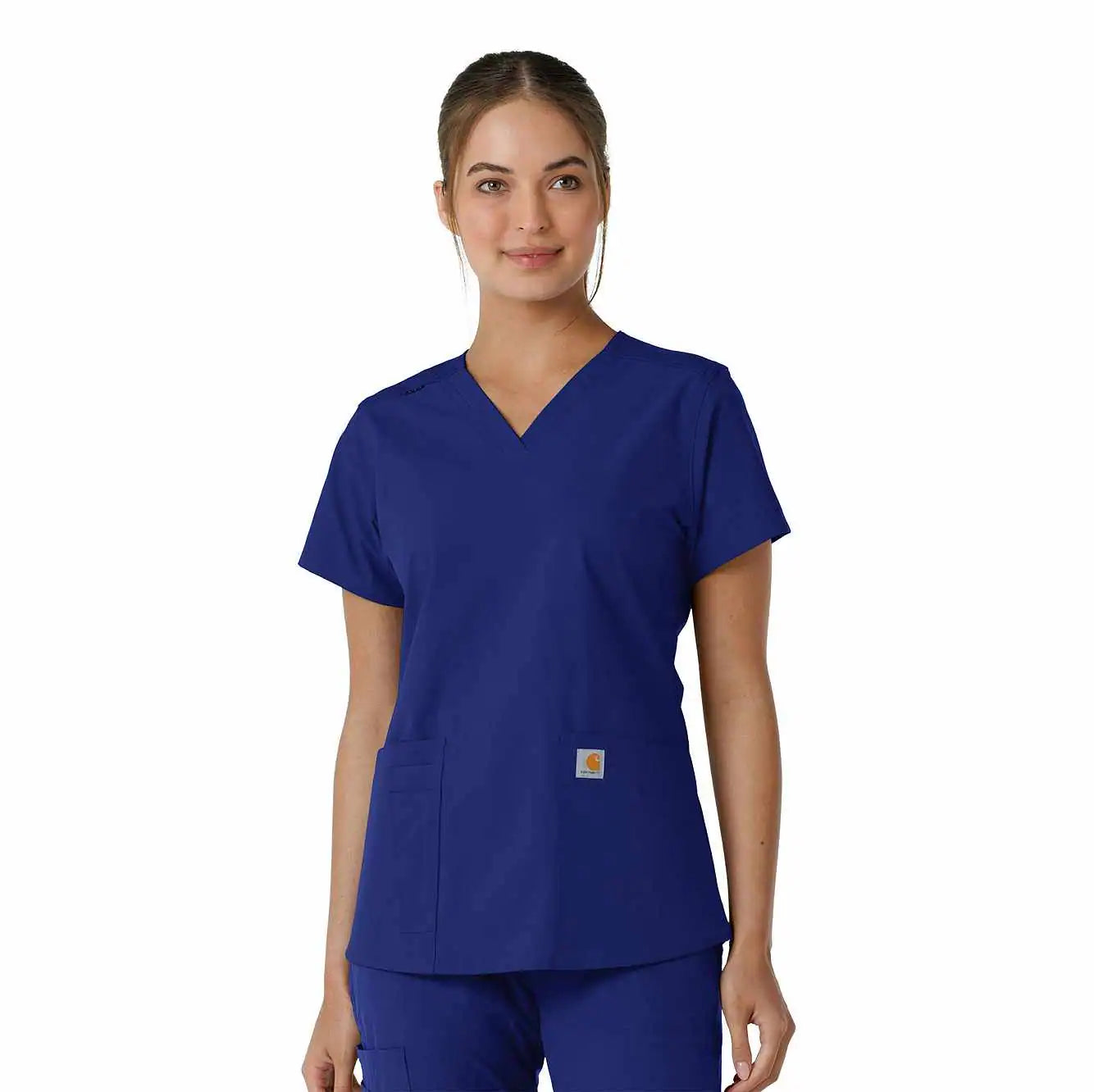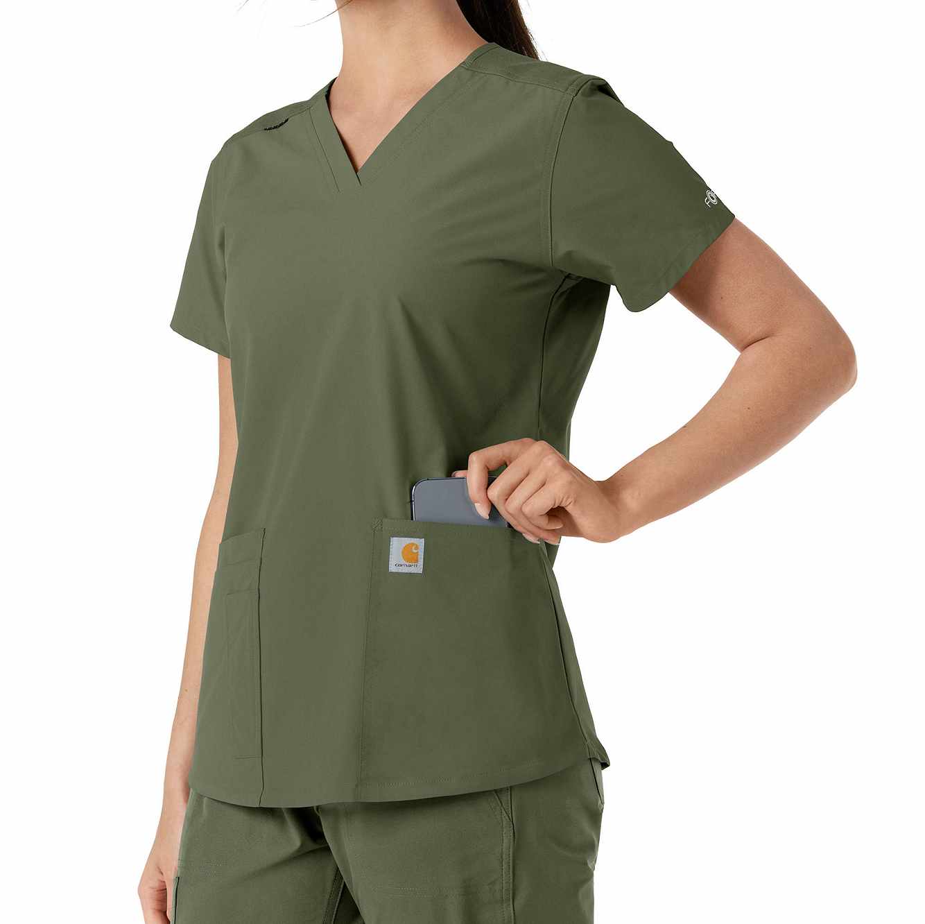 Stay comfortable and move freely with the Carhartt Force Essentials Women's V-neck Scrub Top. Featuring a back yoke knit panel, this top offers flexibility and a tailored fit with a 3/4" V-neckline and curved hem. FastDry® tech wicks away sweat, and Stain Breaker® makes stain removal easy. With two roomy front pockets, an ID badge loop, and dedicated cell phone and scissor pockets, it's built for utility and comfort.
