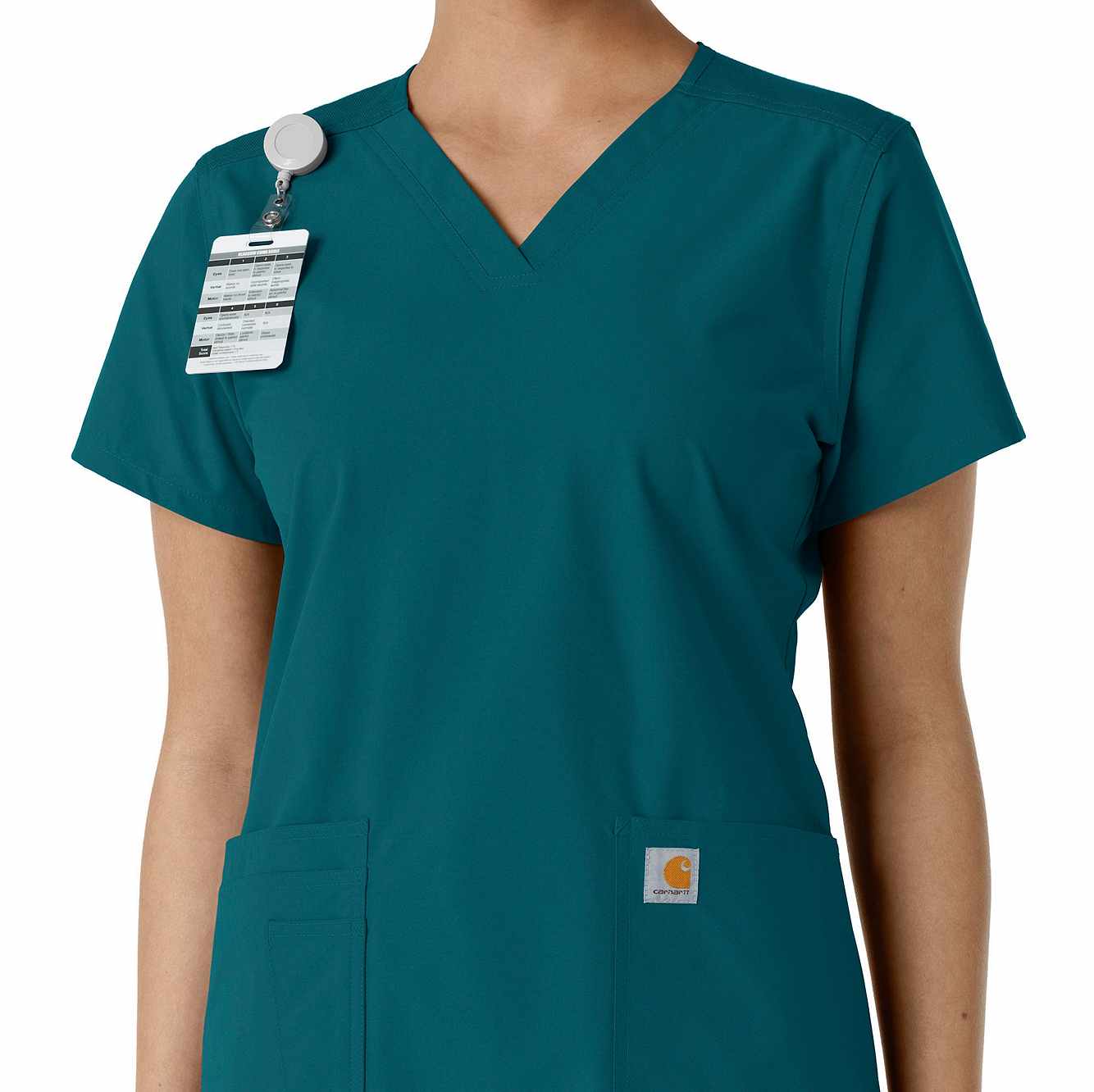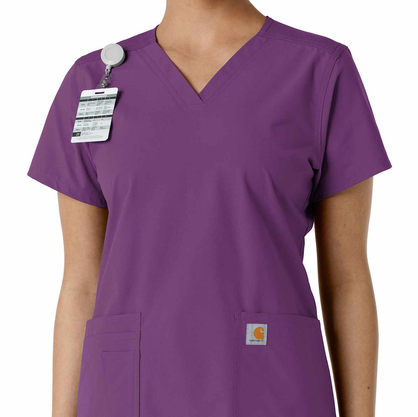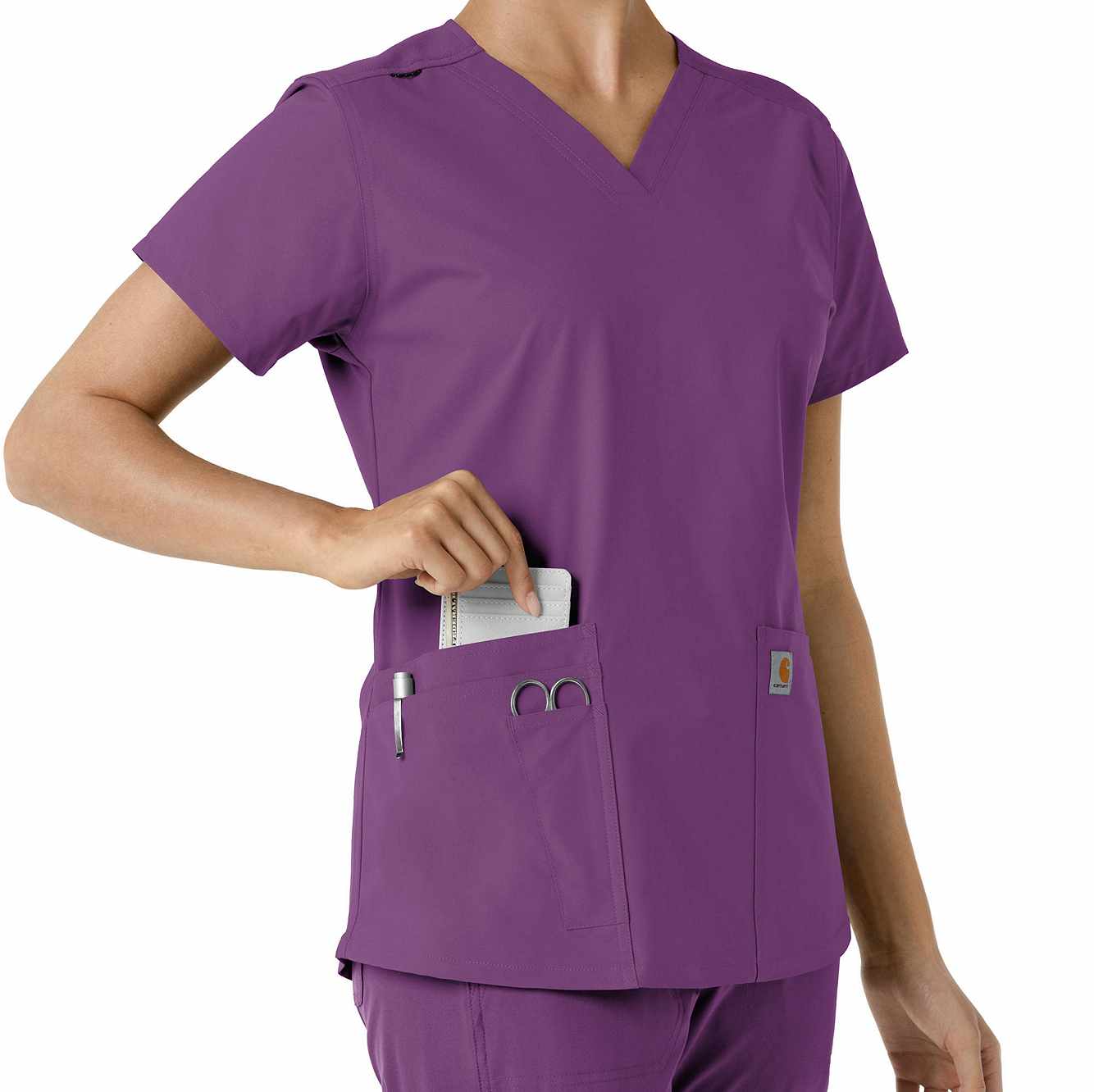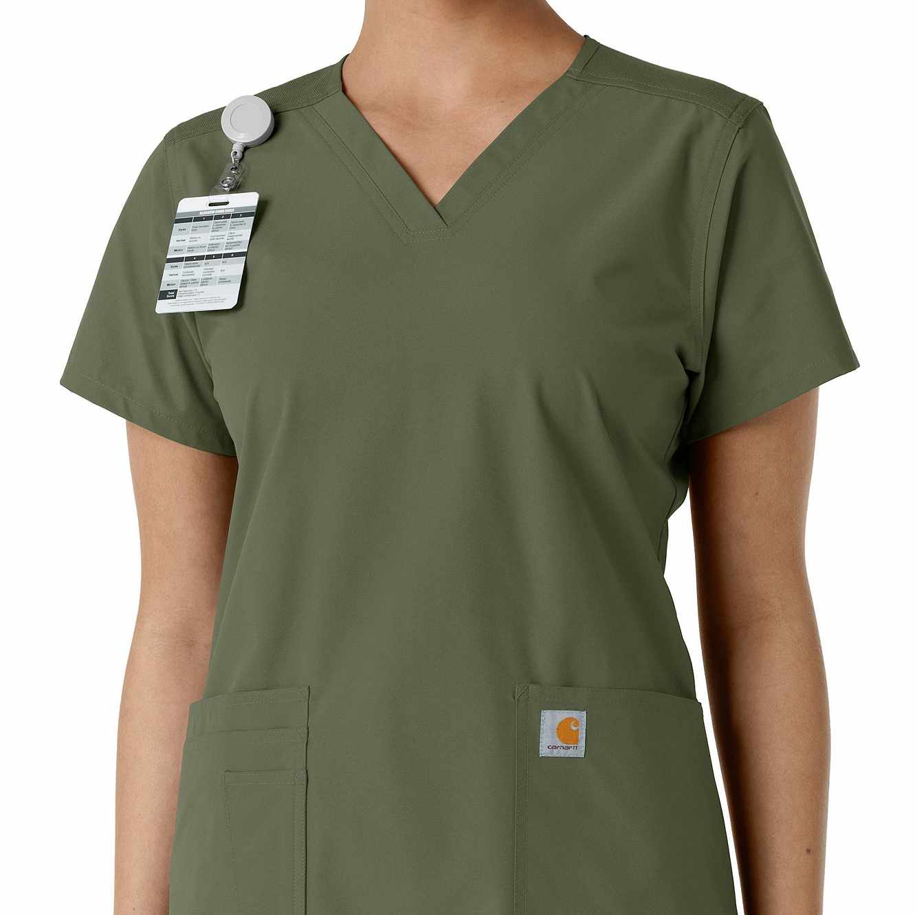 Stay comfortable and move freely with the Carhartt Force Essentials Women's V-neck Scrub Top. Featuring a back yoke knit panel, this top offers flexibility and a tailored fit with a 3/4" V-neckline and curved hem. FastDry® tech wicks away sweat, and Stain Breaker® makes stain removal easy. With two roomy front pockets, an ID badge loop, and dedicated cell phone and scissor pockets, it's built for utility and comfort.