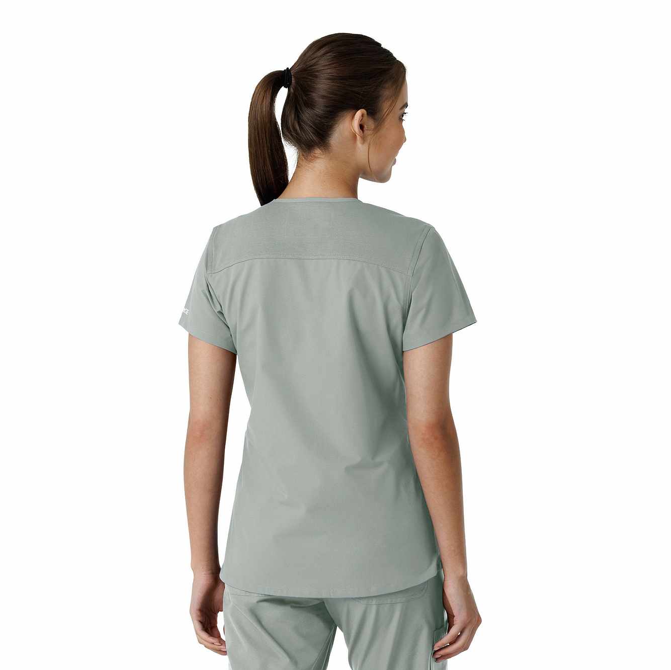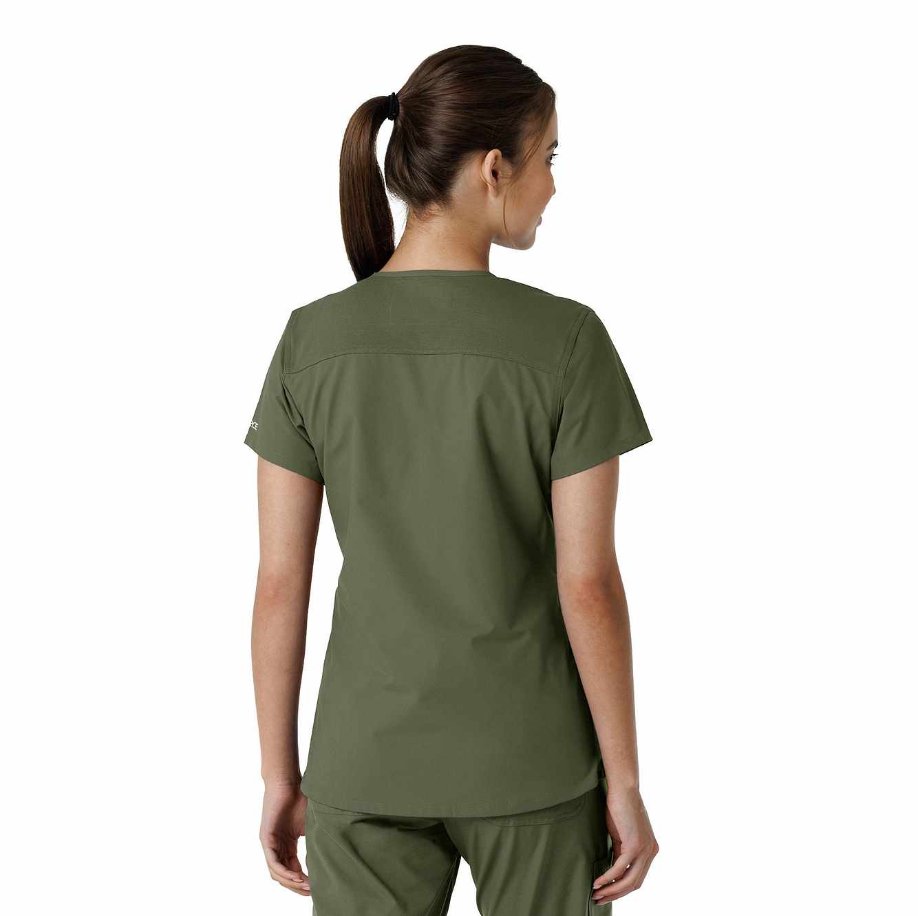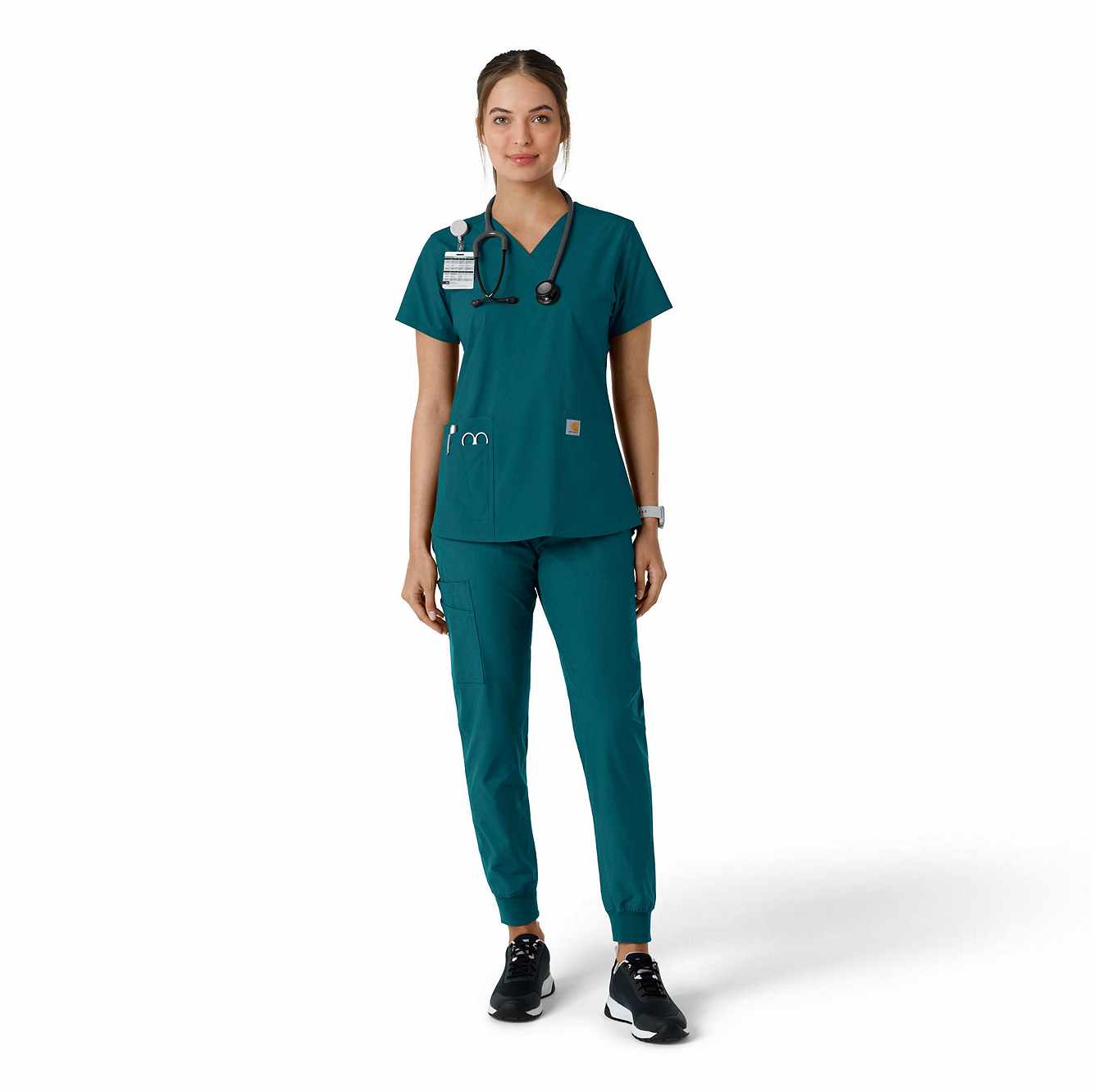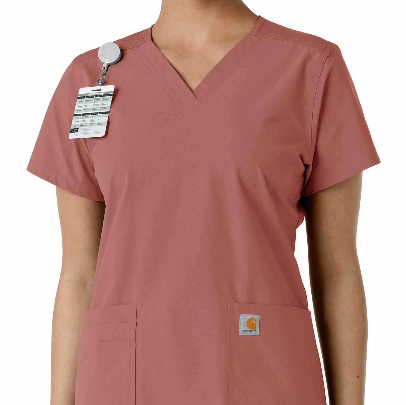 Stay comfortable and move freely with the Carhartt Force Essentials Women's V-neck Scrub Top. Featuring a back yoke knit panel, this top offers flexibility and a tailored fit with a 3/4" V-neckline and curved hem. FastDry® tech wicks away sweat, and Stain Breaker® makes stain removal easy. With two roomy front pockets, an ID badge loop, and dedicated cell phone and scissor pockets, it's built for utility and comfort.